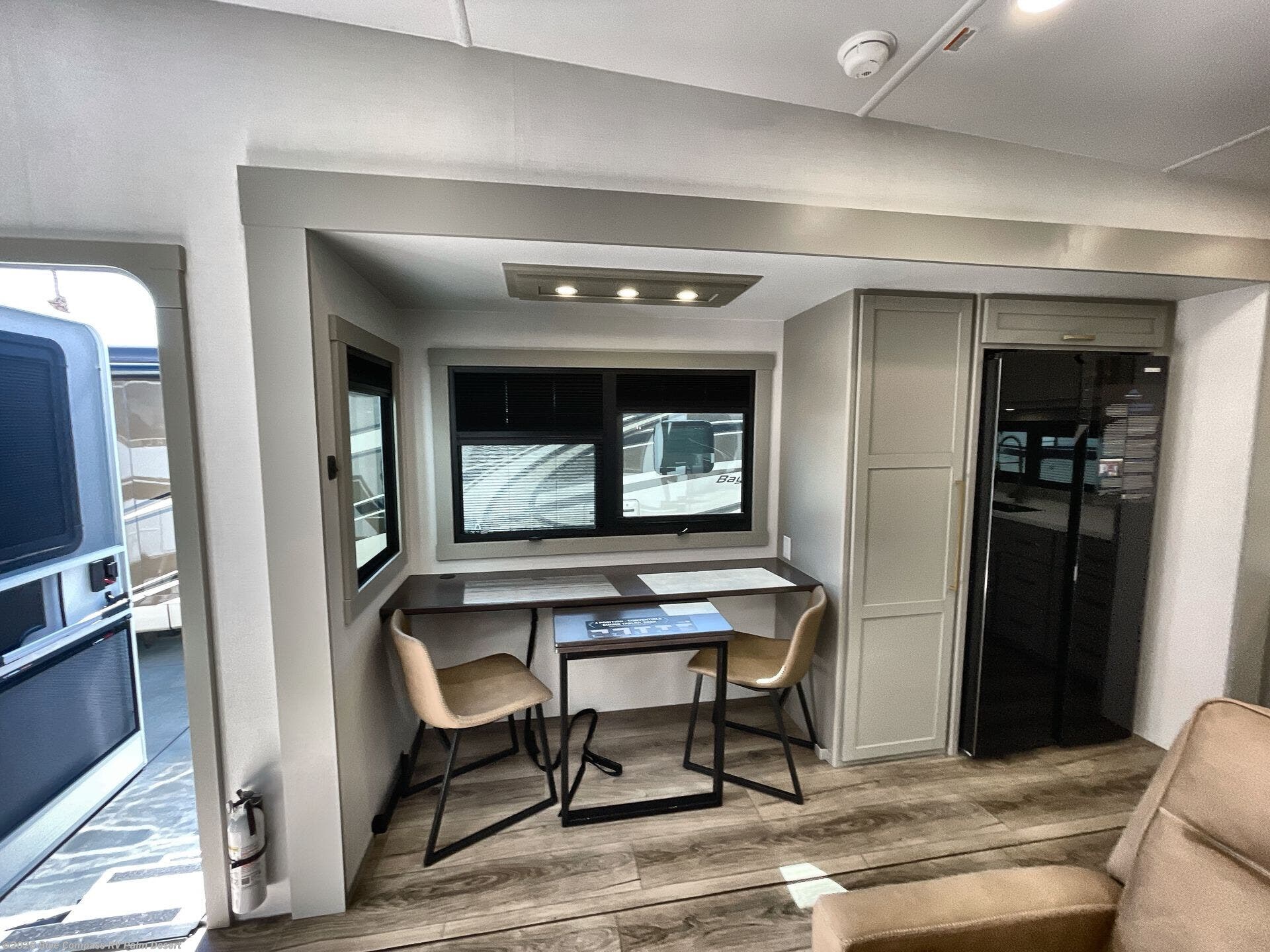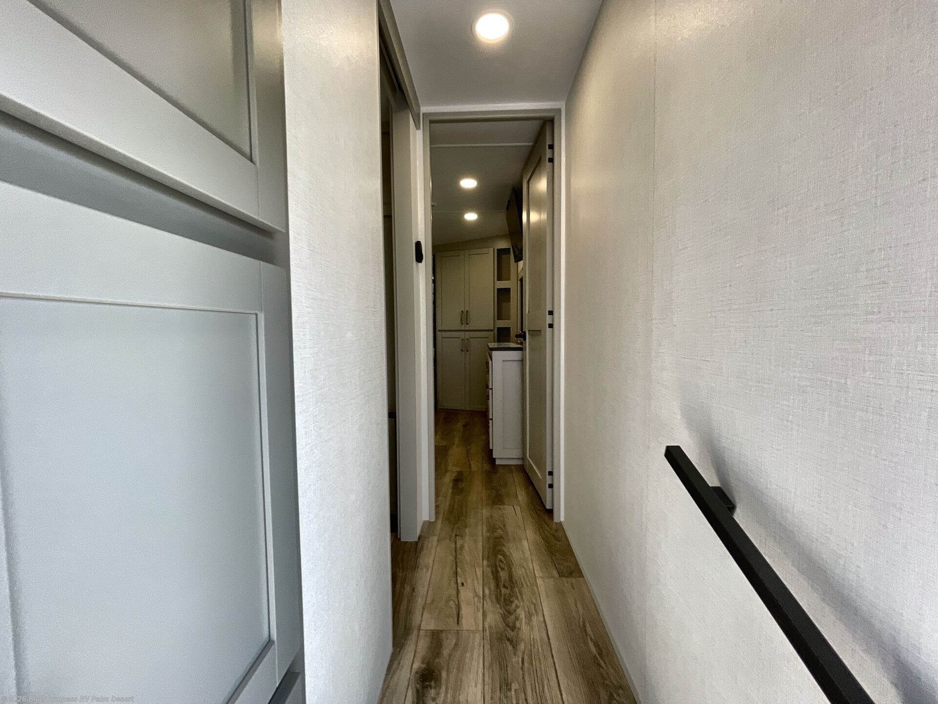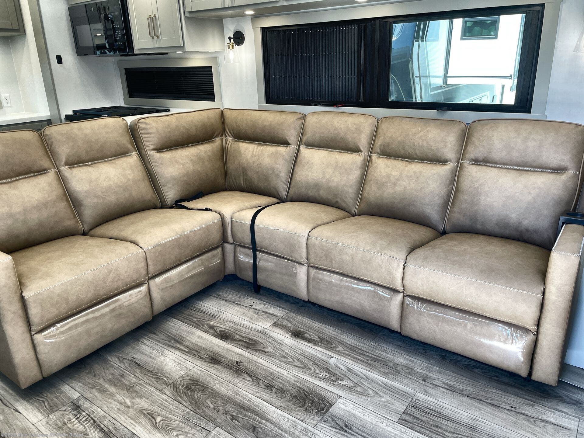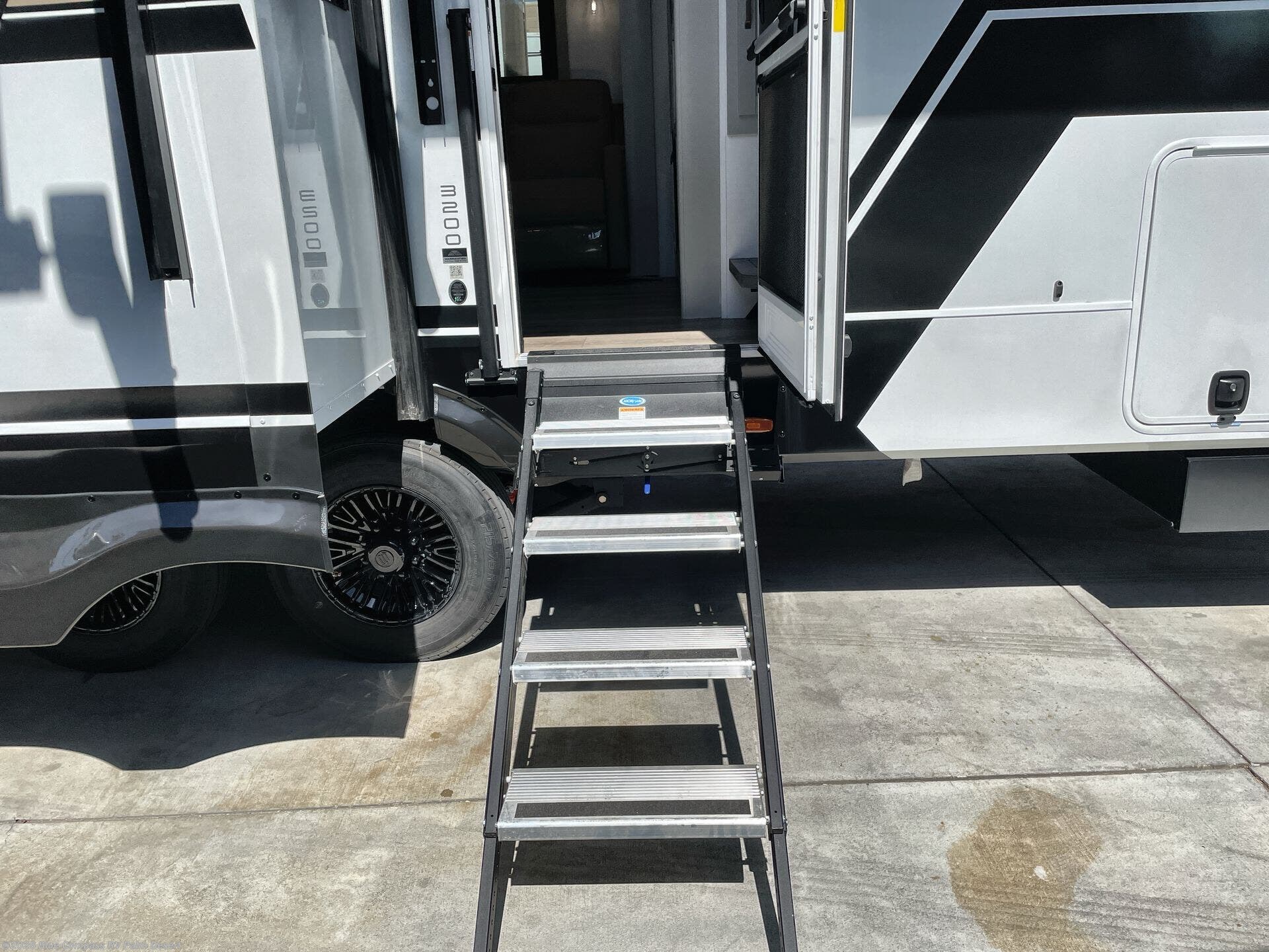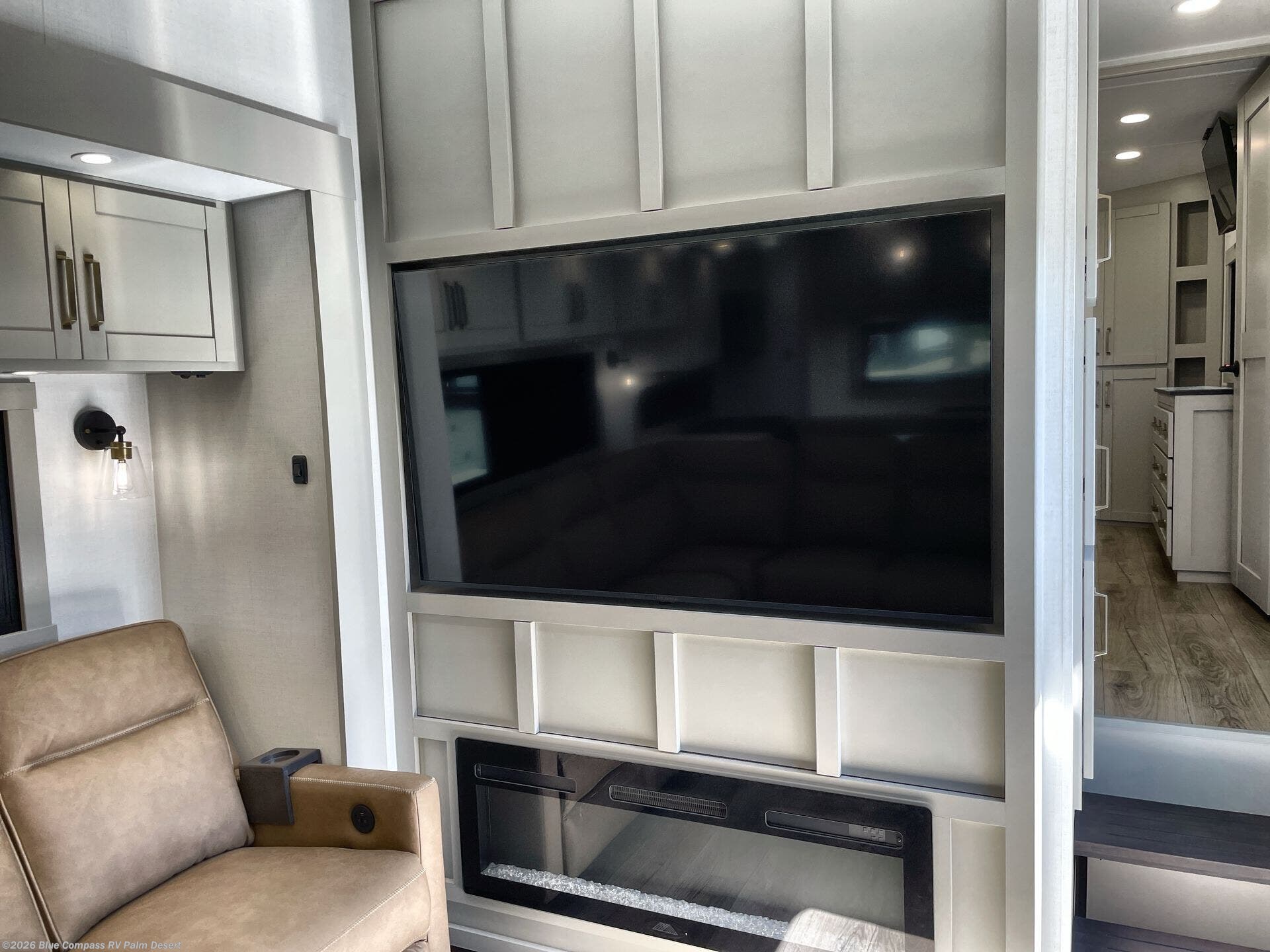 Escape to a world of comfort and luxury with this incredible fifth wheel! The living area features a plush L-sofa, five recliners, and a warm fireplace. The versatile dining table/L desk seats up to four people, making it perfect for meals, work, or play. Ample shoe storage and a convenient spot for pet bowls enhance comfort and practicality. The kitchen offers stunning solid surface countertops, dishwasher prep, a residential microwave, and a three-burner cooktop. The expansive pantry with pull-out drawers provides ample storage for your favorite ingredients and cooking essentials. The full bathroom is a serene oasis, featuring a linen closet for added storage and convenience. The front bedroom is a peaceful sanctuary, featuring a spacious king bed, shelves, and a sliding dresser top with hidden storage. The generous wardrobe and shoe rack provide ample storage for your clothes and shoes.