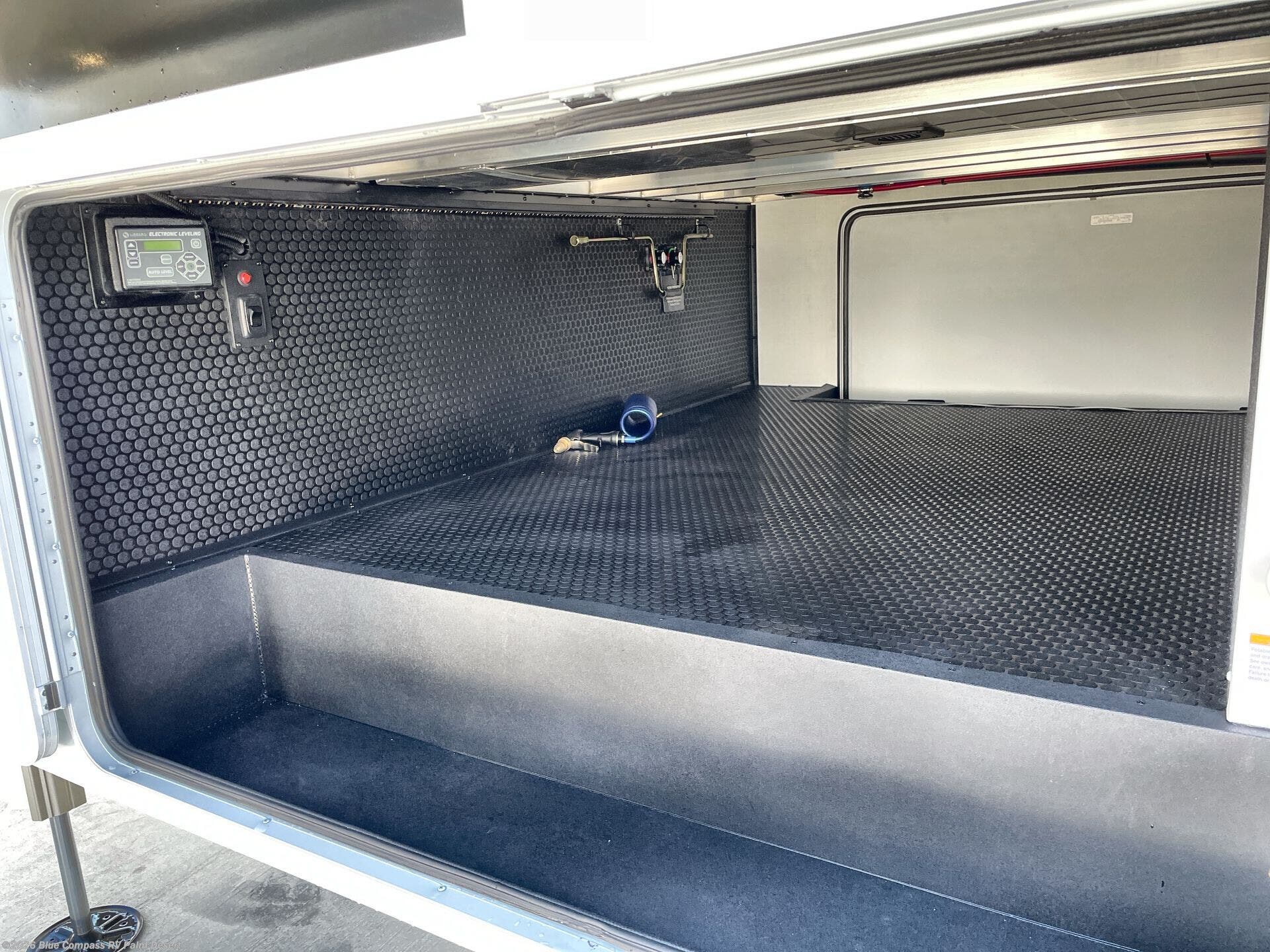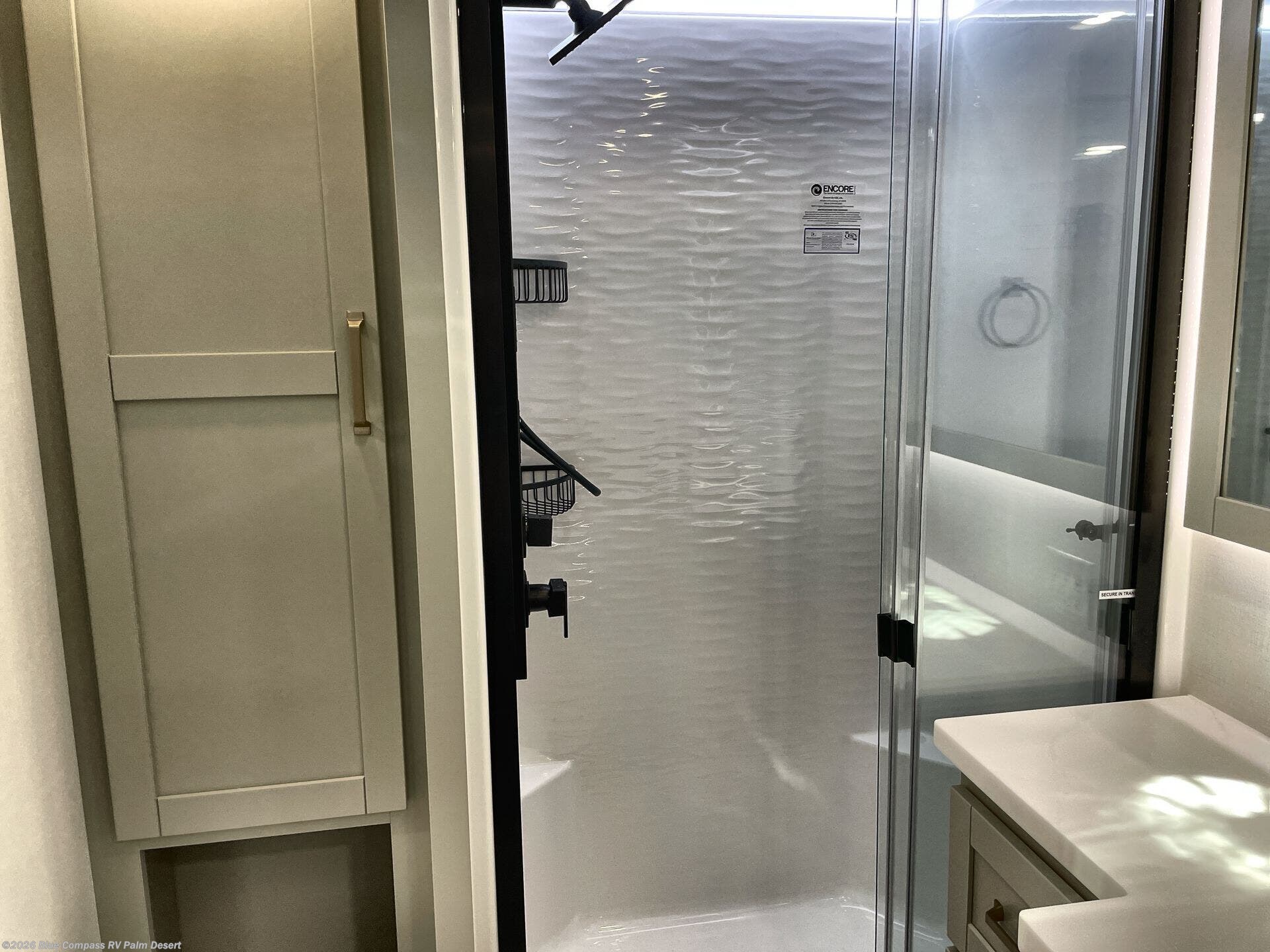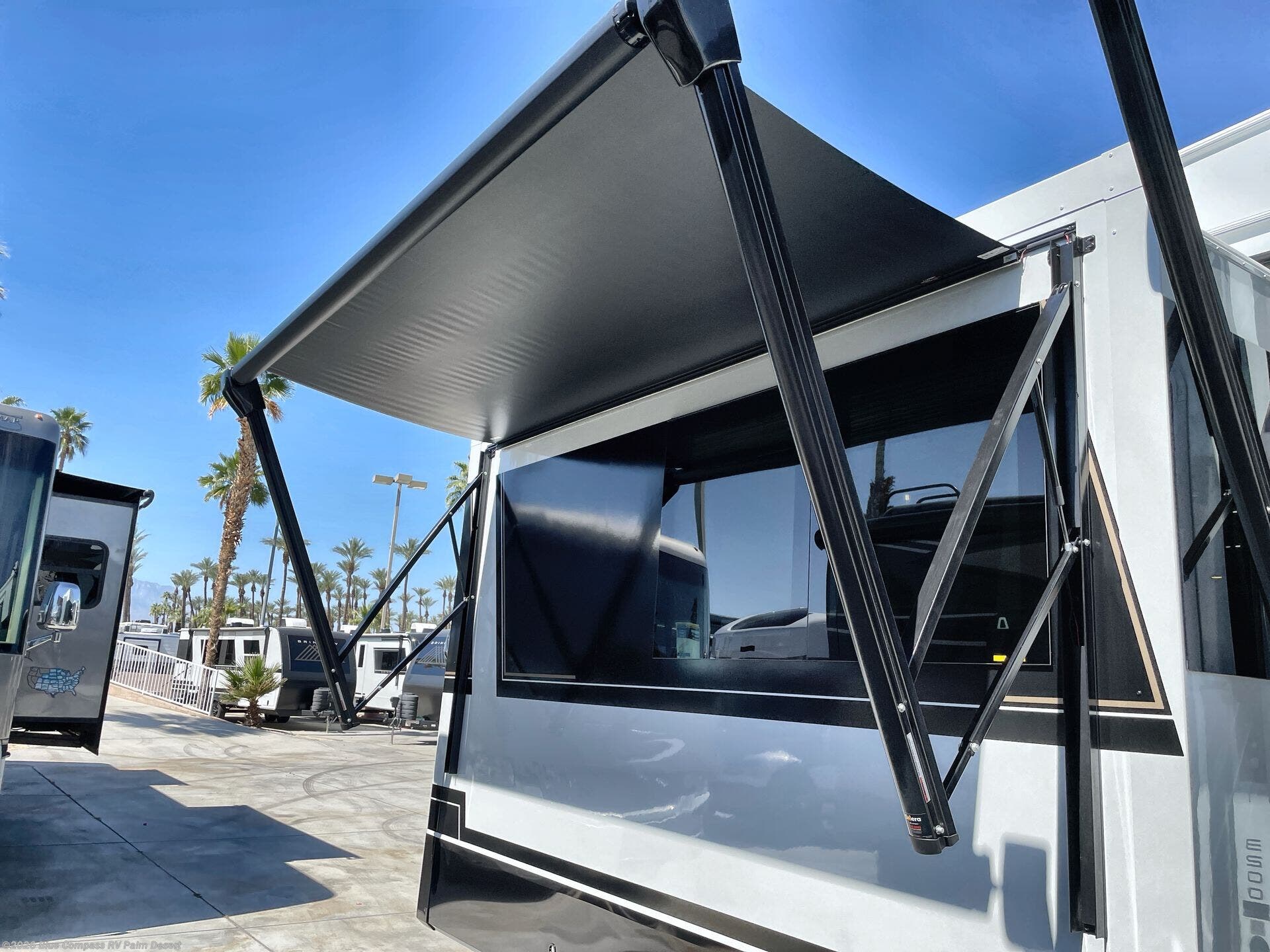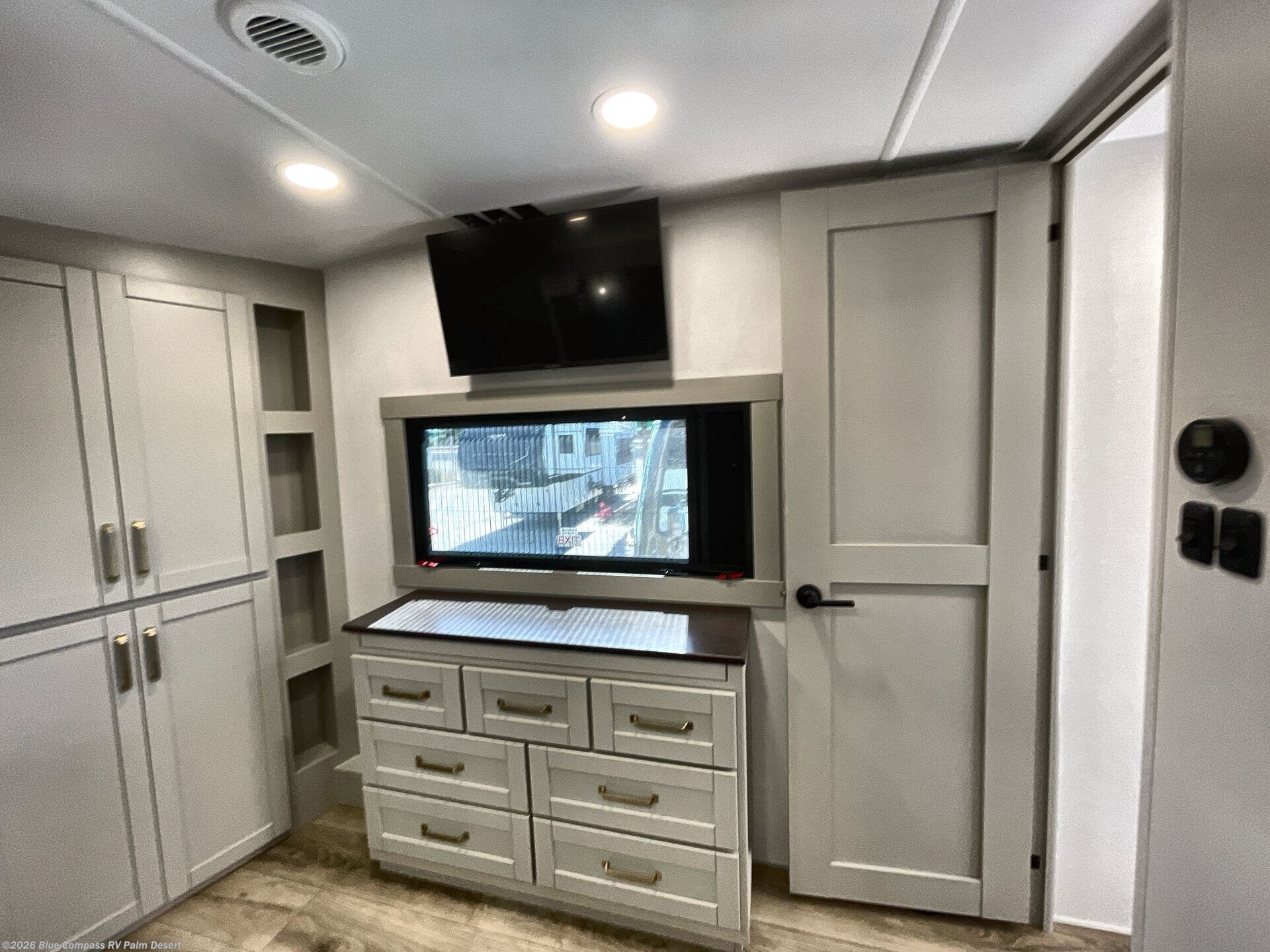 Escape to a world of comfort and luxury with this incredible fifth wheel! The living area features a plush L-sofa, five recliners, and a warm fireplace. The versatile dining table/L desk seats up to four people, making it perfect for meals, work, or play. Ample shoe storage and a convenient spot for pet bowls enhance comfort and practicality. The kitchen offers stunning solid surface countertops, dishwasher prep, a residential microwave, and a three-burner cooktop. The expansive pantry with pull-out drawers provides ample storage for your favorite ingredients and cooking essentials. The full bathroom is a serene oasis, featuring a linen closet for added storage and convenience. The front bedroom is a peaceful sanctuary, featuring a spacious king bed, shelves, and a sliding dresser top with hidden storage. The generous wardrobe and shoe rack provide ample storage for your clothes and shoes.