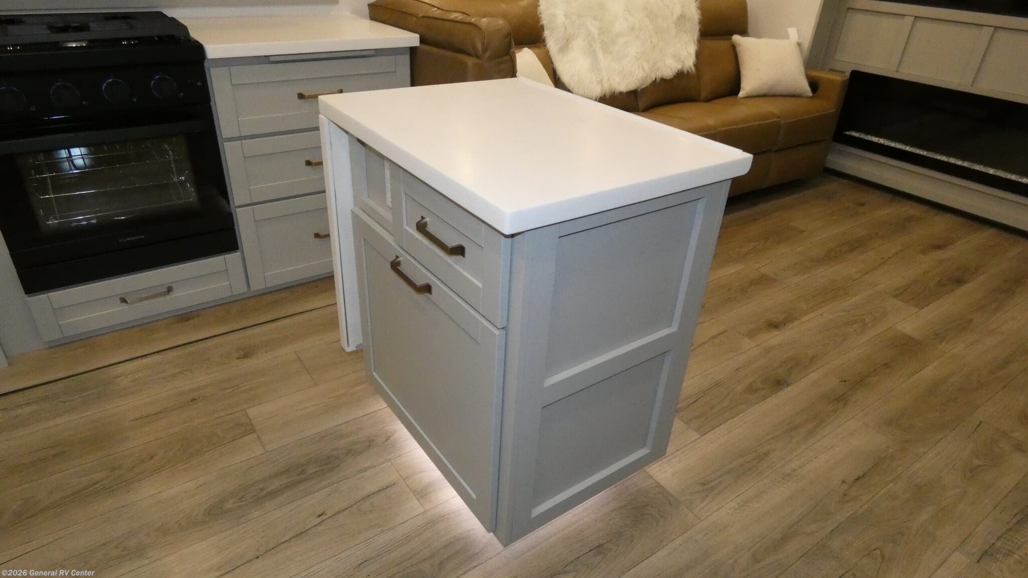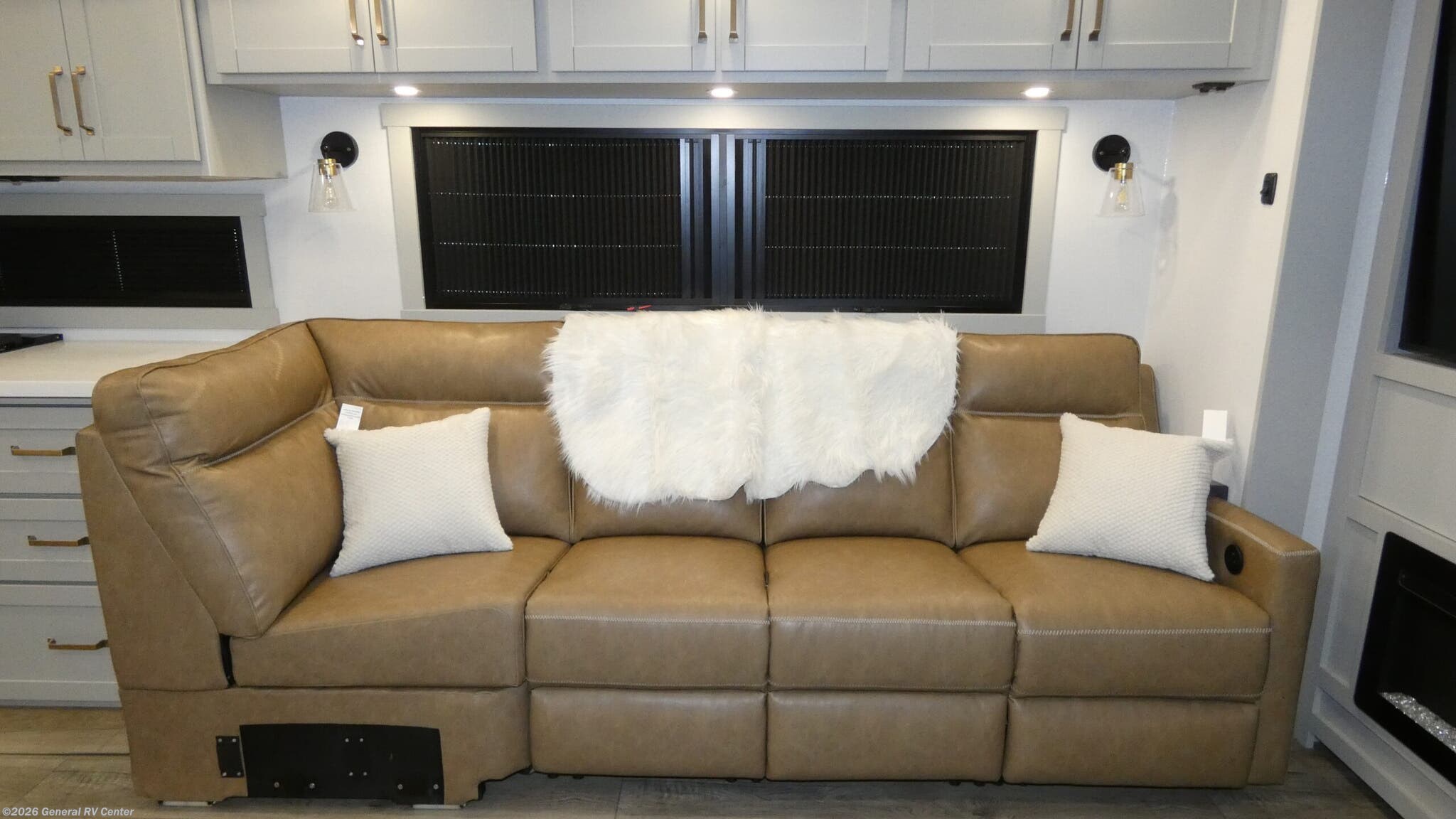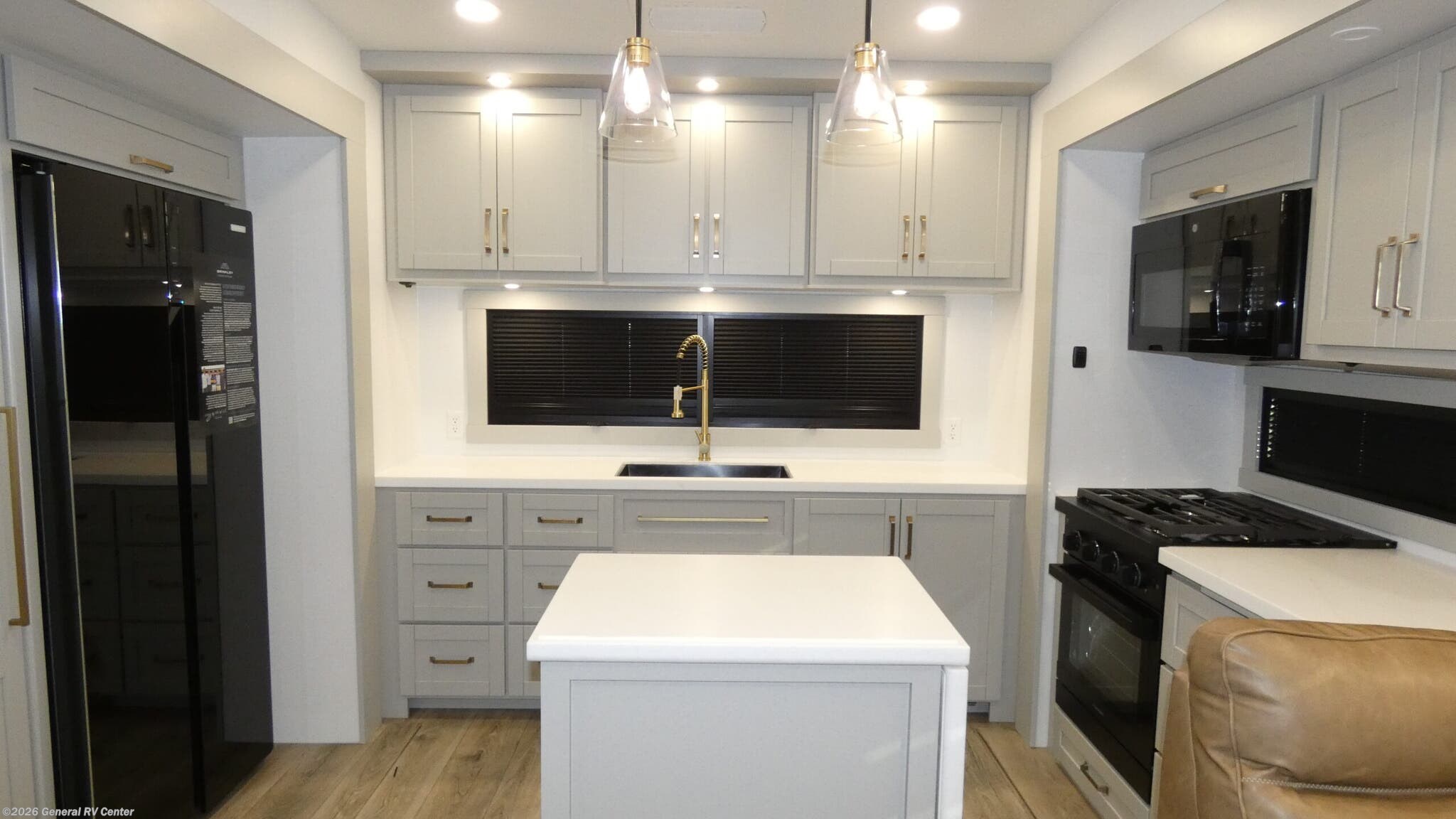 Brinkley Model Z 3200 fifth wheel highlights: L-Sofa with Five Recliners Flip-Up Countertop Fireplace Dual Awnings Shoe Storage Escape to a world of comfort and luxury with this incredible fifth wheel! The living area features a plush L-sofa, five recliners, and a warm fireplace. The versatile dining table/L desk seats up to four people, making it perfect for meals, work, or play. Ample shoe storage and a convenient spot for pet bowls enhance comfort and practicality. The kitchen offers stunning solid surface countertops, dishwasher prep, a residential microwave, and a three-burner cooktop. The expansive pantry with pull-out drawers provides ample storage for your favorite ingredients and cooking essentials. The full bathroom is a serene oasis, featuring a linen closet for added storage and convenience. The front bedroom is a peaceful sanctuary, featuring a spacious king bed, shelves, and a sliding dresser top with hidden storage. The generous wardrobe and shoe rack provide ample storage for your clothes and shoes. The Brinkley mid-profile Model Z fifth wheels bring you clean lines and an upscale look with plenty of style and exciting new features like the industry first brass plumbing connections. These units also feature an automotive grade front cap, plenty of exterior storage, exterior hot and cold showers, and wide stance leveling jacks for easy set up. Residential frameless windows provide a clean look and beautiful views, and ample electrical outlets and 6 USB/USB-C outlets allow all of your electronics and appliances to easily be used and charged.