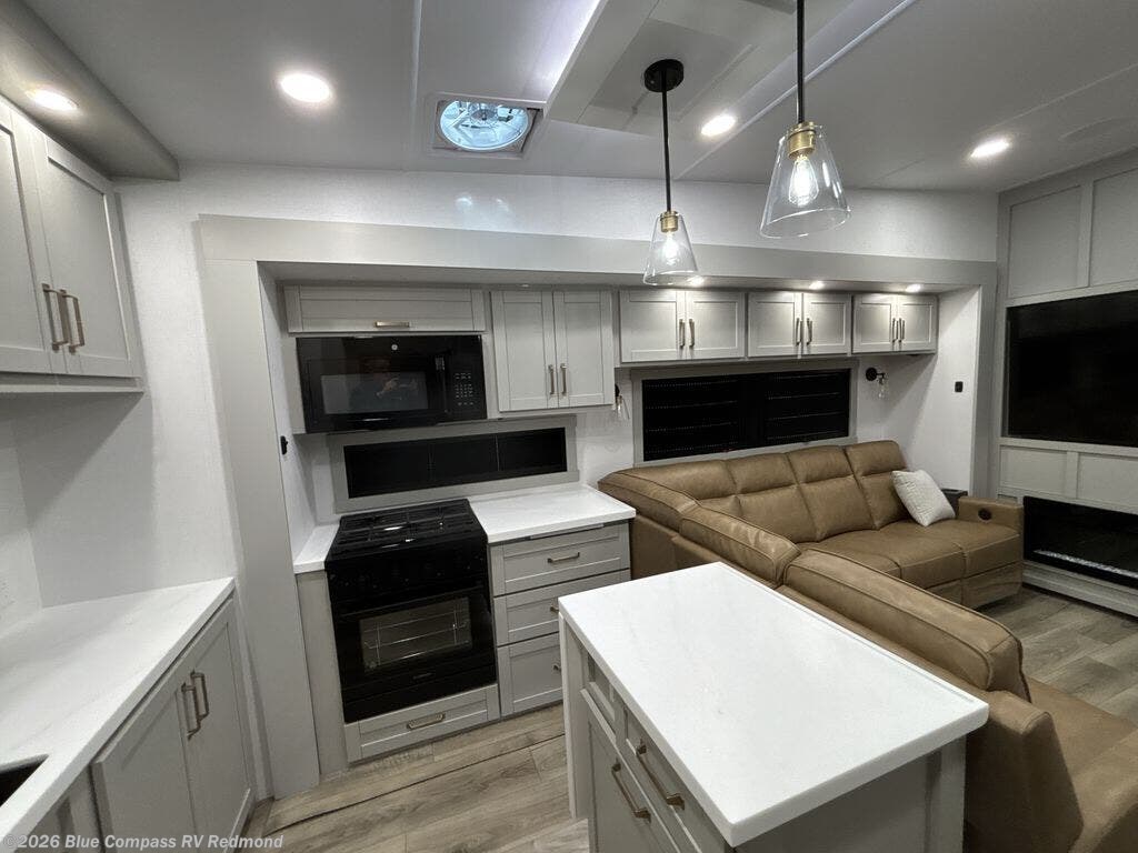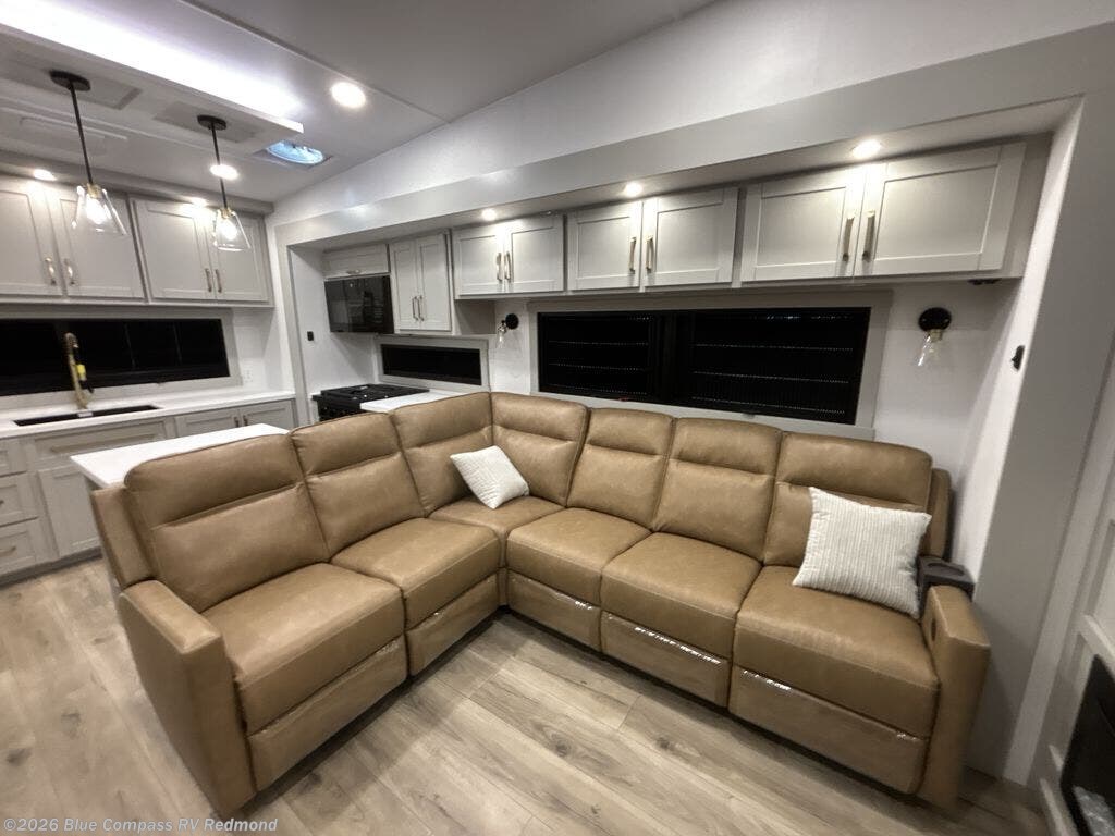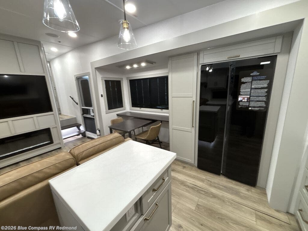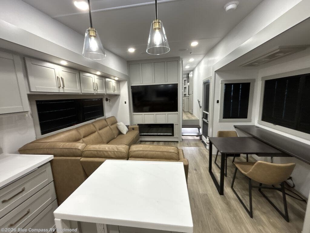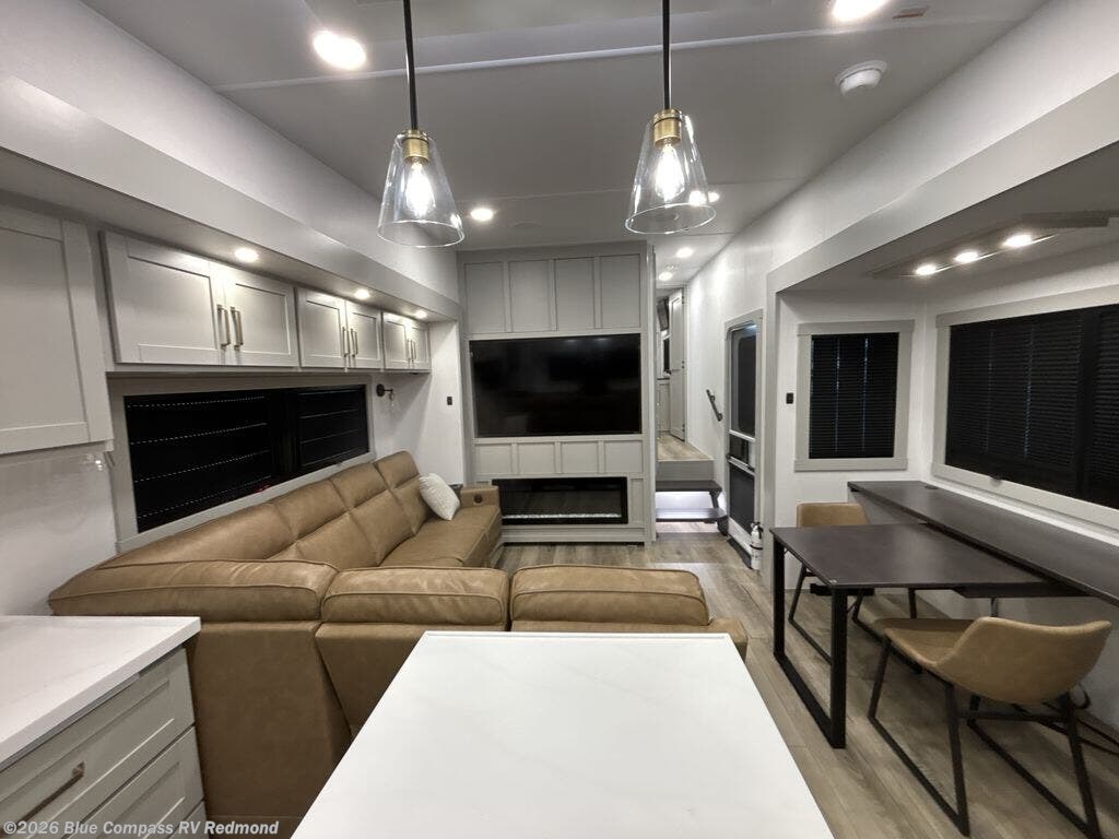 Escape to a world of comfort and luxury with this incredible fifth wheel! The living area features a plush L-sofa, five recliners, and a warm fireplace. The versatile dining table/L desk seats up to four people, making it perfect for meals, work, or play. Ample shoe storage and a convenient spot for pet bowls enhance comfort and practicality. The kitchen offers stunning solid surface countertops, dishwasher prep, a residential microwave, and a three-burner cooktop. The expansive pantry with pull-out drawers provides ample storage for your favorite ingredients and cooking essentials. The full bathroom is a serene oasis, featuring a linen closet for added storage and convenience. The front bedroom is a peaceful sanctuary, featuring a spacious king bed, shelves, and a sliding dresser top with hidden storage. The generous wardrobe and shoe rack provide ample storage for your clothes and shoes.