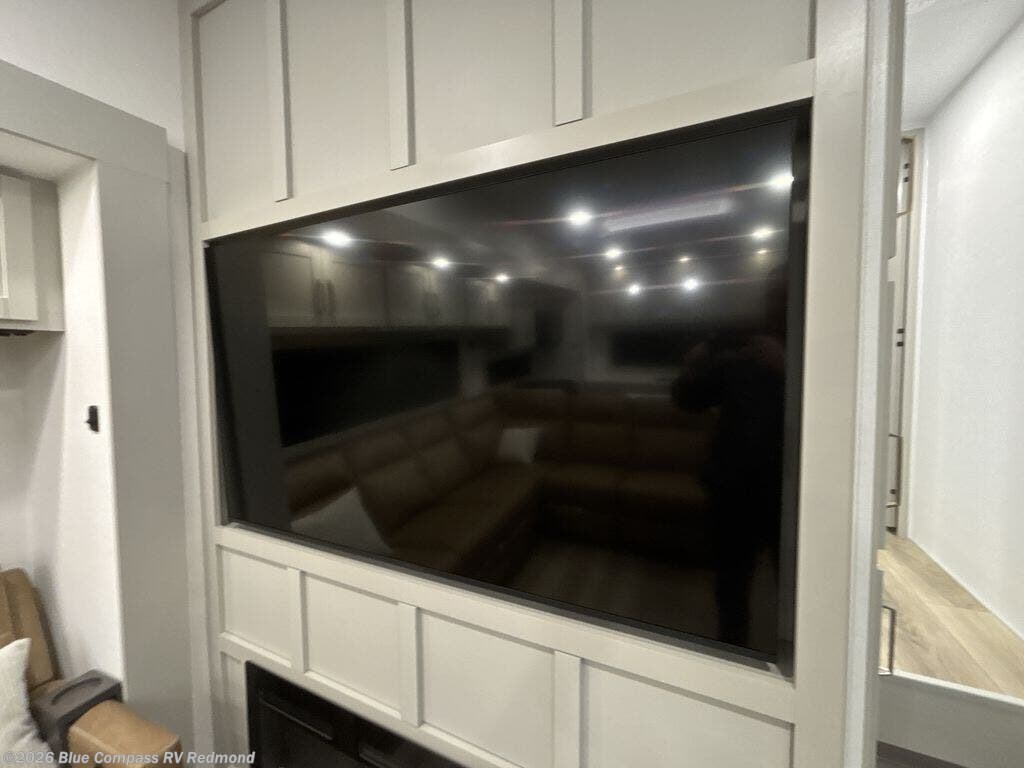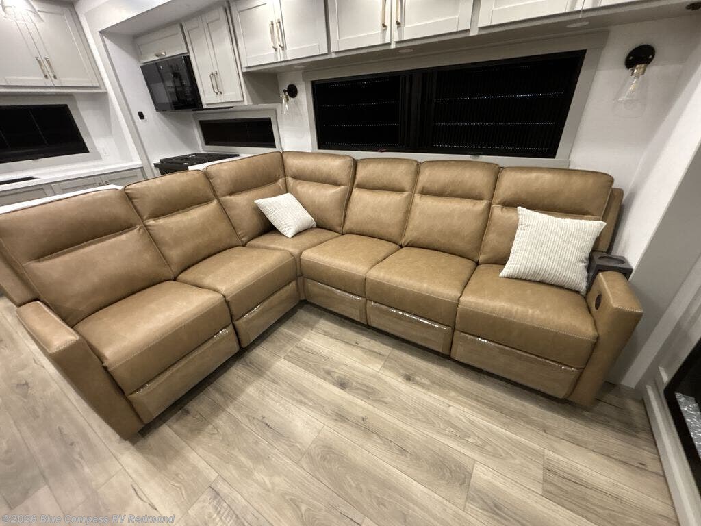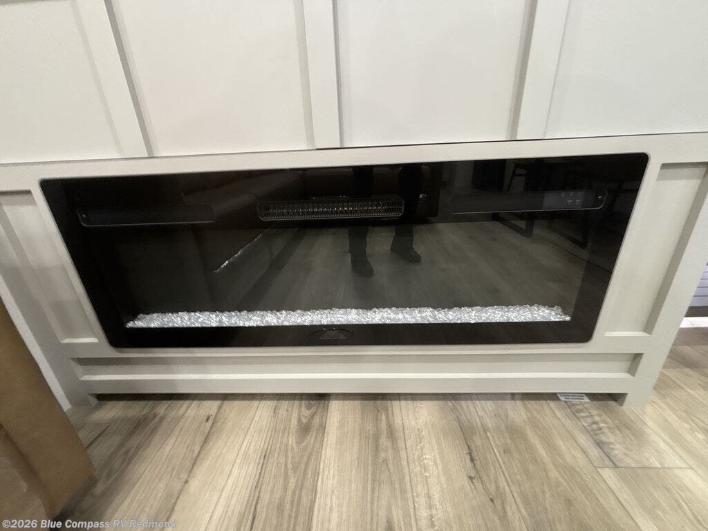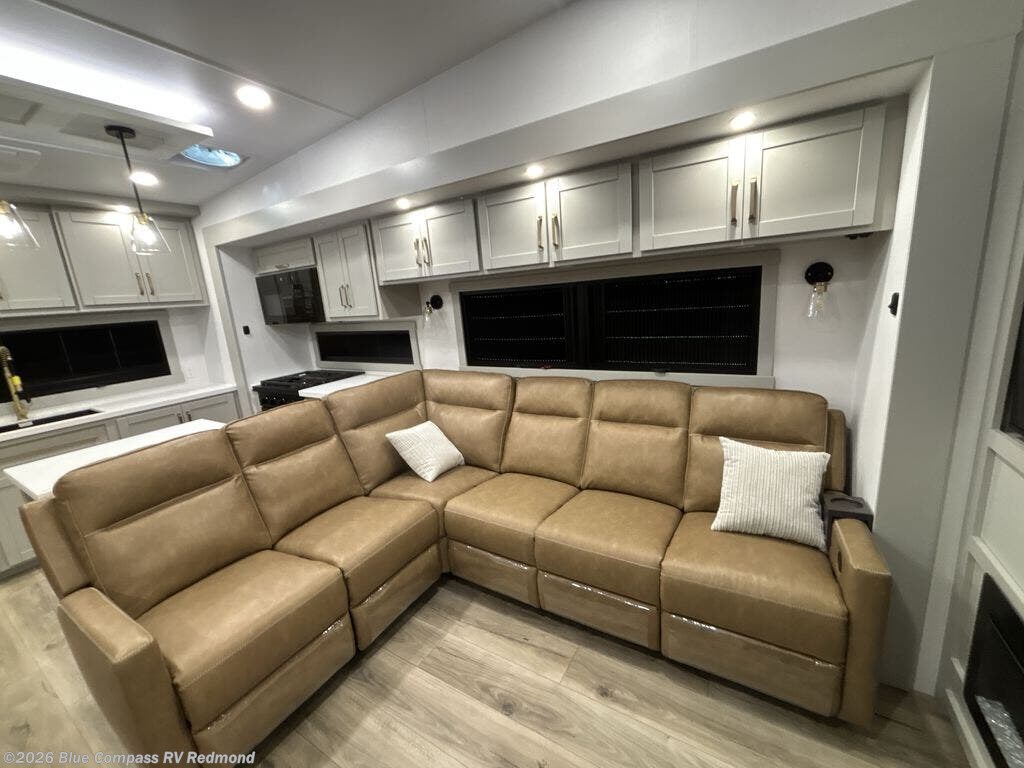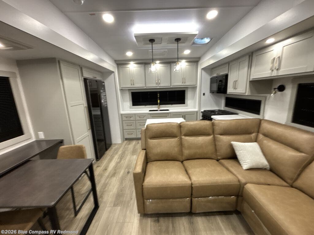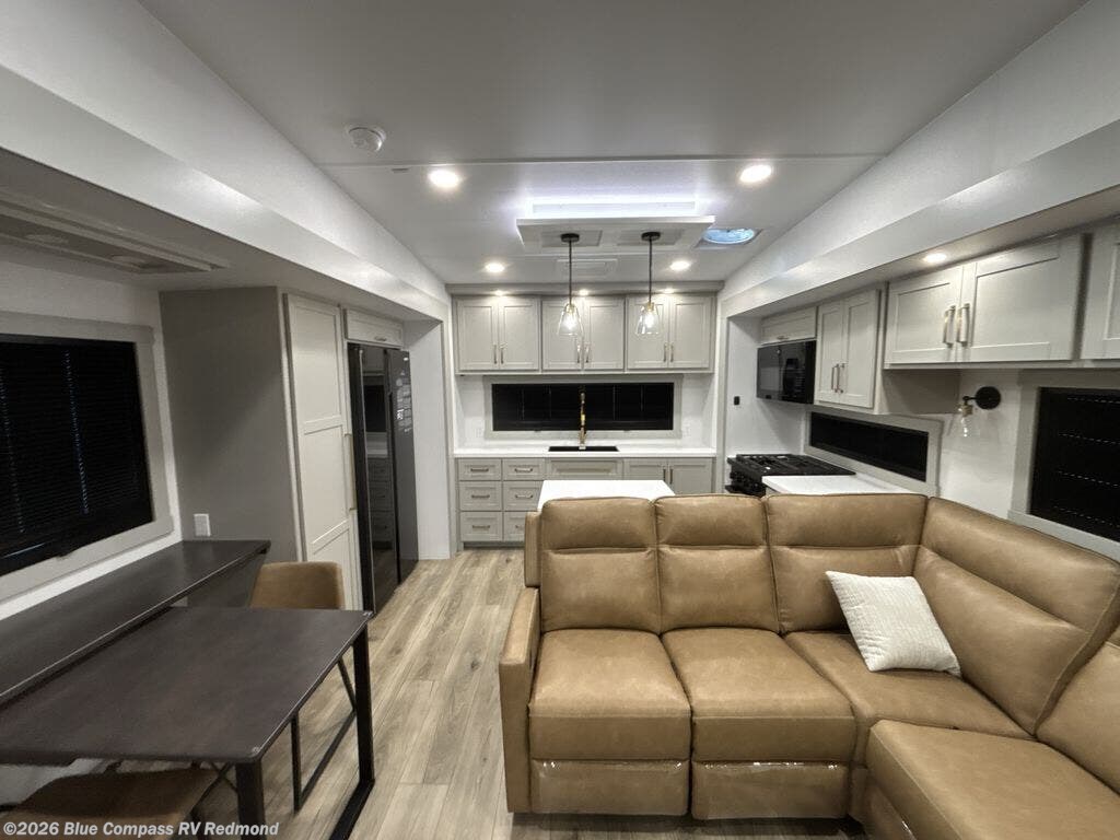 Escape to a world of comfort and luxury with this incredible fifth wheel! The living area features a plush L-sofa, five recliners, and a warm fireplace. The versatile dining table/L desk seats up to four people, making it perfect for meals, work, or play. Ample shoe storage and a convenient spot for pet bowls enhance comfort and practicality. The kitchen offers stunning solid surface countertops, dishwasher prep, a residential microwave, and a three-burner cooktop. The expansive pantry with pull-out drawers provides ample storage for your favorite ingredients and cooking essentials. The full bathroom is a serene oasis, featuring a linen closet for added storage and convenience. The front bedroom is a peaceful sanctuary, featuring a spacious king bed, shelves, and a sliding dresser top with hidden storage. The generous wardrobe and shoe rack provide ample storage for your clothes and shoes.