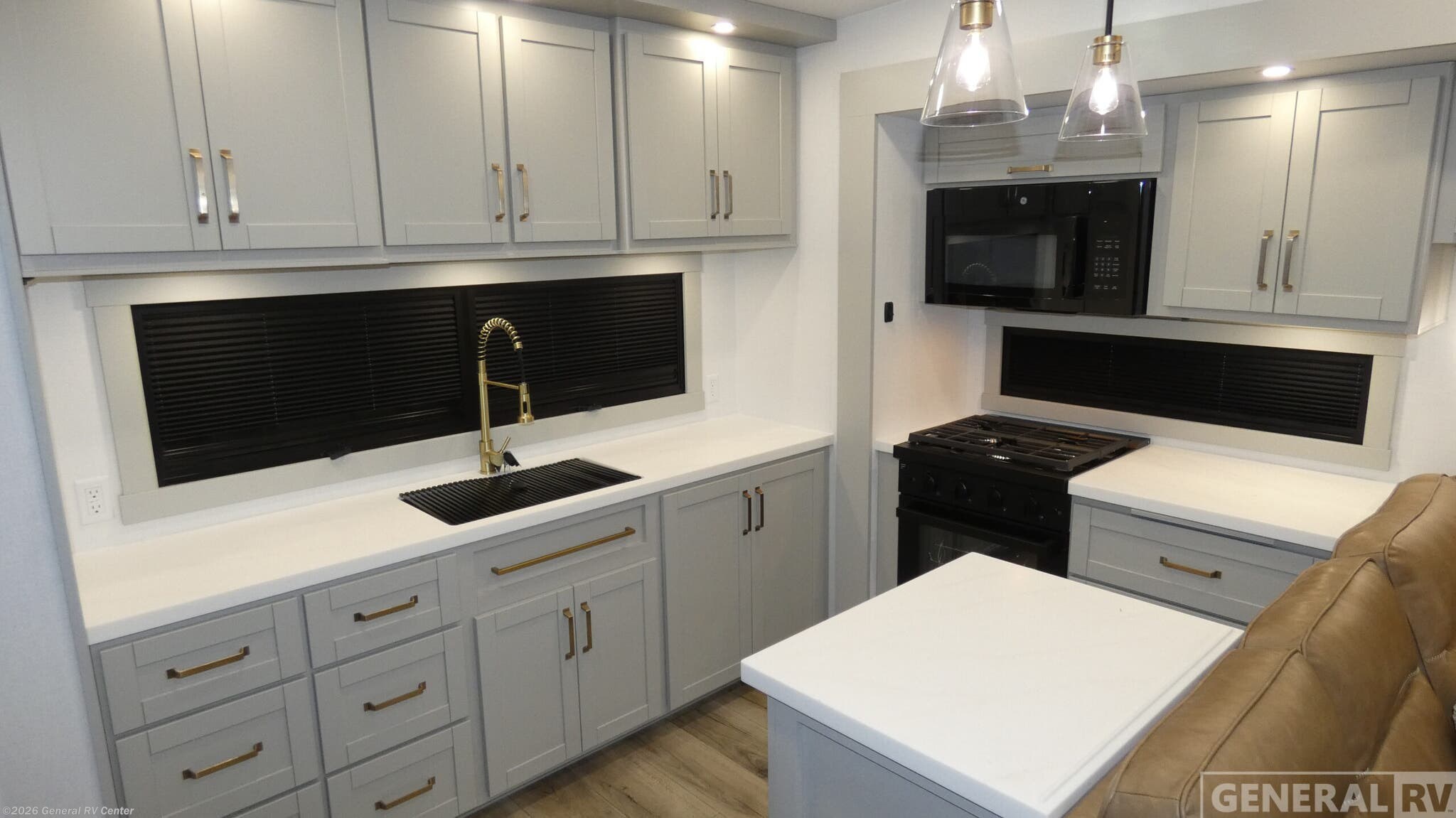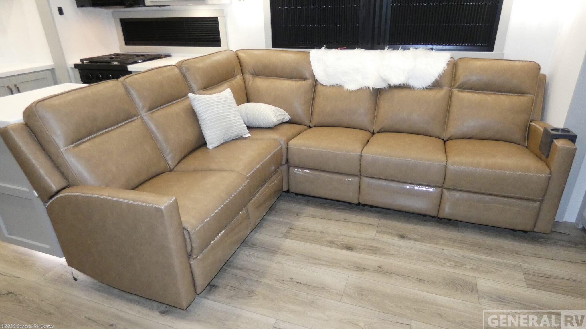 Brinkley Model Z 3200 fifth wheel highlights: L-Sofa with Five Recliners Flip-Up Countertop Fireplace Dual Awnings Shoe Storage Escape to a world of comfort and luxury with this incredible fifth wheel! The living area features a plush L-sofa, five recliners, and a warm fireplace. The versatile dining table/L desk seats up to four people, making it perfect for meals, work, or play. Ample shoe storage and a convenient spot for pet bowls enhance comfort and practicality. The kitchen offers stunning solid surface countertops, dishwasher prep, a residential microwave, and a three-burner cooktop. The expansive pantry with pull-out drawers provides ample storage for your favorite ingredients and cooking essentials. The full bathroom is a serene oasis, featuring a linen closet for added storage and convenience. The front bedroom is a peaceful sanctuary, featuring a spacious king bed, shelves, and a sliding dresser top with hidden storage. The generous wardrobe and shoe rack provide ample storage for your clothes and shoes. The Brinkley mid-profile Model Z fifth wheels bring you clean lines and an upscale look with plenty of style and exciting new features like the industry first brass plumbing connections. These units also feature an automotive grade front cap, plenty of exterior storage, exterior hot and cold showers, and wide stance leveling jacks for easy set up. Residential frameless windows provide a clean look and beautiful views, and ample electrical outlets and 6 USB/USB-C outlets allow all of your electronics and appliances to easily be used and charged.