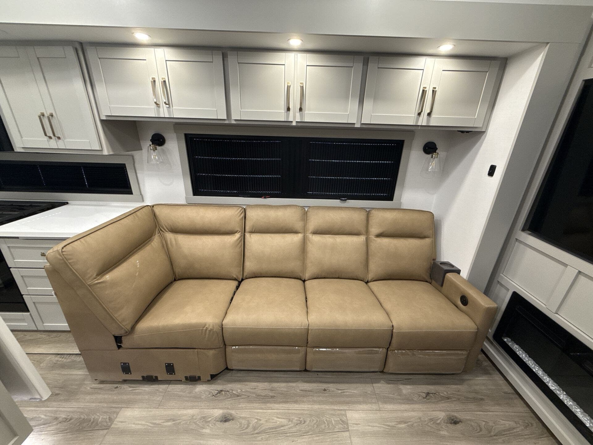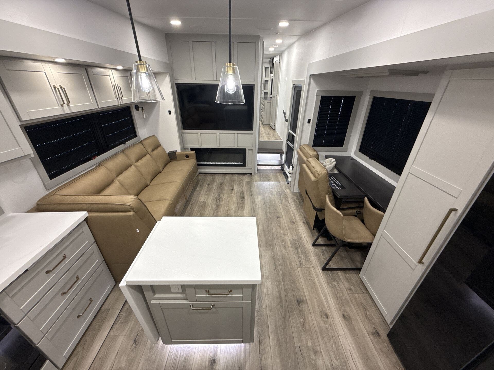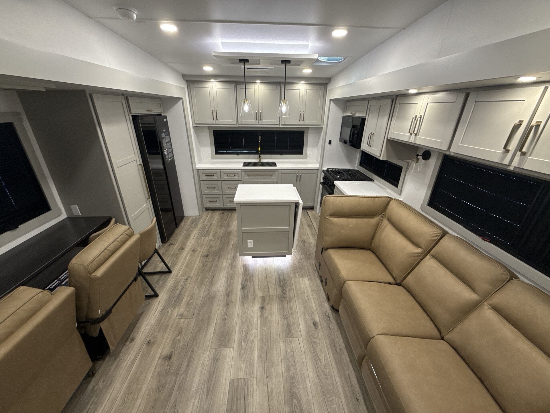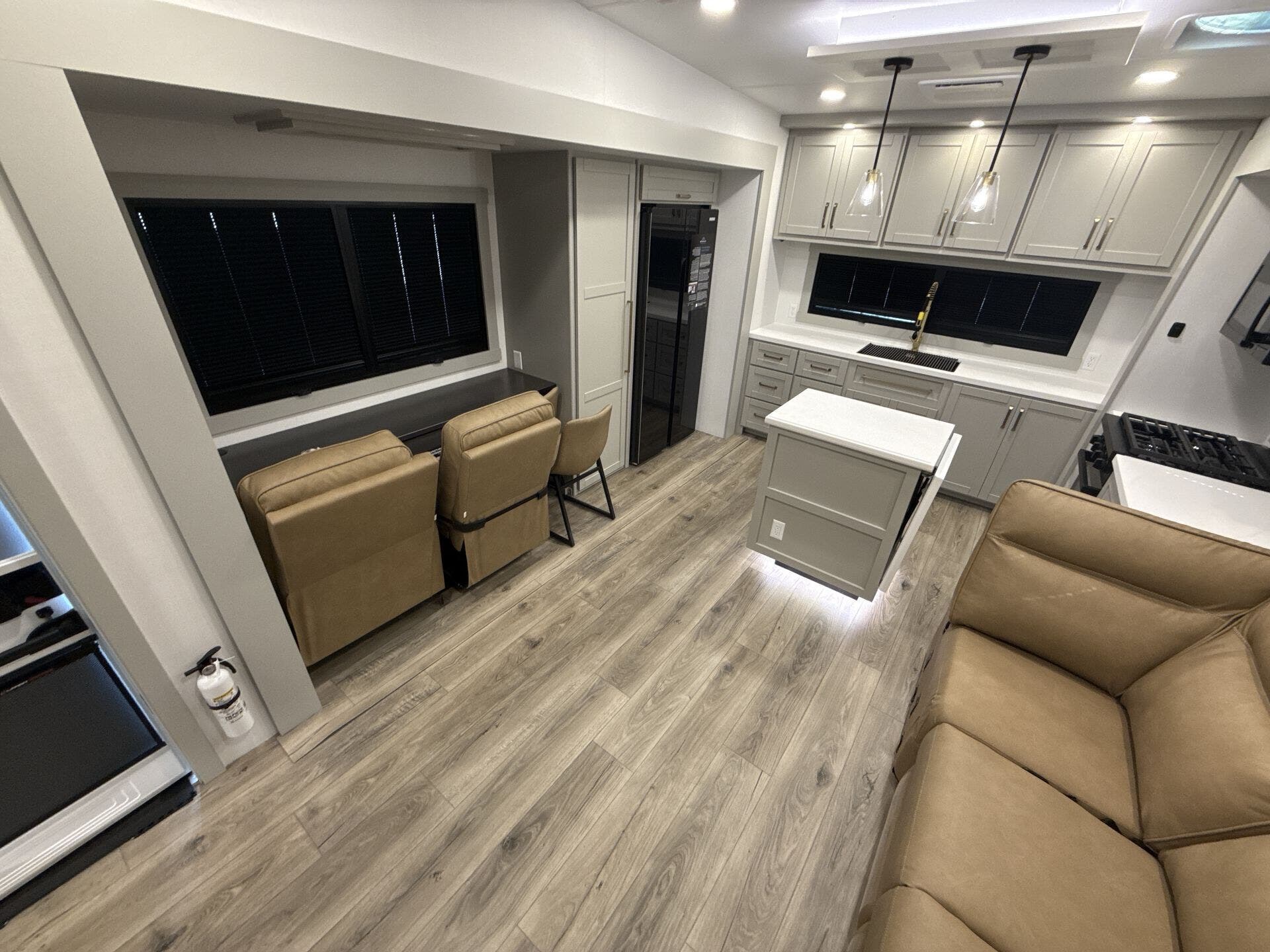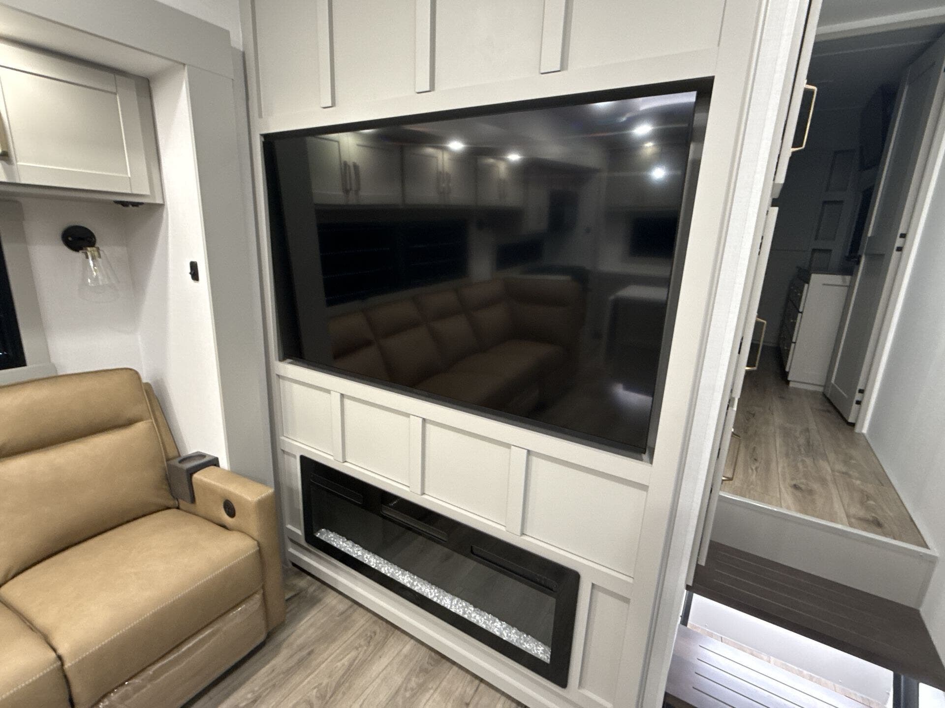 Escape to a world of comfort and luxury with this incredible fifth wheel! The living area features a plush L-sofa, five recliners, and a warm fireplace. The versatile dining table/L desk seats up to four people, making it perfect for meals, work, or play. Ample shoe storage and a convenient spot for pet bowls enhance comfort and practicality. The kitchen offers stunning solid surface countertops, dishwasher prep, a residential microwave, and a three-burner cooktop. The expansive pantry with pull-out drawers provides ample storage for your favorite ingredients and cooking essentials. The full bathroom is a serene oasis, featuring a linen closet for added storage and convenience. The front bedroom is a peaceful sanctuary, featuring a spacious king bed, shelves, and a sliding dresser top with hidden storage. The generous wardrobe and shoe rack provide ample storage for your clothes and shoes.