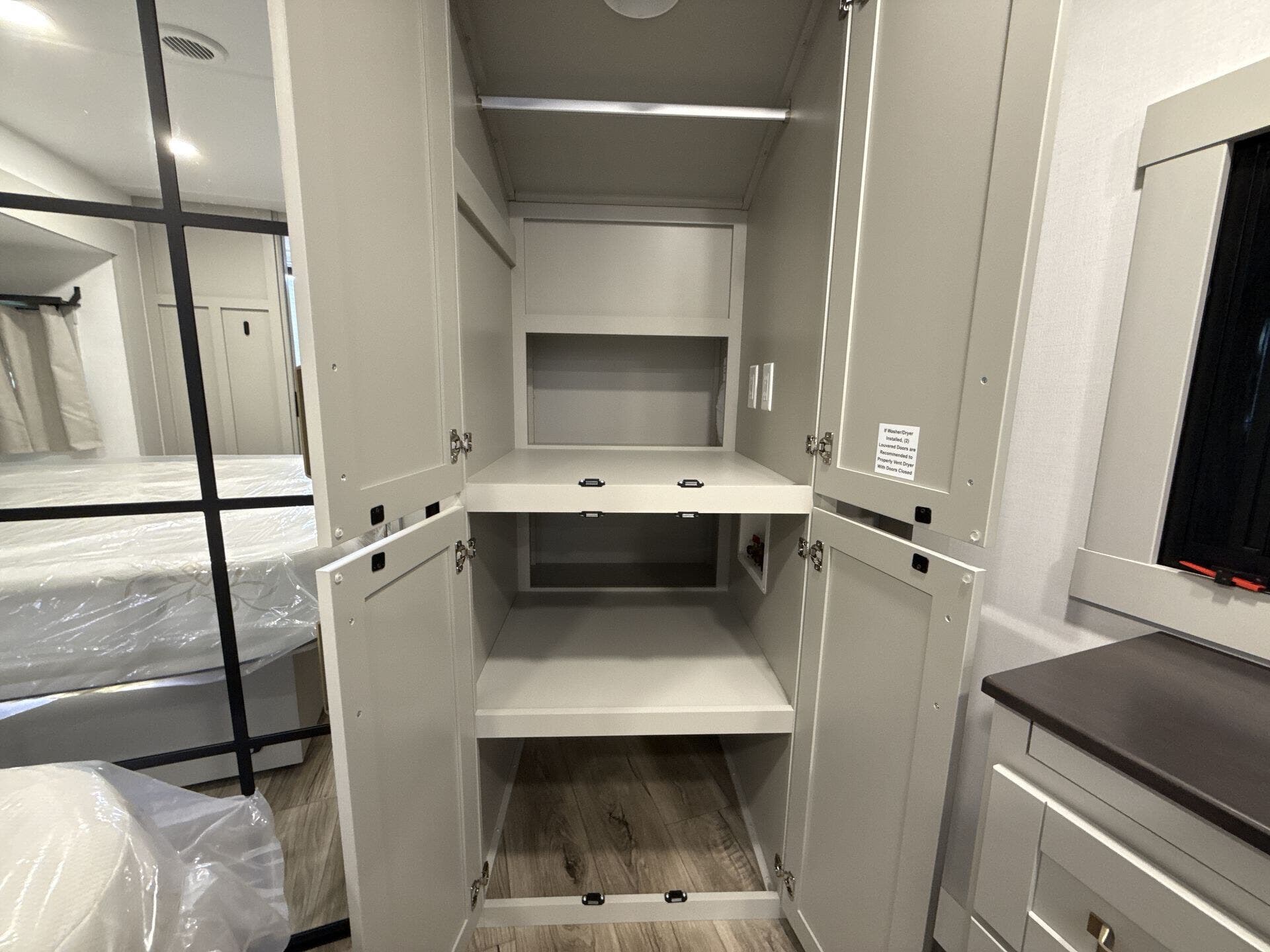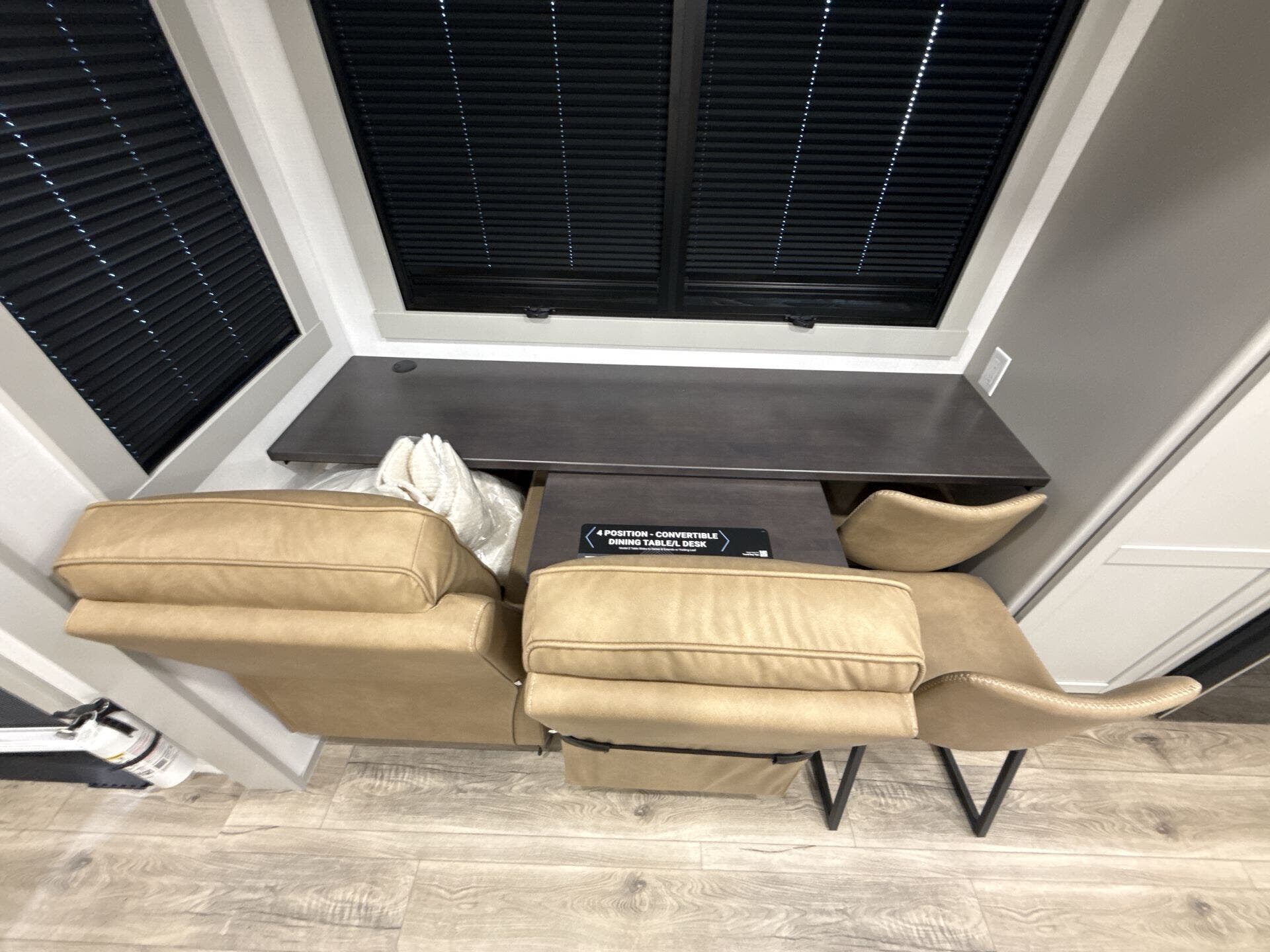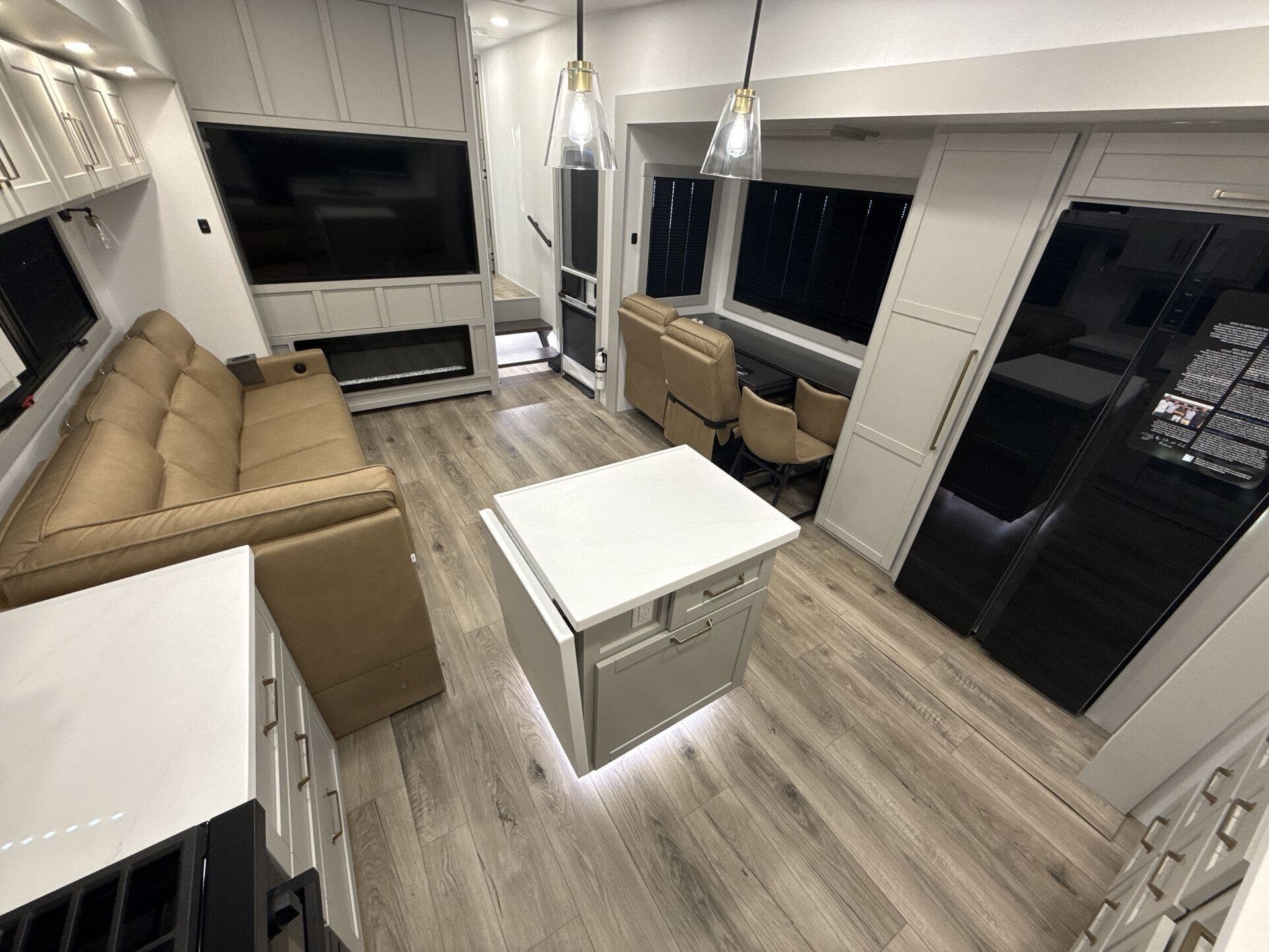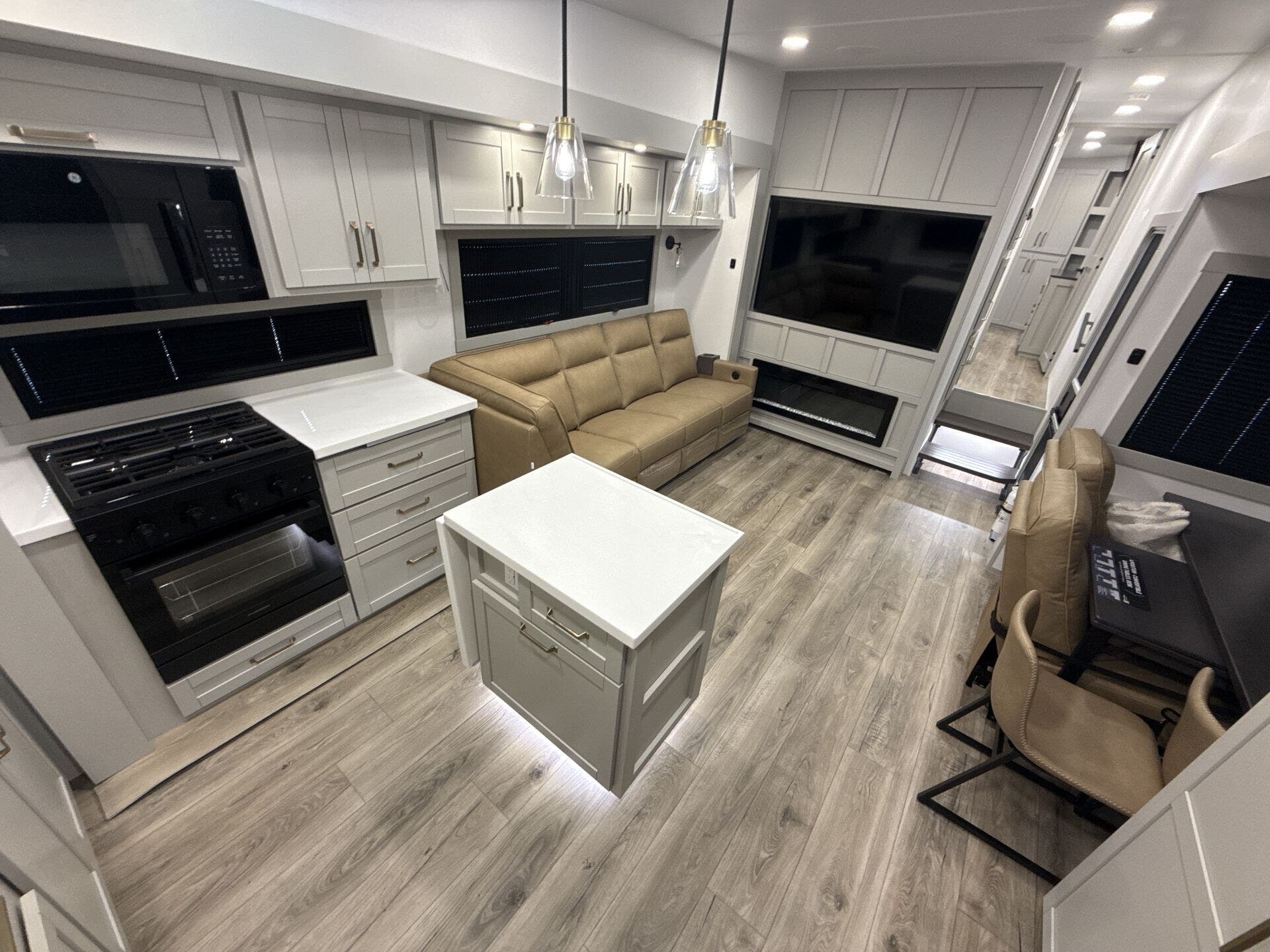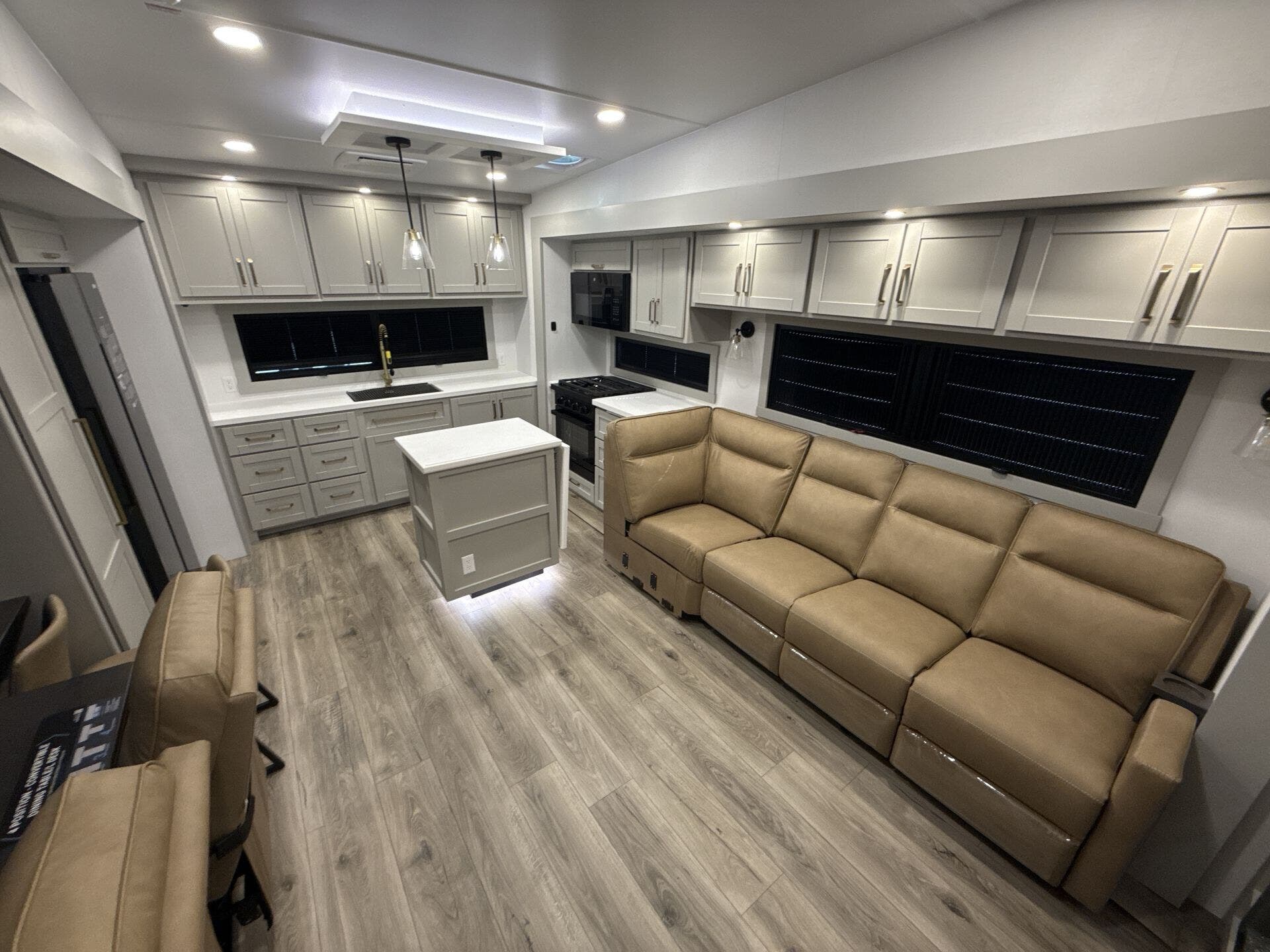 Escape to a world of comfort and luxury with this incredible fifth wheel! The living area features a plush L-sofa, five recliners, and a warm fireplace. The versatile dining table/L desk seats up to four people, making it perfect for meals, work, or play. Ample shoe storage and a convenient spot for pet bowls enhance comfort and practicality. The kitchen offers stunning solid surface countertops, dishwasher prep, a residential microwave, and a three-burner cooktop. The expansive pantry with pull-out drawers provides ample storage for your favorite ingredients and cooking essentials. The full bathroom is a serene oasis, featuring a linen closet for added storage and convenience. The front bedroom is a peaceful sanctuary, featuring a spacious king bed, shelves, and a sliding dresser top with hidden storage. The generous wardrobe and shoe rack provide ample storage for your clothes and shoes.