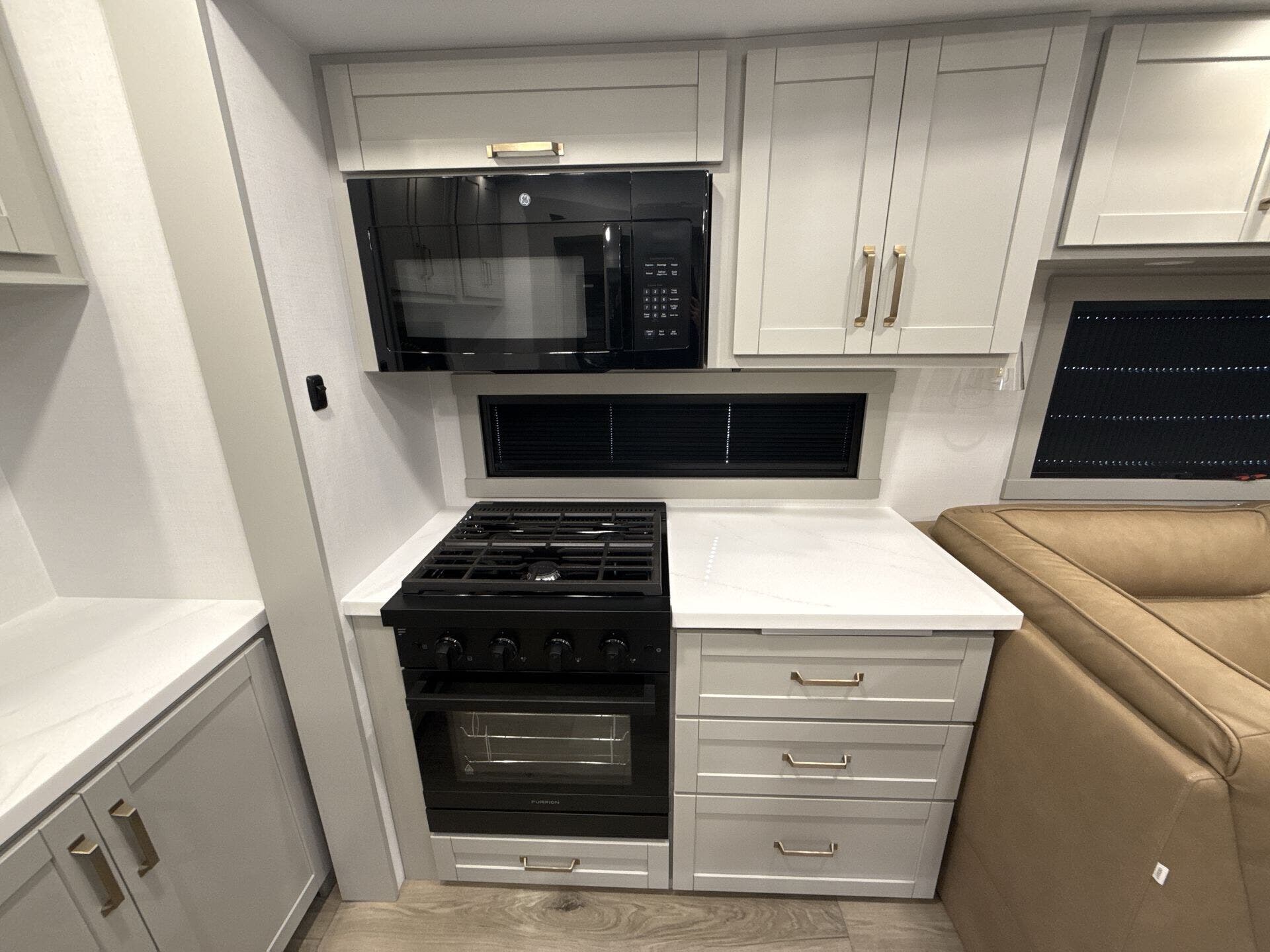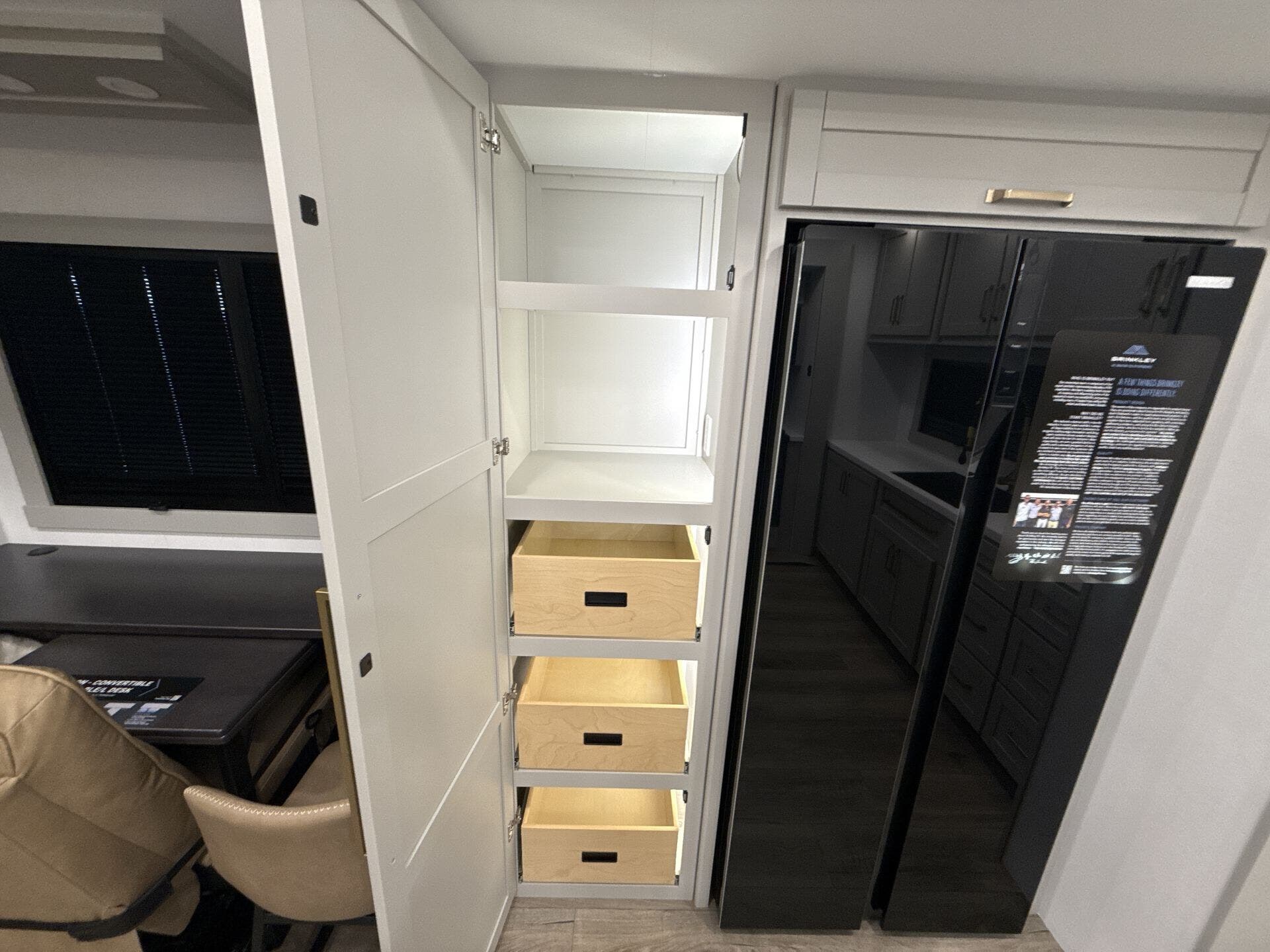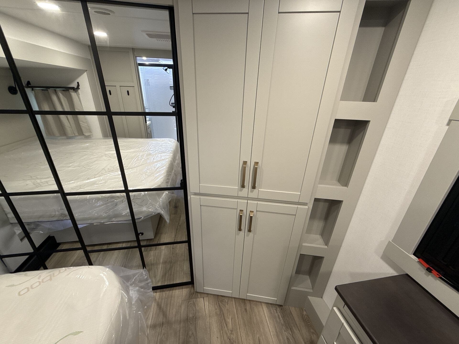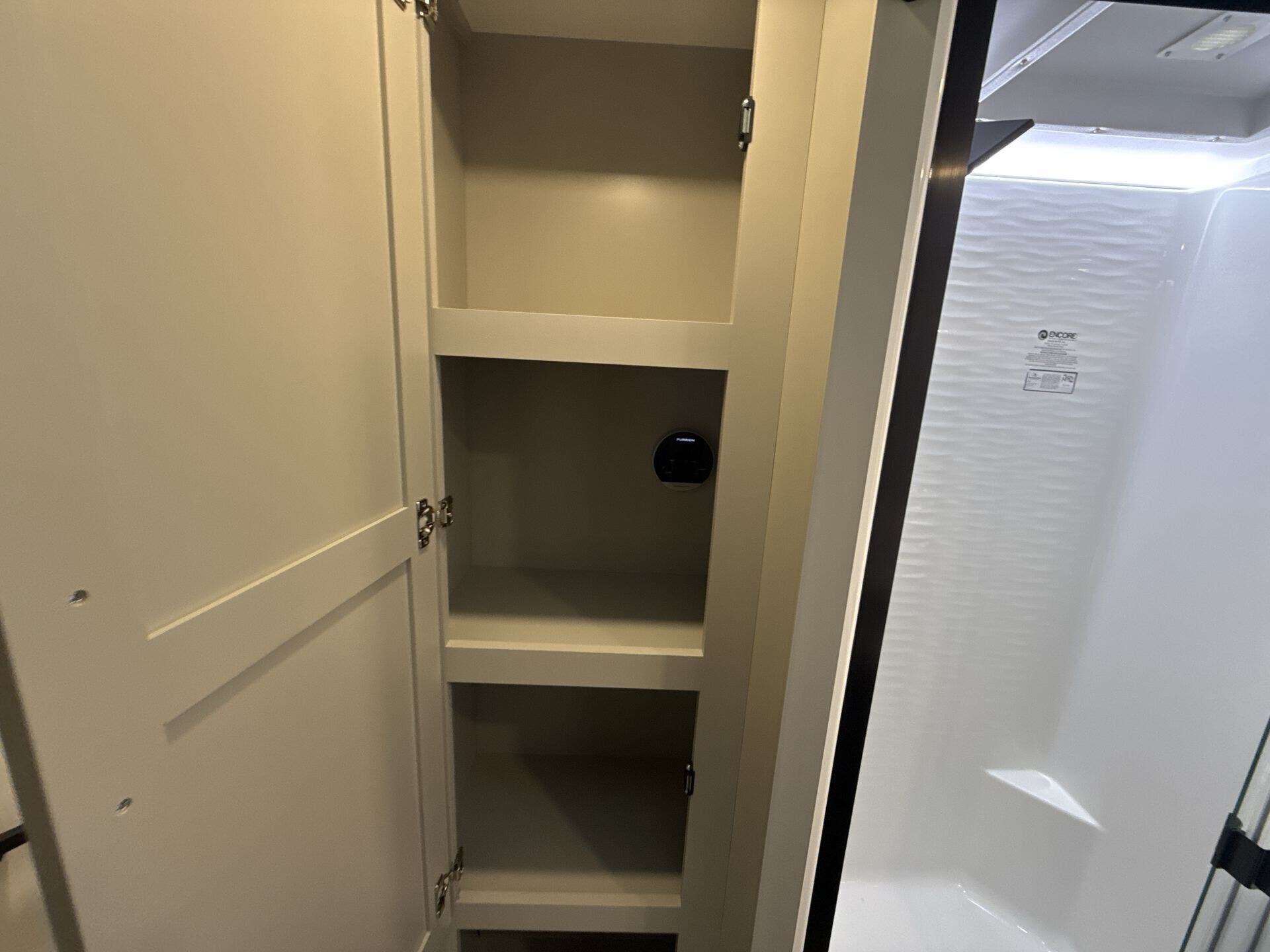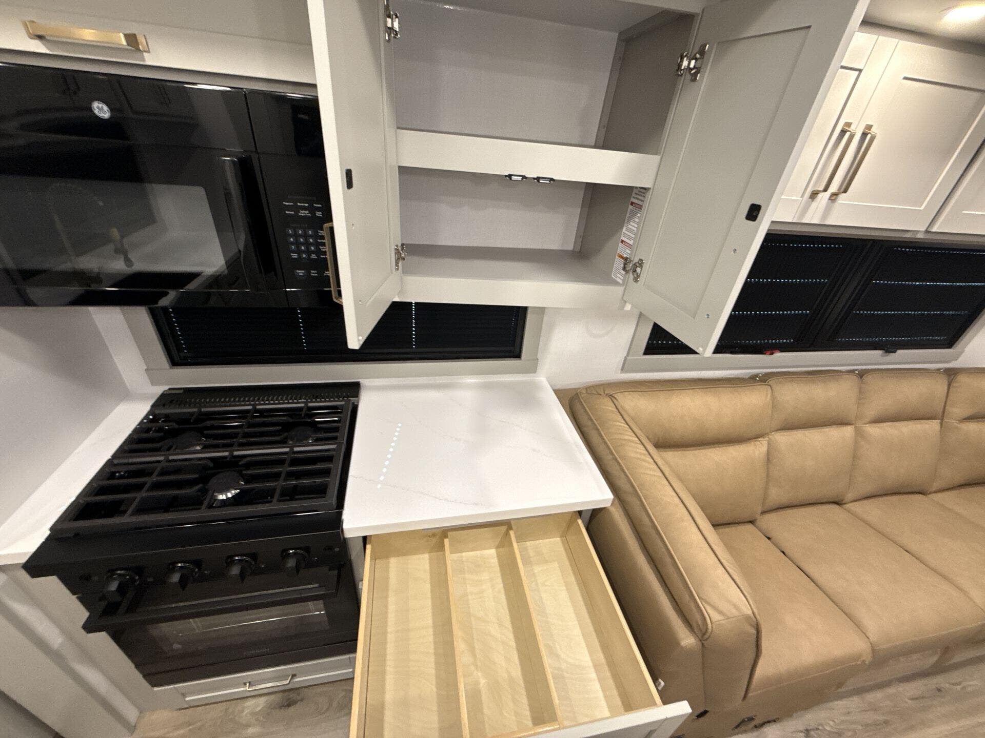 Escape to a world of comfort and luxury with this incredible fifth wheel! The living area features a plush L-sofa, five recliners, and a warm fireplace. The versatile dining table/L desk seats up to four people, making it perfect for meals, work, or play. Ample shoe storage and a convenient spot for pet bowls enhance comfort and practicality. The kitchen offers stunning solid surface countertops, dishwasher prep, a residential microwave, and a three-burner cooktop. The expansive pantry with pull-out drawers provides ample storage for your favorite ingredients and cooking essentials. The full bathroom is a serene oasis, featuring a linen closet for added storage and convenience. The front bedroom is a peaceful sanctuary, featuring a spacious king bed, shelves, and a sliding dresser top with hidden storage. The generous wardrobe and shoe rack provide ample storage for your clothes and shoes.