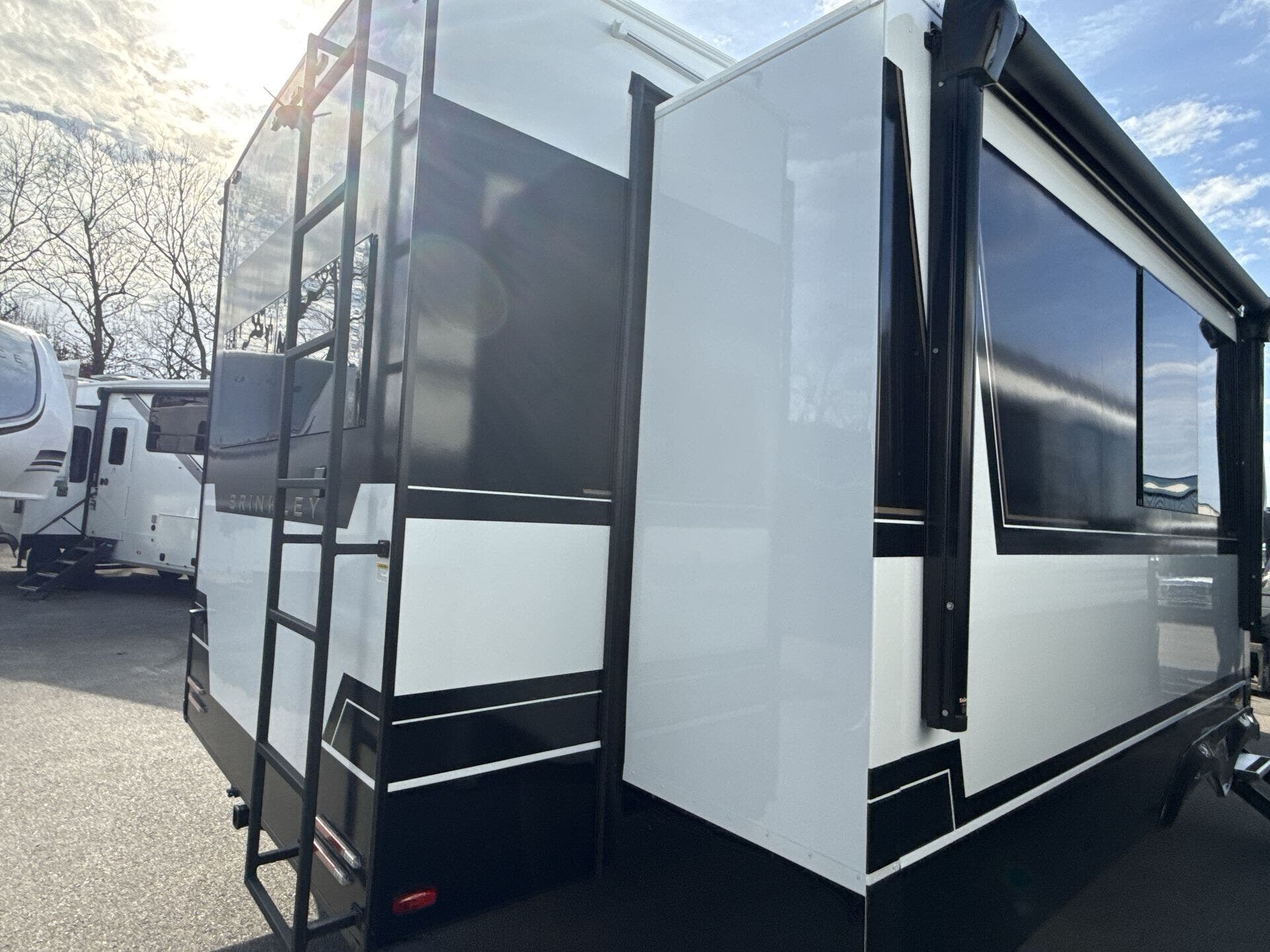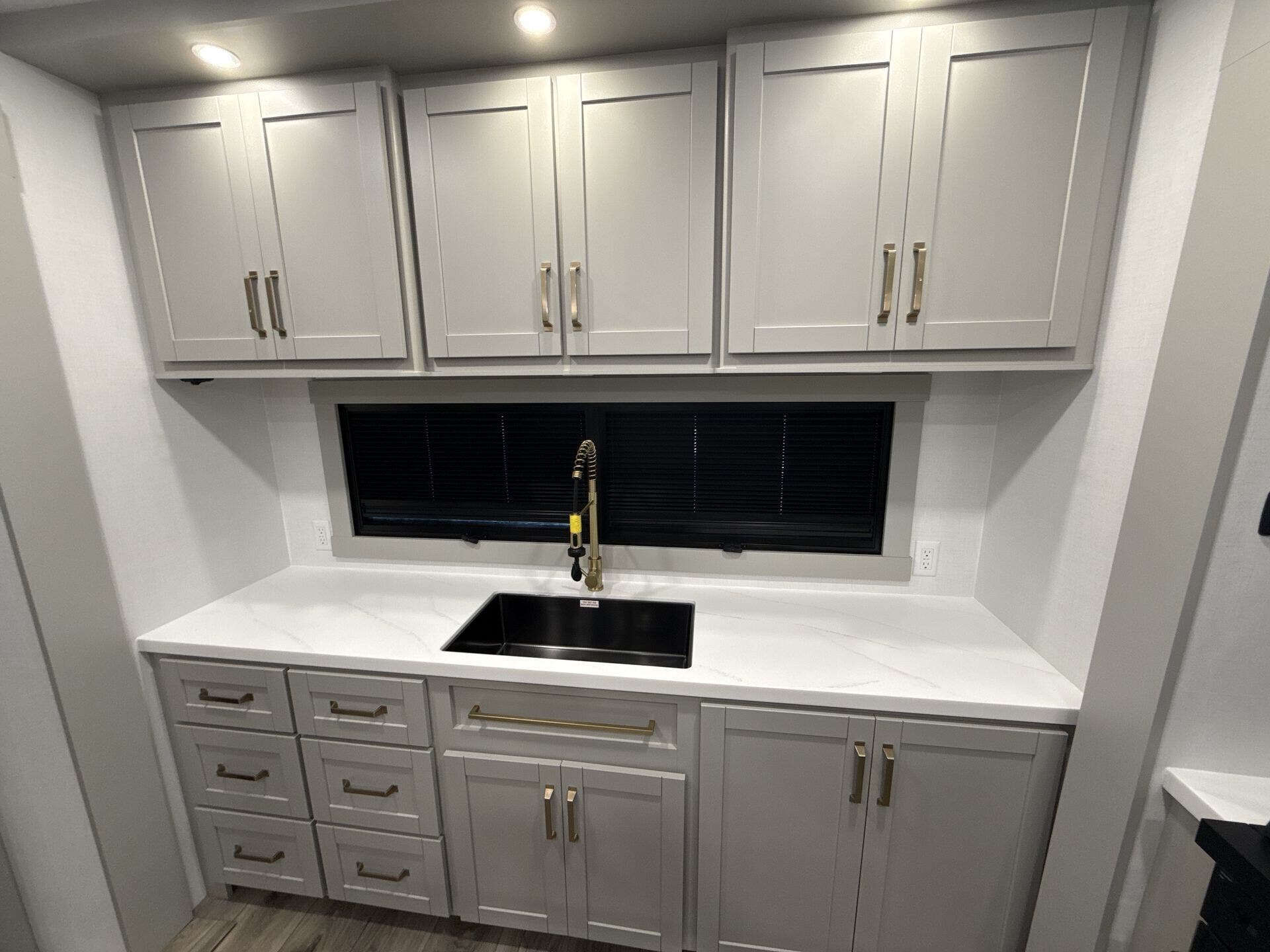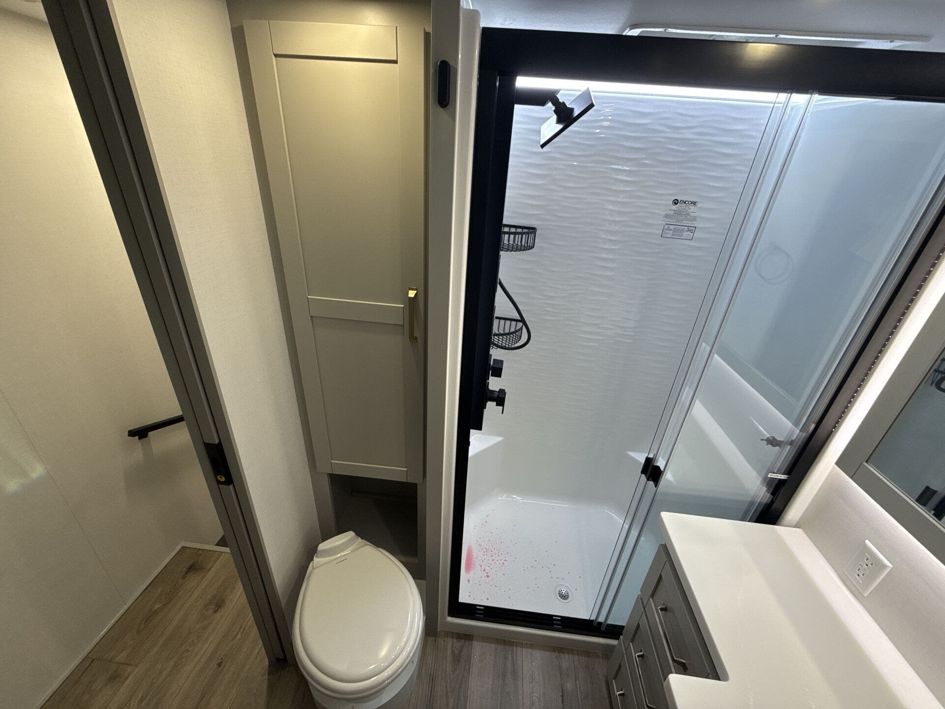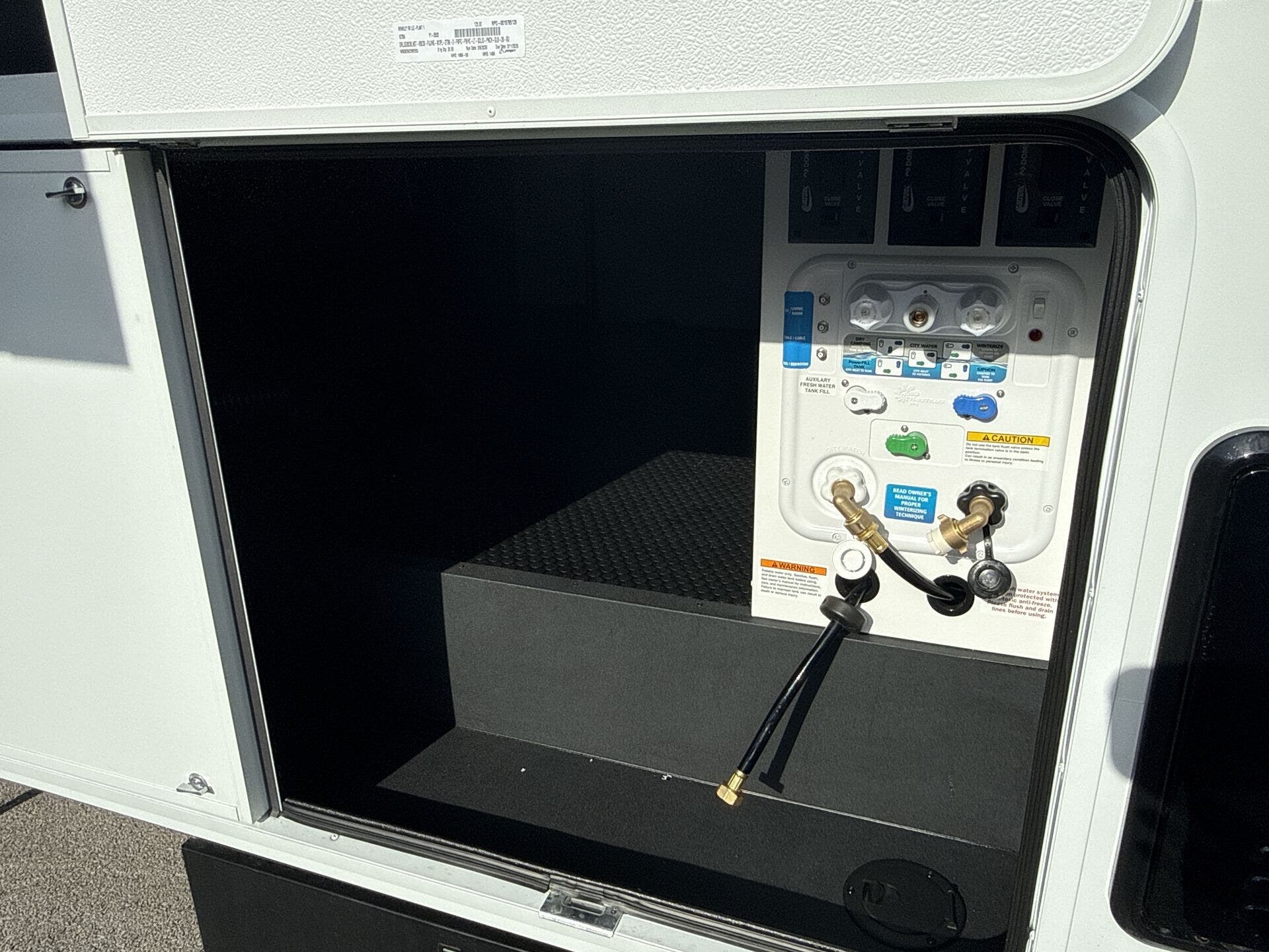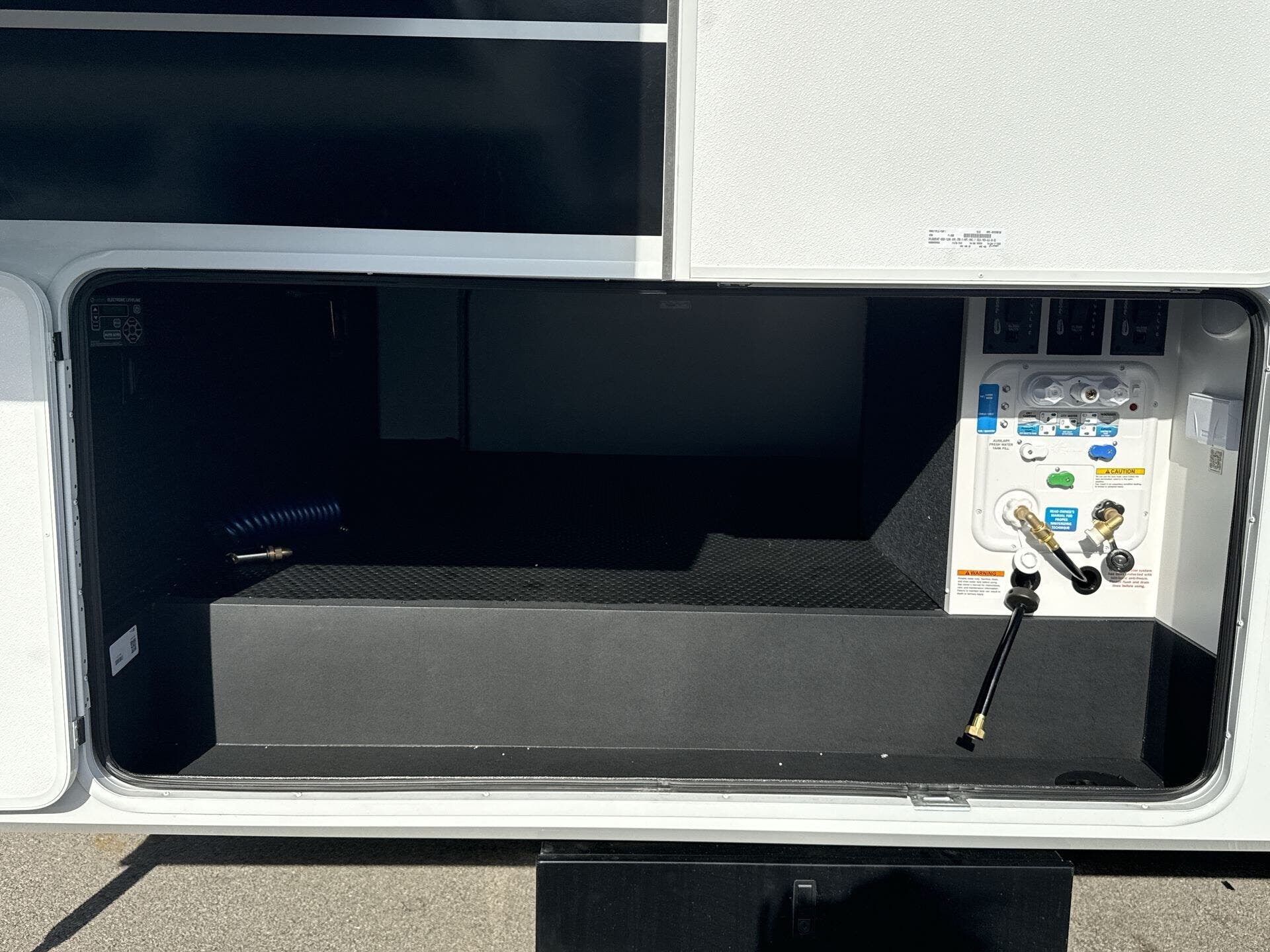 Escape to a world of comfort and luxury with this incredible fifth wheel! The living area features a plush L-sofa, five recliners, and a warm fireplace. The versatile dining table/L desk seats up to four people, making it perfect for meals, work, or play. Ample shoe storage and a convenient spot for pet bowls enhance comfort and practicality. The kitchen offers stunning solid surface countertops, dishwasher prep, a residential microwave, and a three-burner cooktop. The expansive pantry with pull-out drawers provides ample storage for your favorite ingredients and cooking essentials. The full bathroom is a serene oasis, featuring a linen closet for added storage and convenience. The front bedroom is a peaceful sanctuary, featuring a spacious king bed, shelves, and a sliding dresser top with hidden storage. The generous wardrobe and shoe rack provide ample storage for your clothes and shoes.