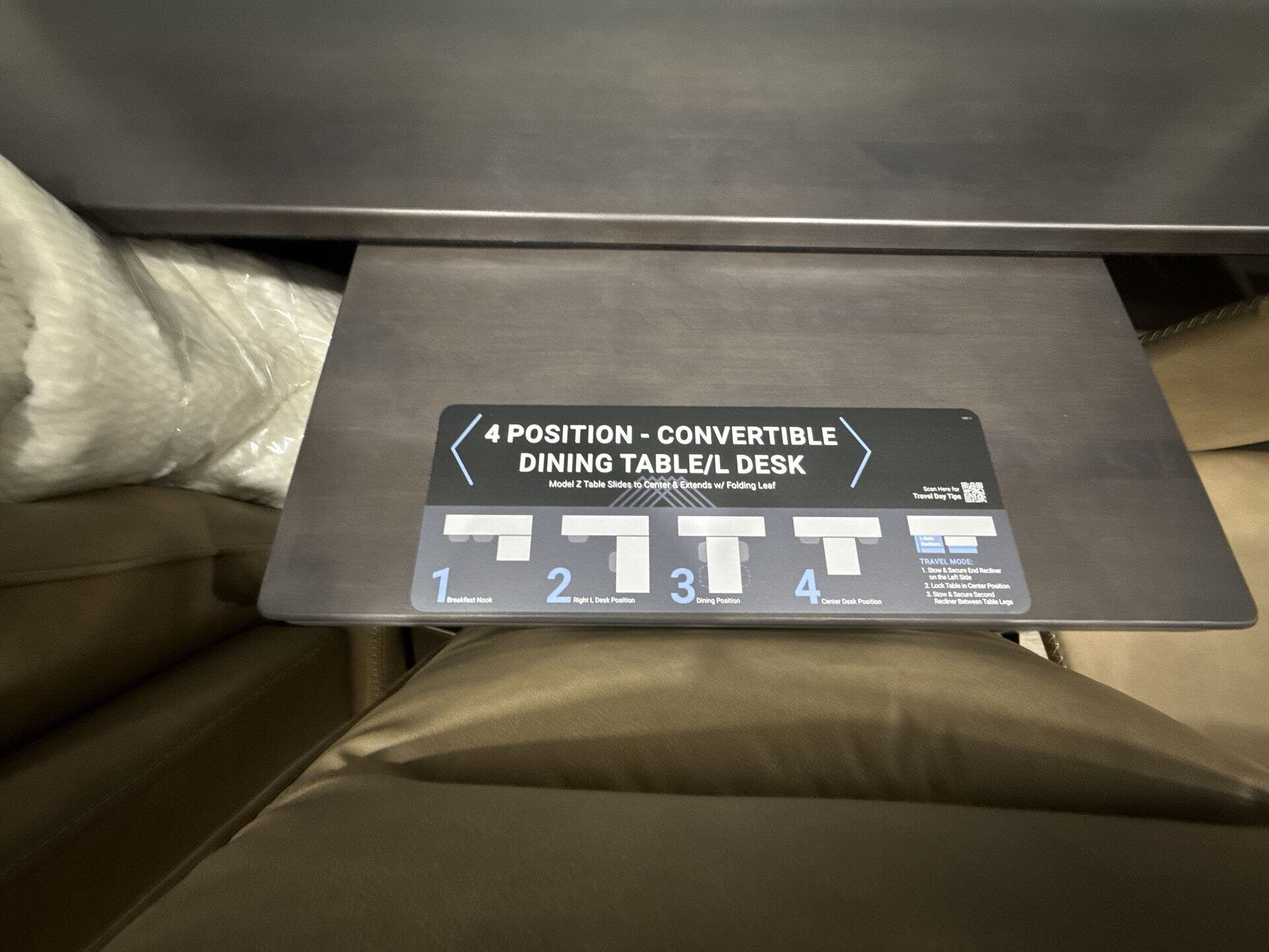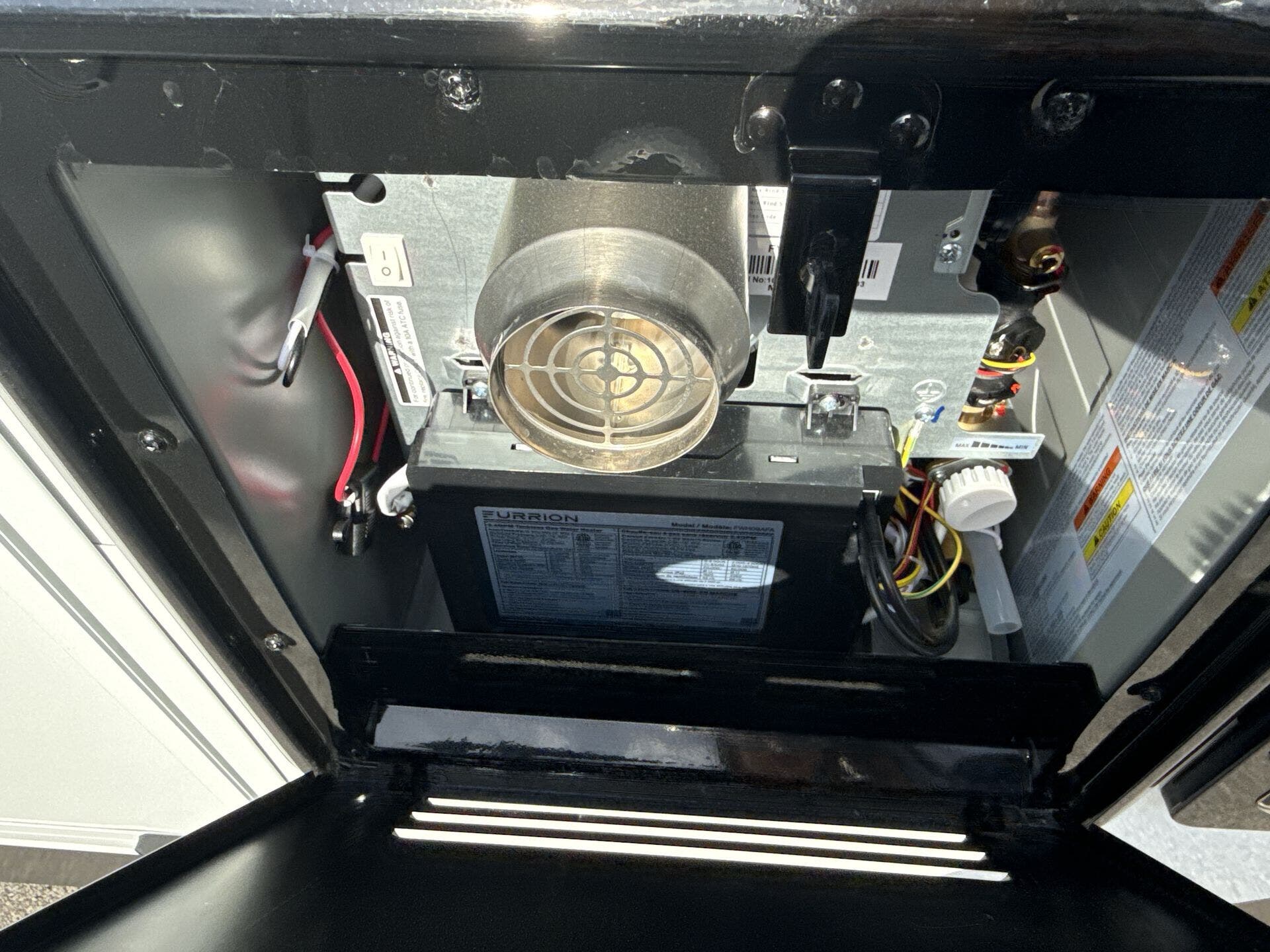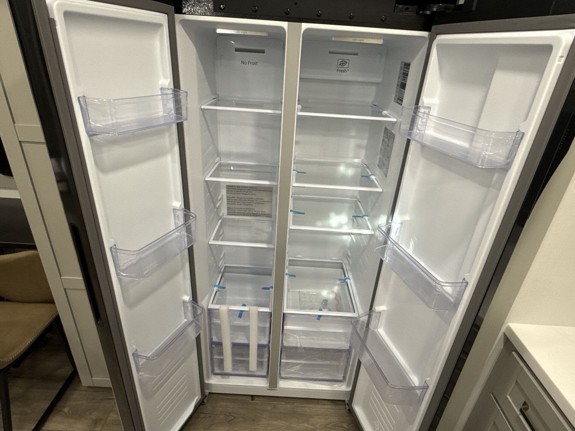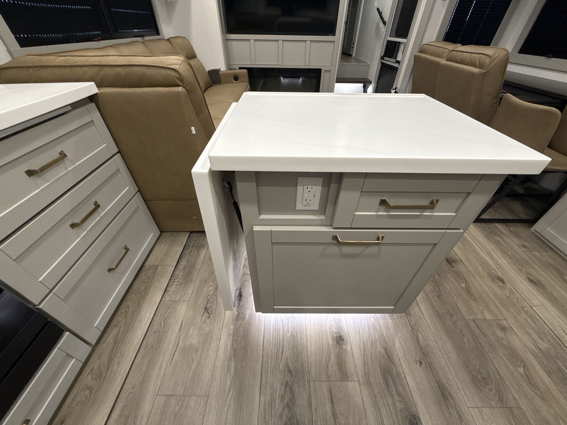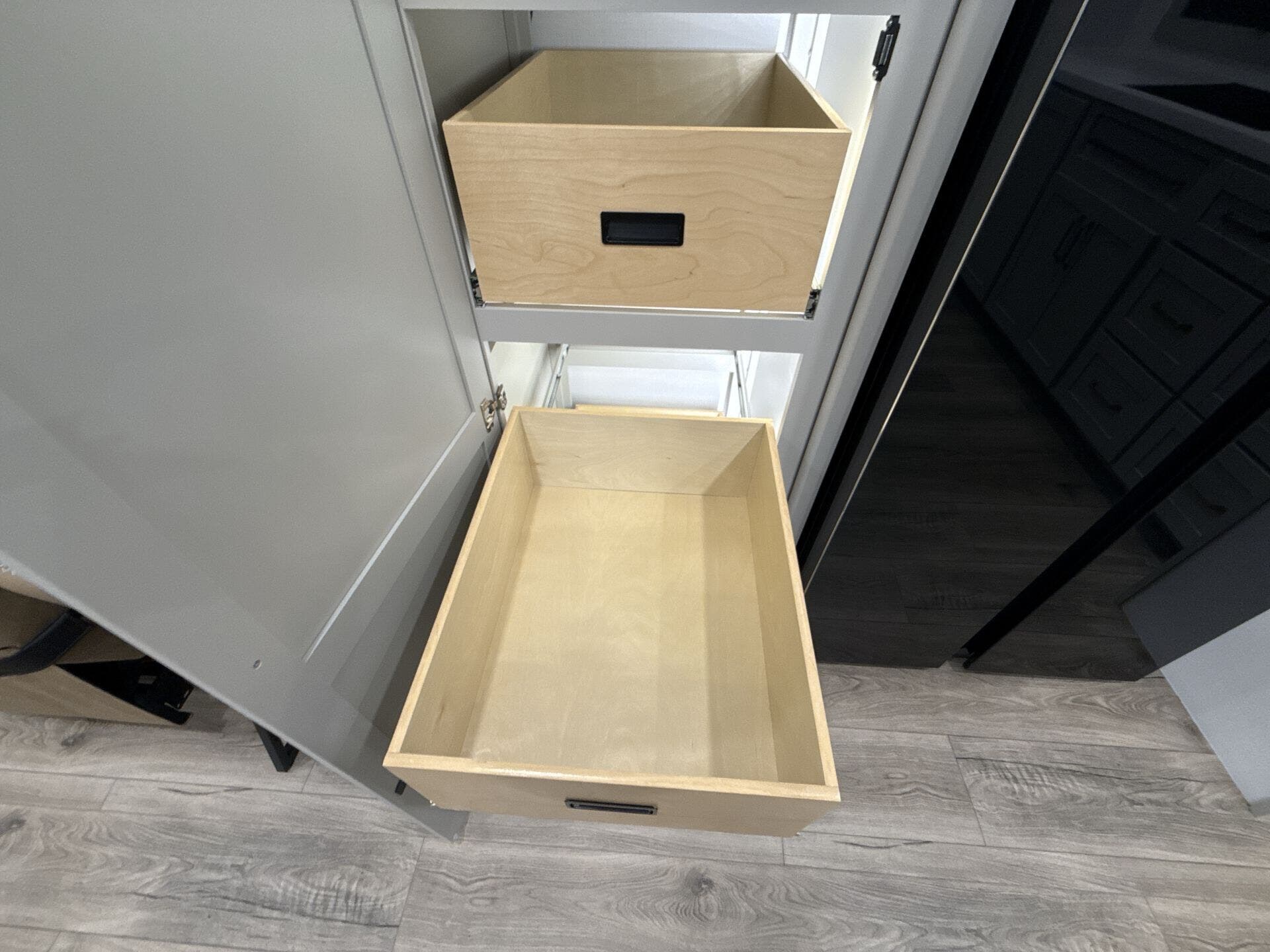 Escape to a world of comfort and luxury with this incredible fifth wheel! The living area features a plush L-sofa, five recliners, and a warm fireplace. The versatile dining table/L desk seats up to four people, making it perfect for meals, work, or play. Ample shoe storage and a convenient spot for pet bowls enhance comfort and practicality. The kitchen offers stunning solid surface countertops, dishwasher prep, a residential microwave, and a three-burner cooktop. The expansive pantry with pull-out drawers provides ample storage for your favorite ingredients and cooking essentials. The full bathroom is a serene oasis, featuring a linen closet for added storage and convenience. The front bedroom is a peaceful sanctuary, featuring a spacious king bed, shelves, and a sliding dresser top with hidden storage. The generous wardrobe and shoe rack provide ample storage for your clothes and shoes.