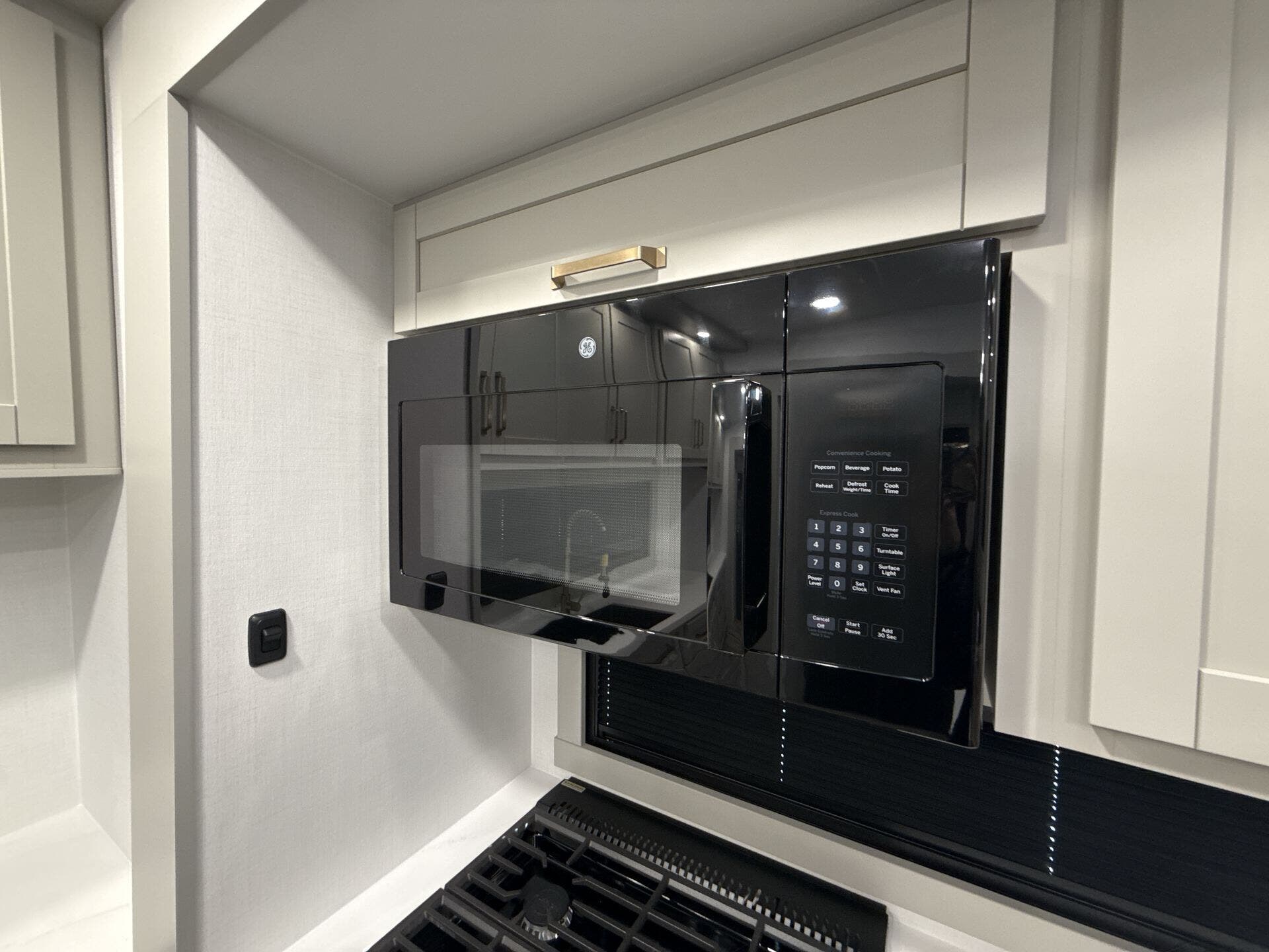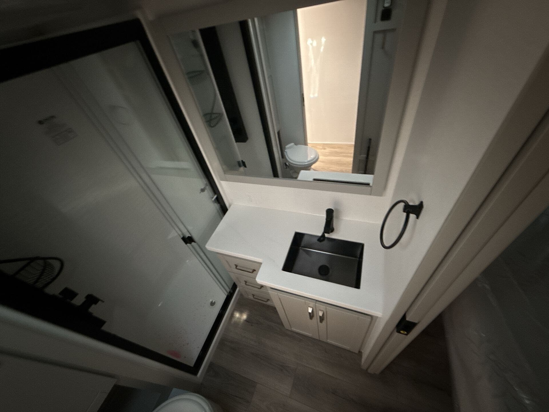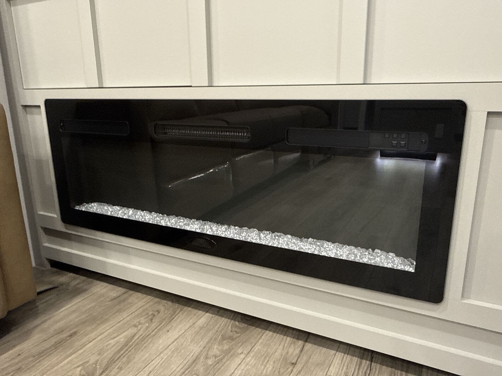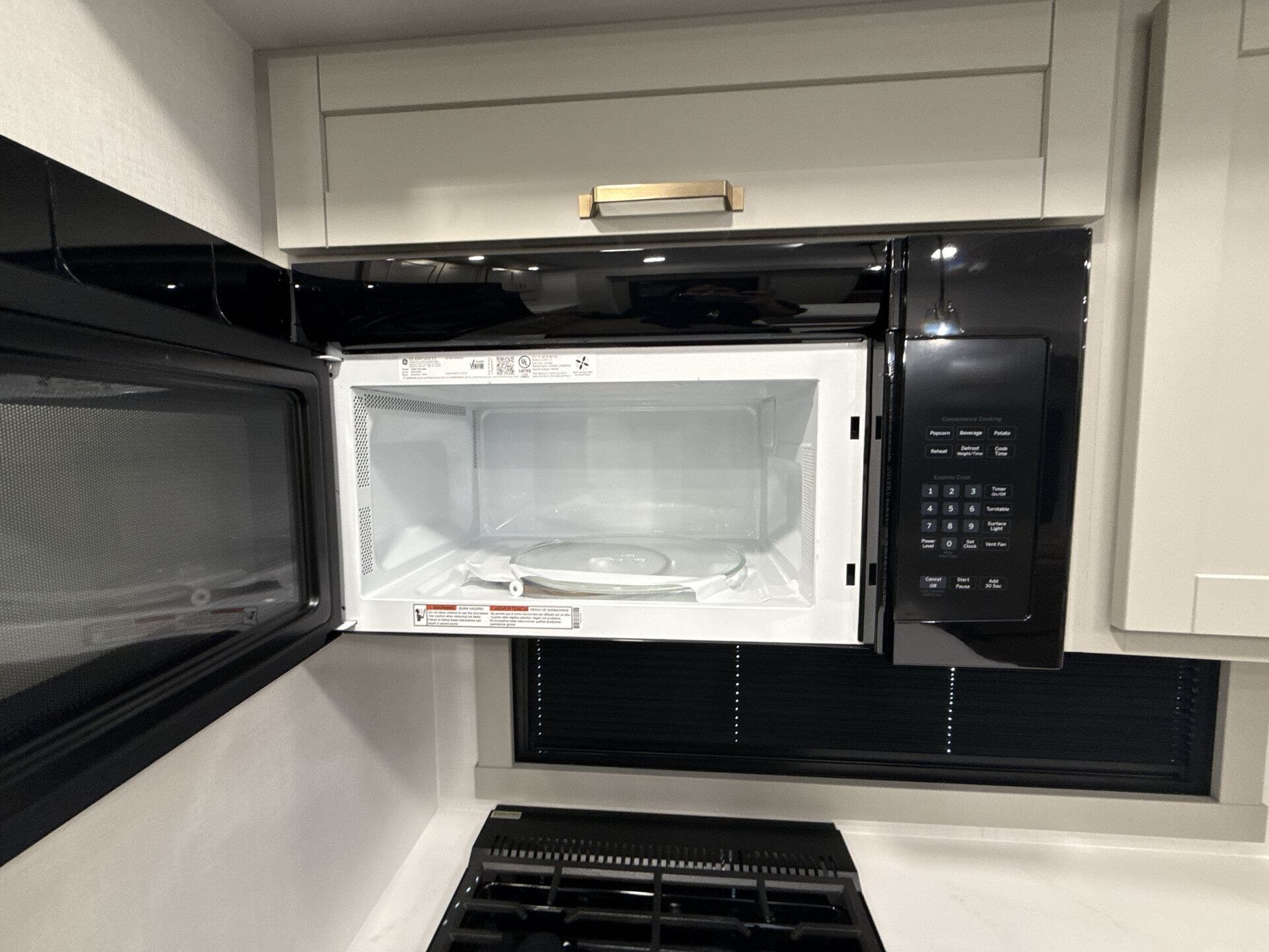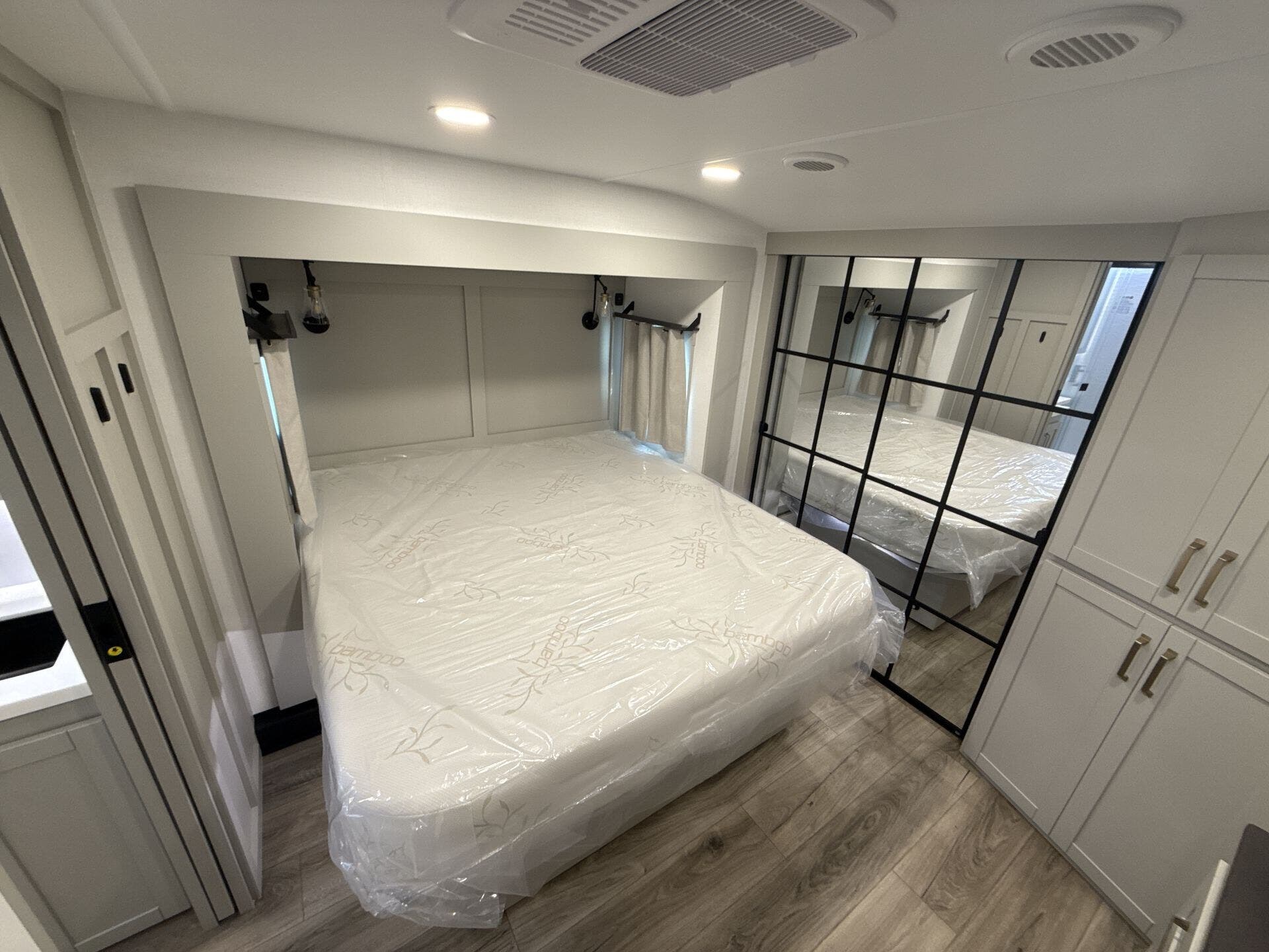Escape to a world of comfort and luxury with this incredible fifth wheel! The living area features a plush L-sofa, five recliners, and a warm fireplace. The versatile dining table/L desk seats up to four people, making it perfect for meals, work, or play. Ample shoe storage and a convenient spot for pet bowls enhance comfort and practicality. The kitchen offers stunning solid surface countertops, dishwasher prep, a residential microwave, and a three-burner cooktop. The expansive pantry with pull-out drawers provides ample storage for your favorite ingredients and cooking essentials. The full bathroom is a serene oasis, featuring a linen closet for added storage and convenience. The front bedroom is a peaceful sanctuary, featuring a spacious king bed, shelves, and a sliding dresser top with hidden storage. The generous wardrobe and shoe rack provide ample storage for your clothes and shoes.