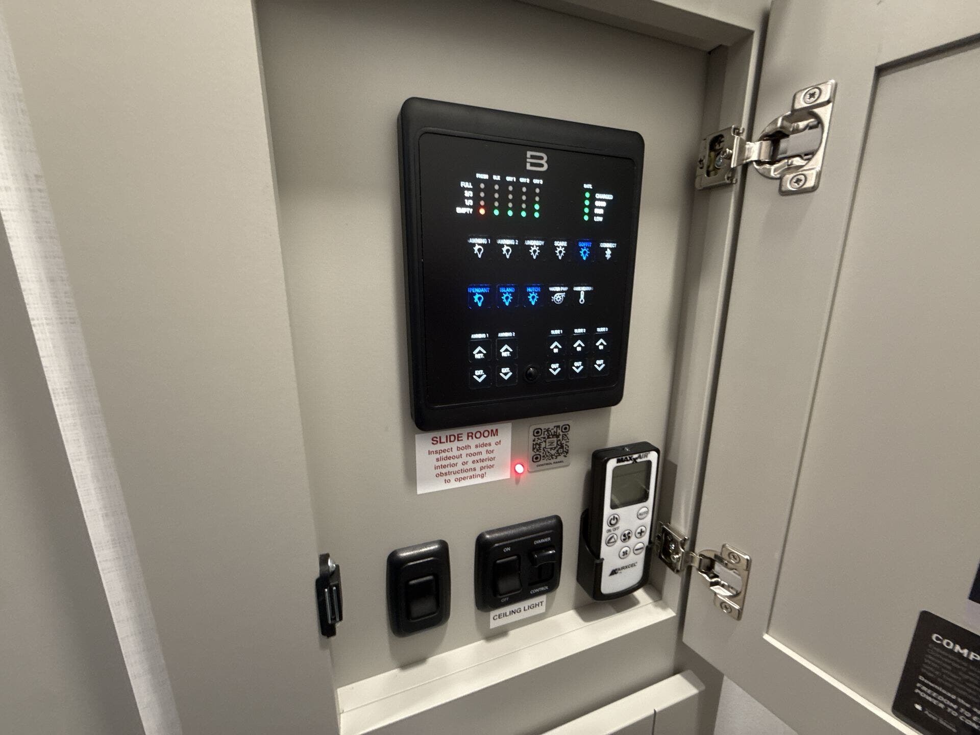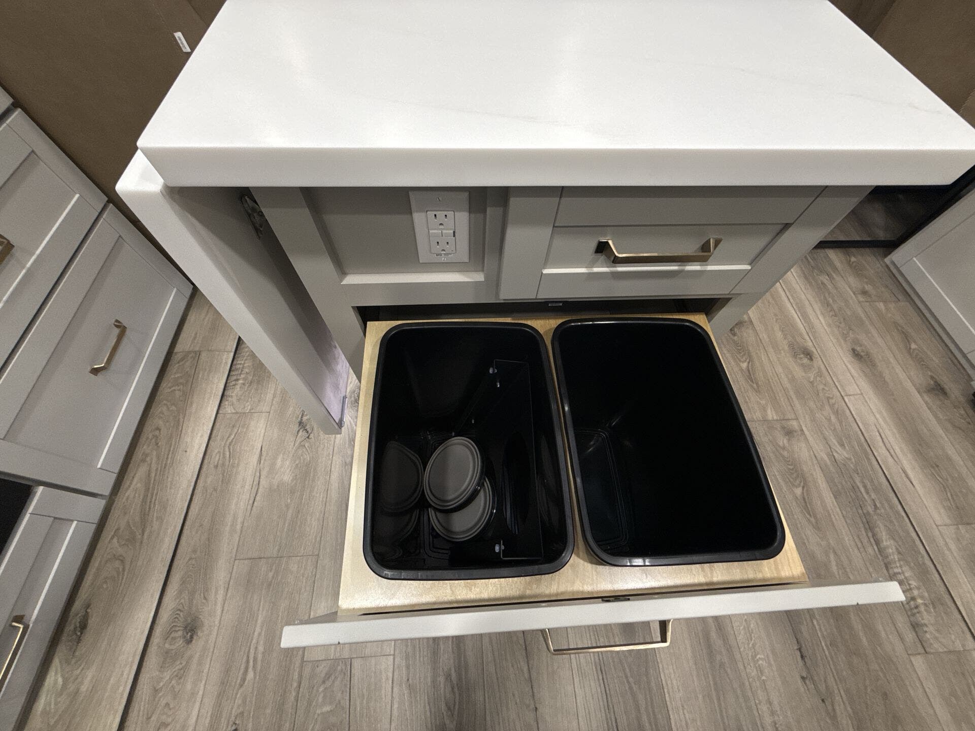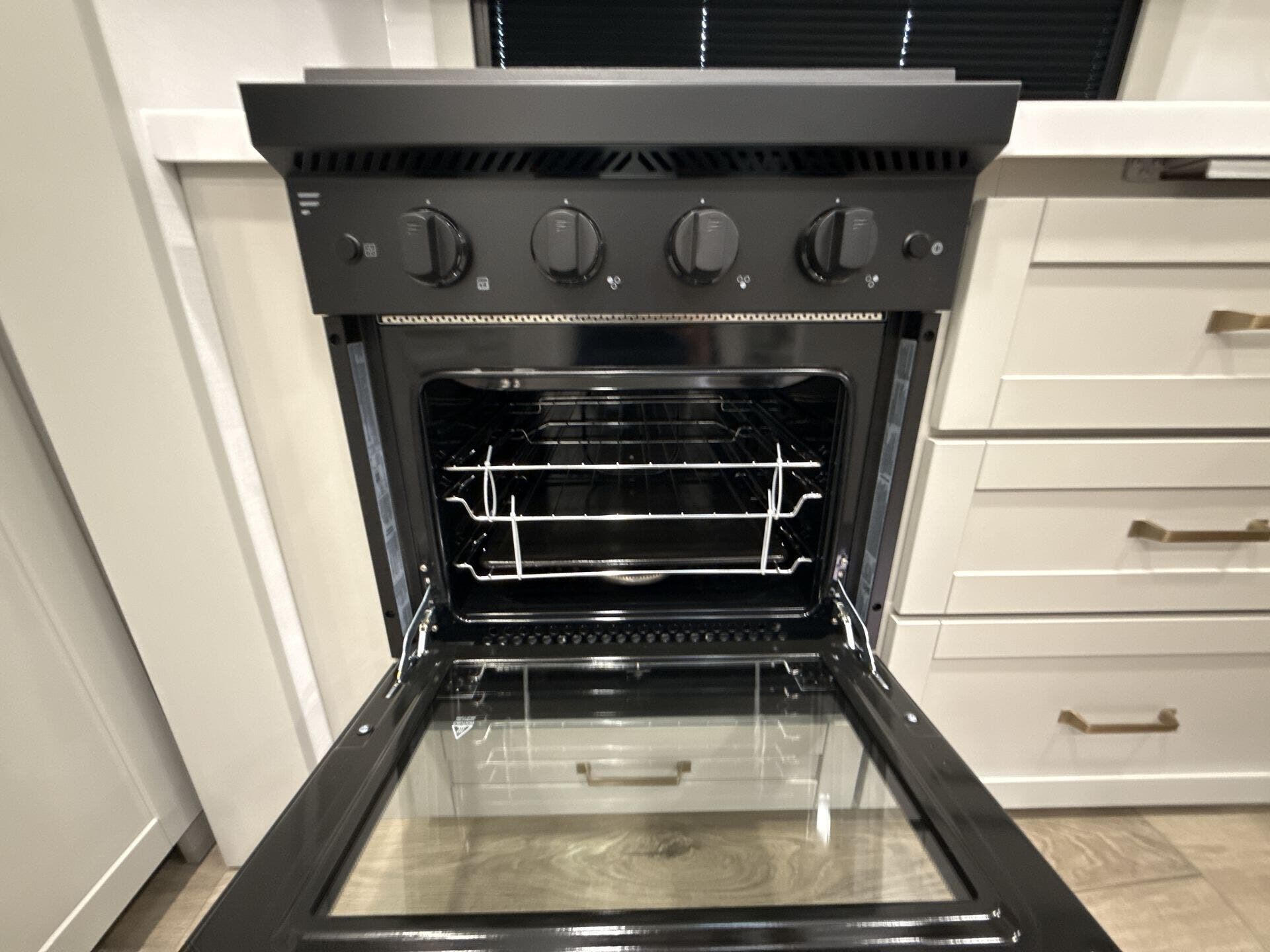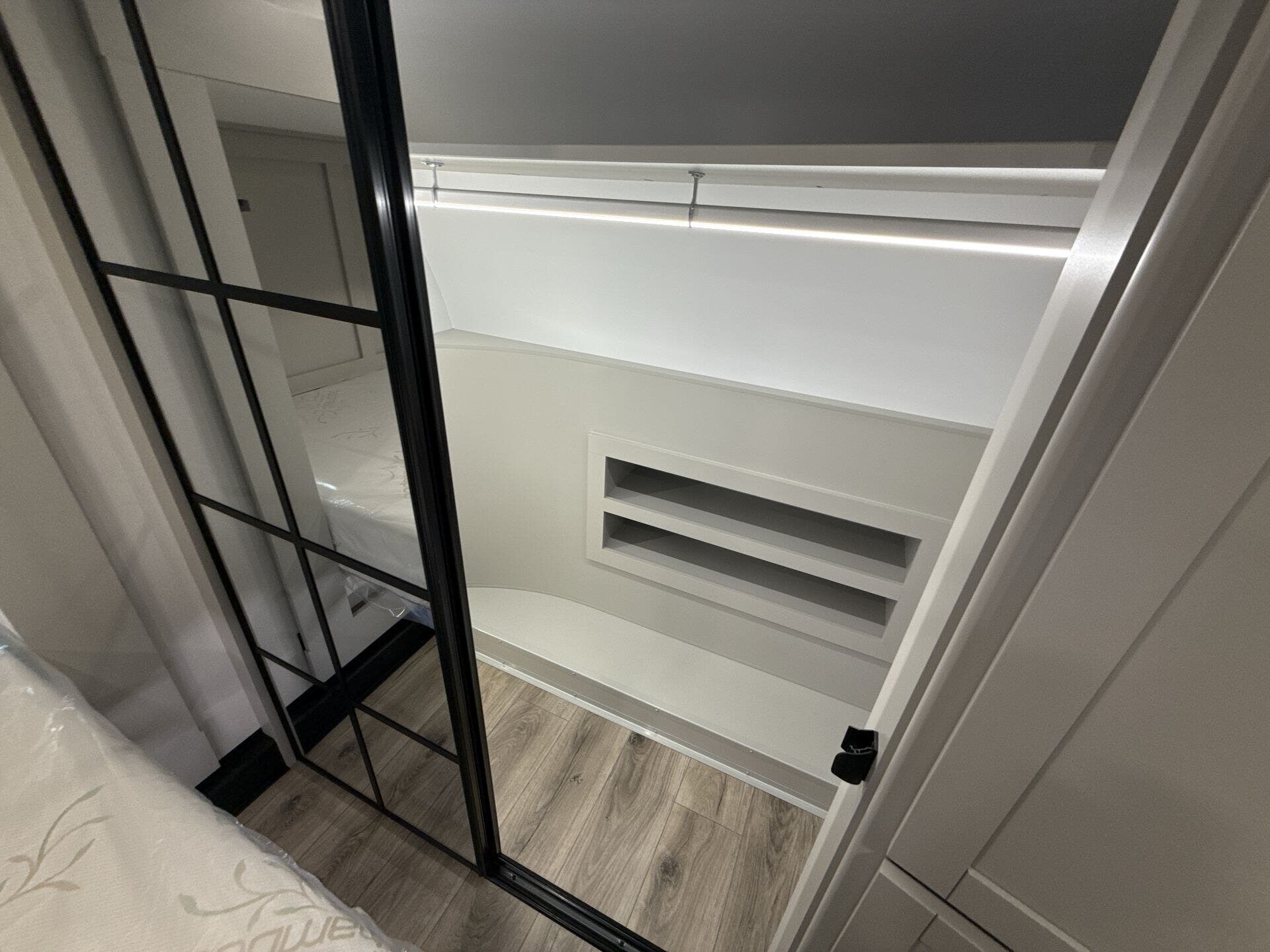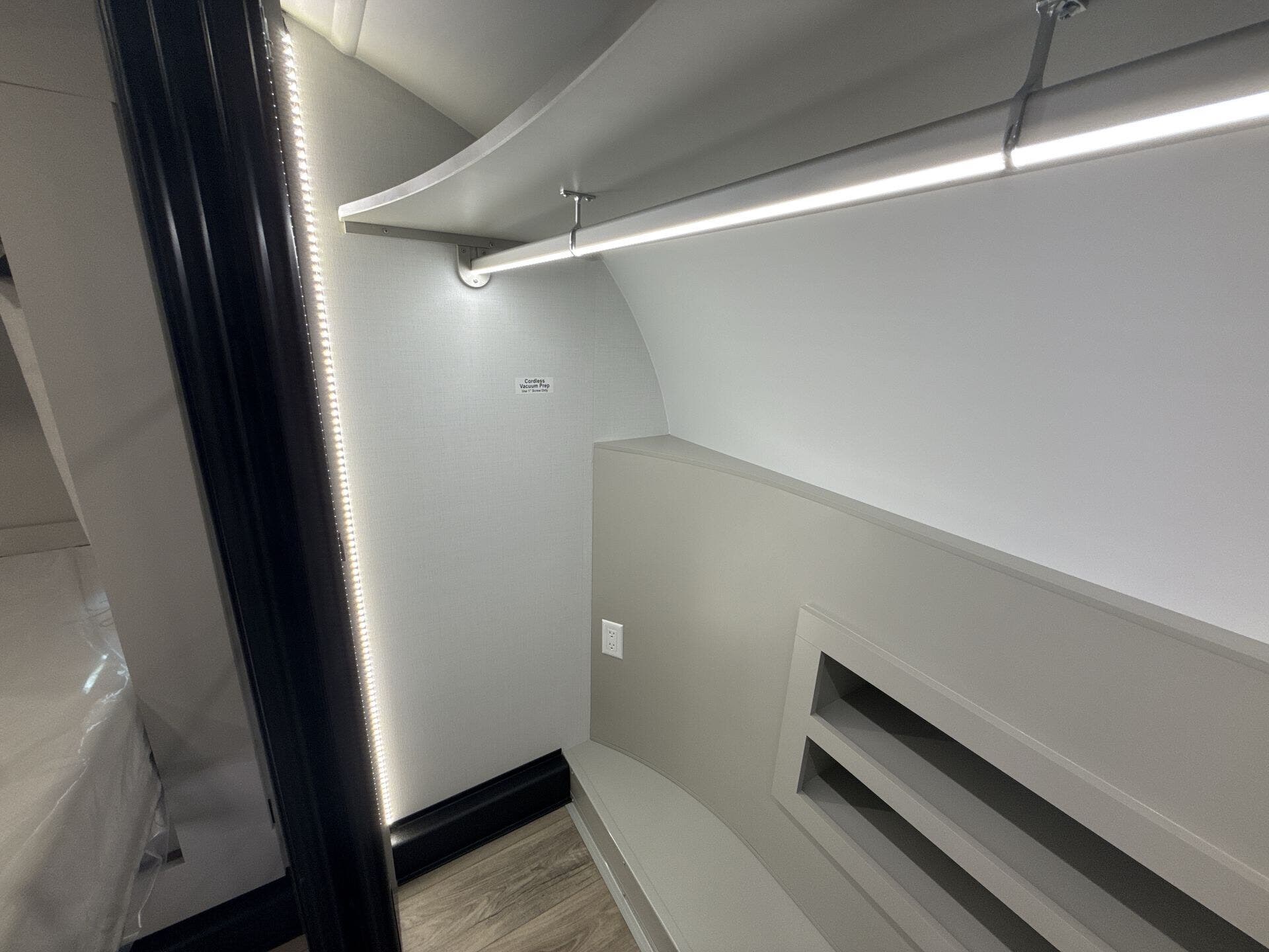 Escape to a world of comfort and luxury with this incredible fifth wheel! The living area features a plush L-sofa, five recliners, and a warm fireplace. The versatile dining table/L desk seats up to four people, making it perfect for meals, work, or play. Ample shoe storage and a convenient spot for pet bowls enhance comfort and practicality. The kitchen offers stunning solid surface countertops, dishwasher prep, a residential microwave, and a three-burner cooktop. The expansive pantry with pull-out drawers provides ample storage for your favorite ingredients and cooking essentials. The full bathroom is a serene oasis, featuring a linen closet for added storage and convenience. The front bedroom is a peaceful sanctuary, featuring a spacious king bed, shelves, and a sliding dresser top with hidden storage. The generous wardrobe and shoe rack provide ample storage for your clothes and shoes.