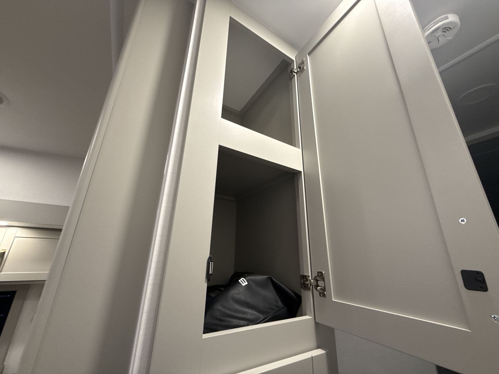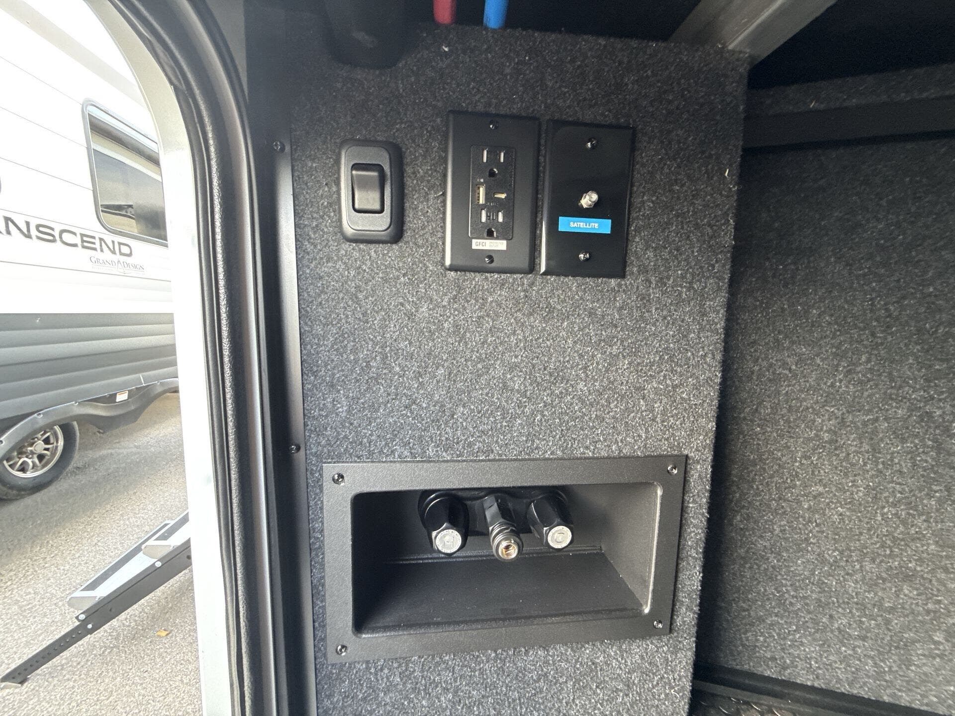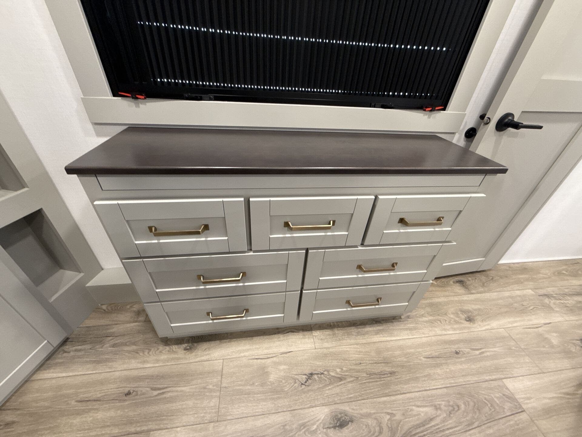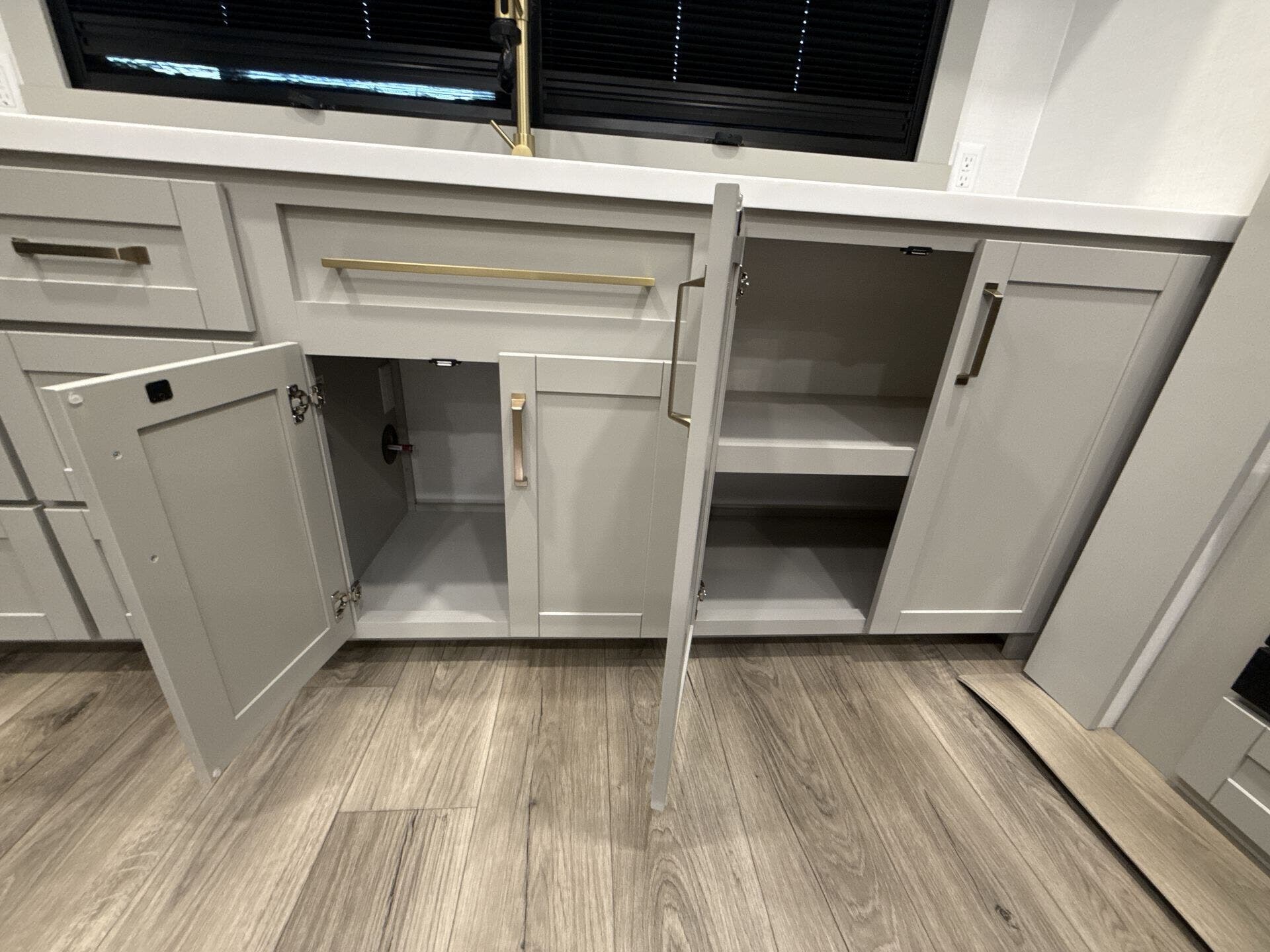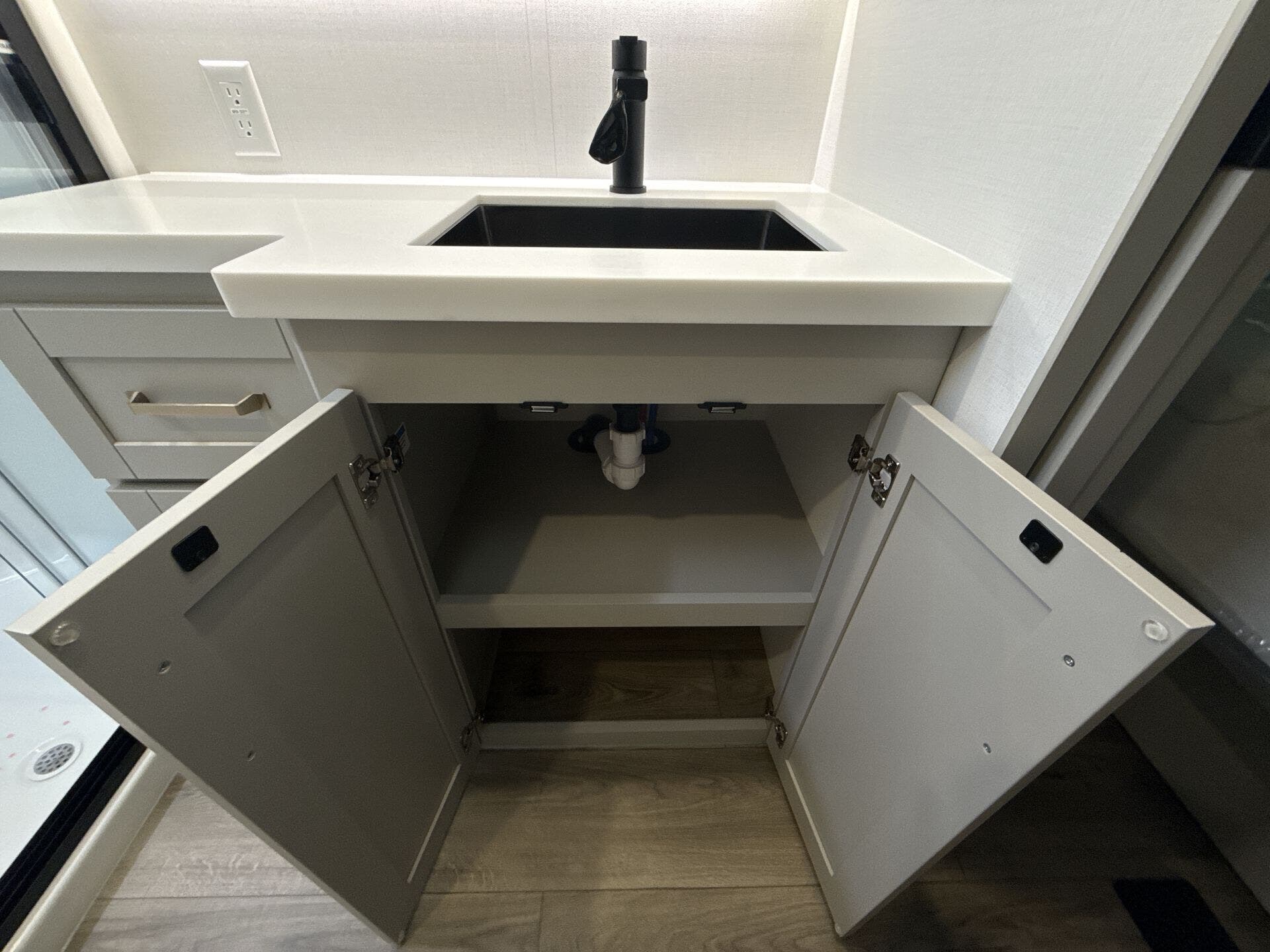 Escape to a world of comfort and luxury with this incredible fifth wheel! The living area features a plush L-sofa, five recliners, and a warm fireplace. The versatile dining table/L desk seats up to four people, making it perfect for meals, work, or play. Ample shoe storage and a convenient spot for pet bowls enhance comfort and practicality. The kitchen offers stunning solid surface countertops, dishwasher prep, a residential microwave, and a three-burner cooktop. The expansive pantry with pull-out drawers provides ample storage for your favorite ingredients and cooking essentials. The full bathroom is a serene oasis, featuring a linen closet for added storage and convenience. The front bedroom is a peaceful sanctuary, featuring a spacious king bed, shelves, and a sliding dresser top with hidden storage. The generous wardrobe and shoe rack provide ample storage for your clothes and shoes.