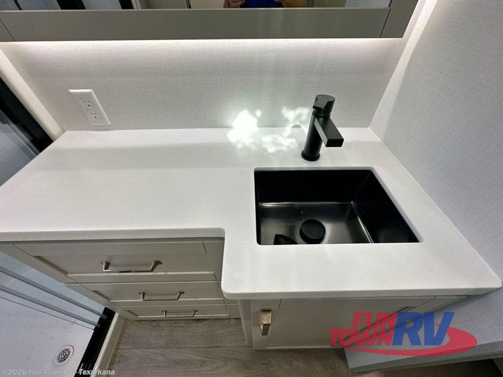 You're going to love every minute spent in this triple slide out fifth wheel! The chef will find everything they need in the kitchen, including a 30" residential microwave, 16 cu. ft. 12V refrigerator, plus a large kitchen island, complete with dual trash bins and dog bowls at the foot. Your crew can get cozy on the tri-fold sofa that extends to a 54" x 70" bed for guests, and there is theater seating across from the televator and fireplace for easy viewing! You will find the front private bedroom ultra accommodating with its king bed slide out, sliding dresser top with hidden storage, your own TV, and a front wardrobe with shelves and a shoe rack. There is even washer and dryer prep if you want the option to make laundry day that much easier!
