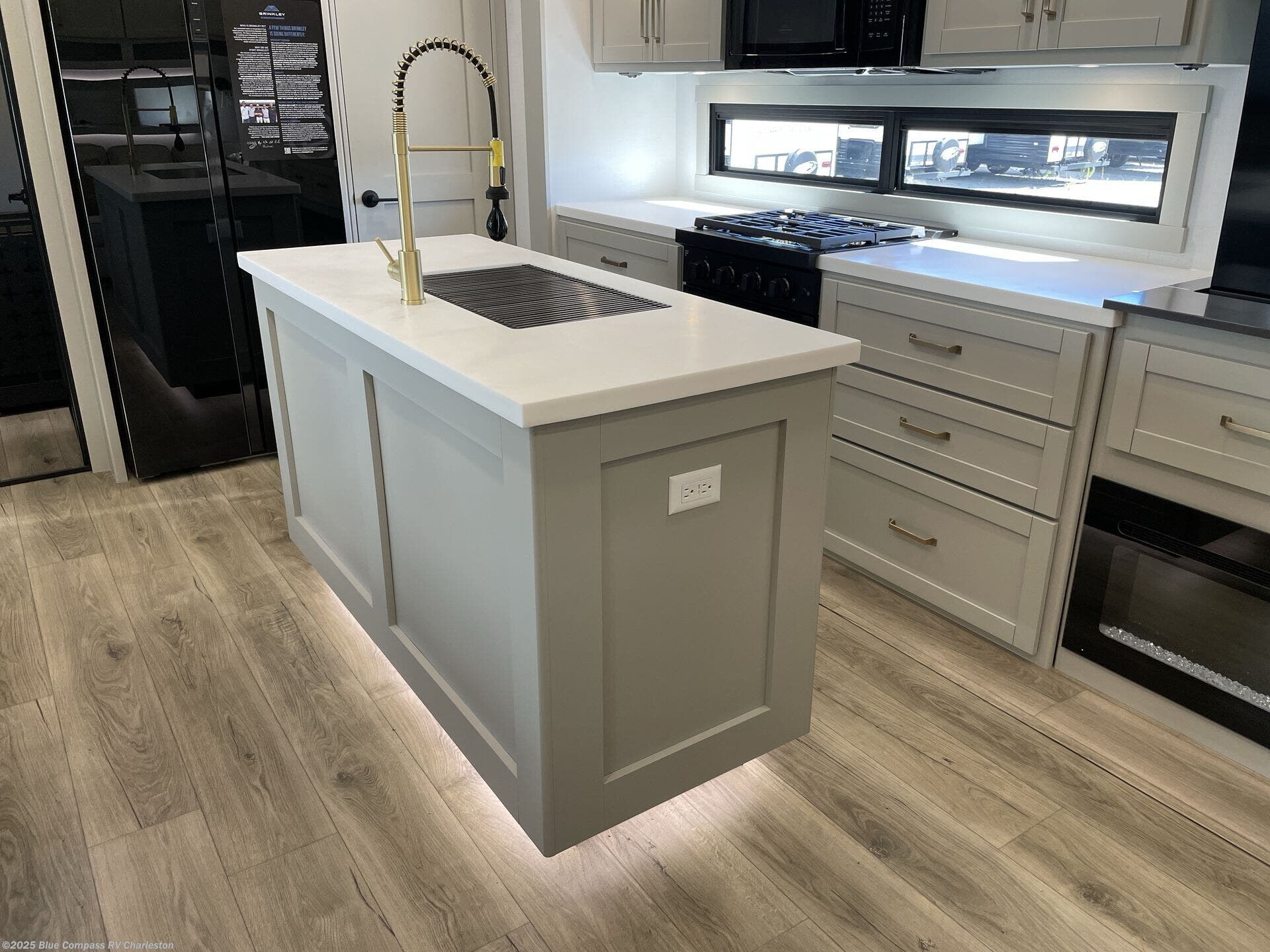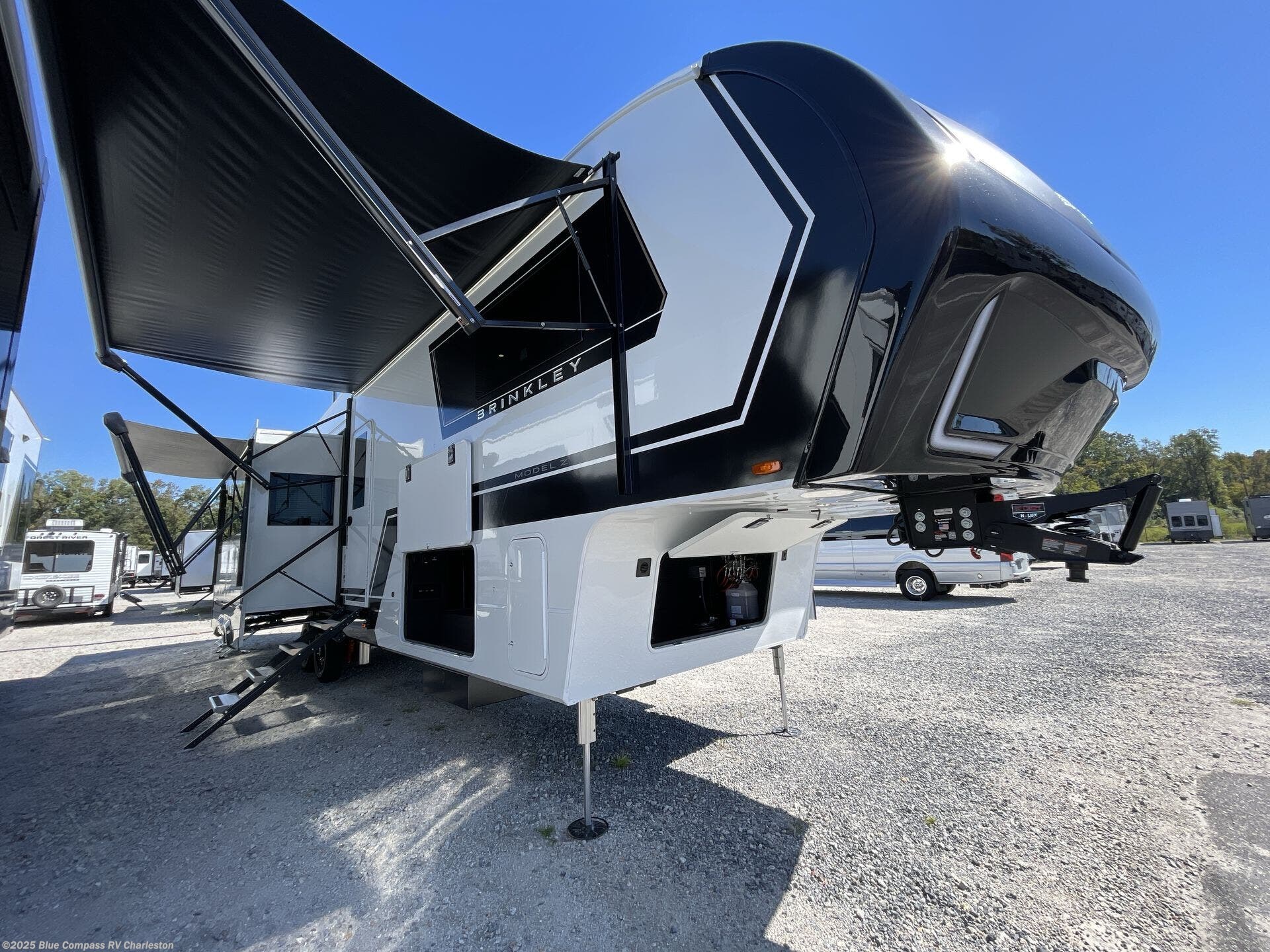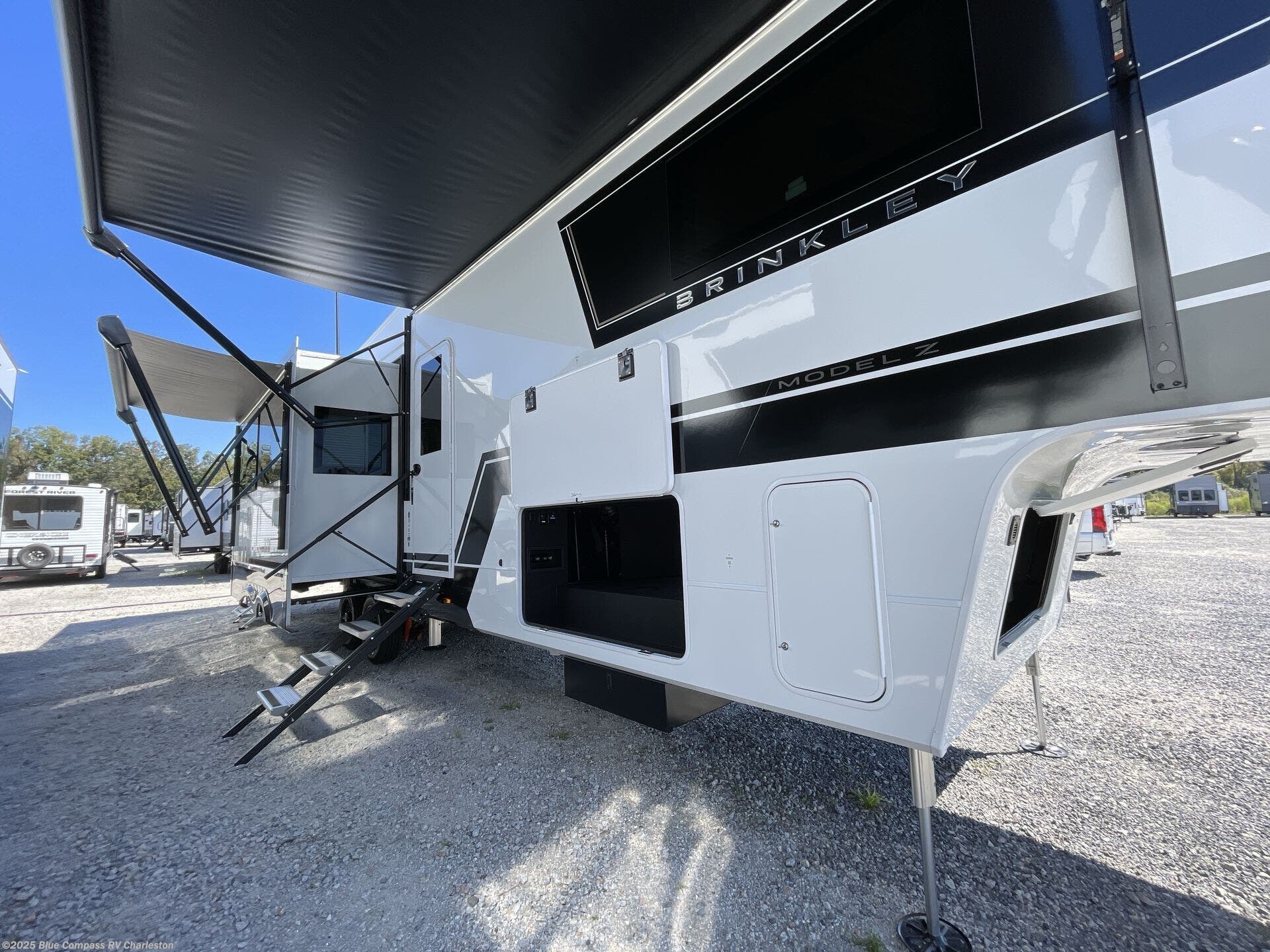 The Brinkley mid-profile Model Z fifth wheels bring you clean lines and an upscale look with plenty of style and exciting new features like the industry first brass plumbing connections. These units also feature an automotive grade front cap, plenty of exterior storage, exterior hot and cold showers, and wide stance leveling jacks for easy set up. Residential frameless windows provide a clean look and beautiful views, and ample electrical outlets and 6 USB/USB-C outlets allow all of your electronics and appliances to easily be used and charged.