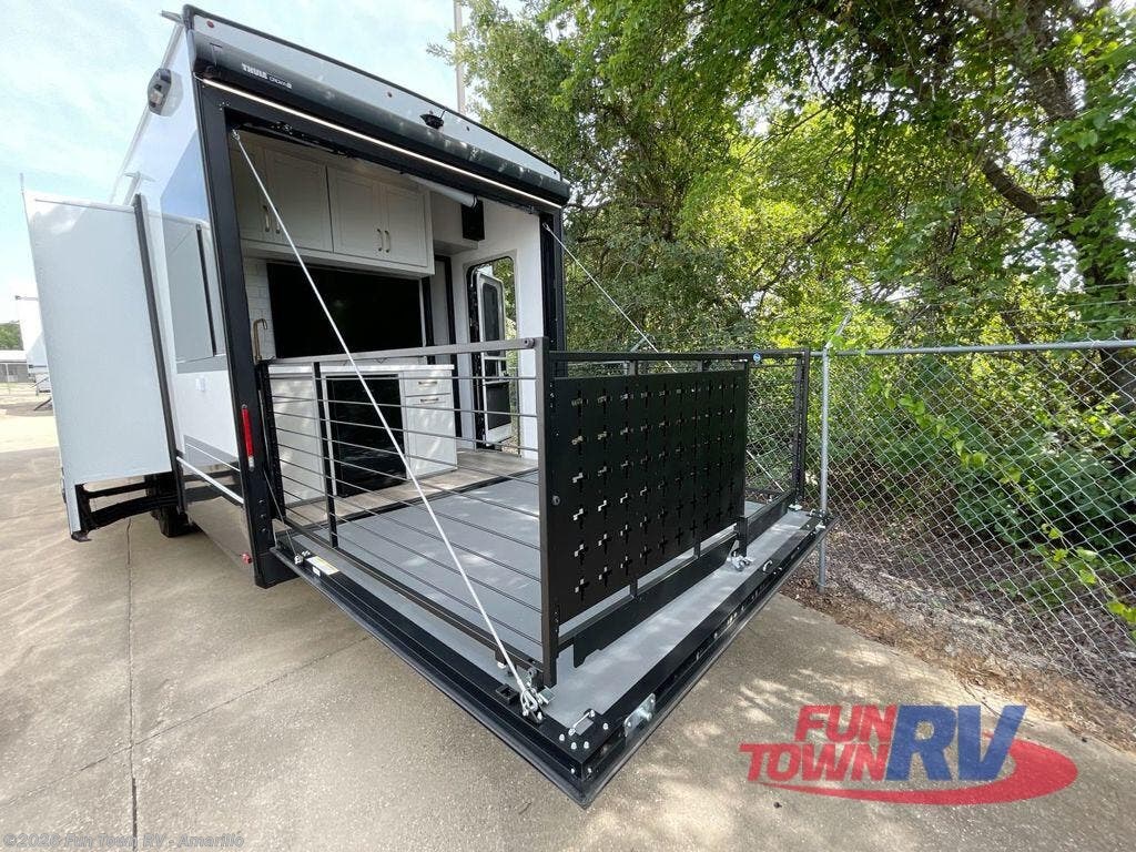 You're going to love every minute spent in this triple slide out fifth wheel! Once you arrive at the campground, you can put out the two side awnings, set up the rear patio and awning, then make lunch on the outdoor kitchen! There is also an outdoor TV here, a bar sink, and a refrigerator to keep drinks close by! Inside, the chef will find everything they need if the weather isn't cooperating, including a 30" residential microwave, 16 cu. ft. refrigerator, plus a large kitchen island, complete with dual trash bins and dog bowls at the foot. Your crew can get cozy on the tri-fold sofa that extends to a 54" x 70" bed for guests, and there is theater seating across from the televator and fireplace for easy viewing! You will find the front private bedroom ultra accommodating with its king bed slide out, sliding dresser top with hidden storage, your own TV, and a front wardrobe with shelves and a shoe rack. There is even washer and dryer prep if you want the option to make laundry day that much easier!