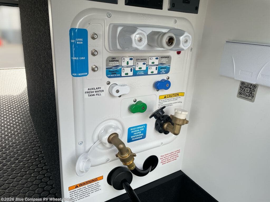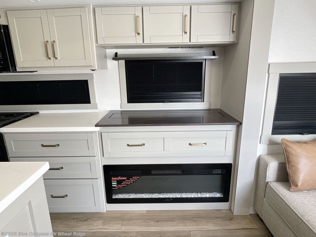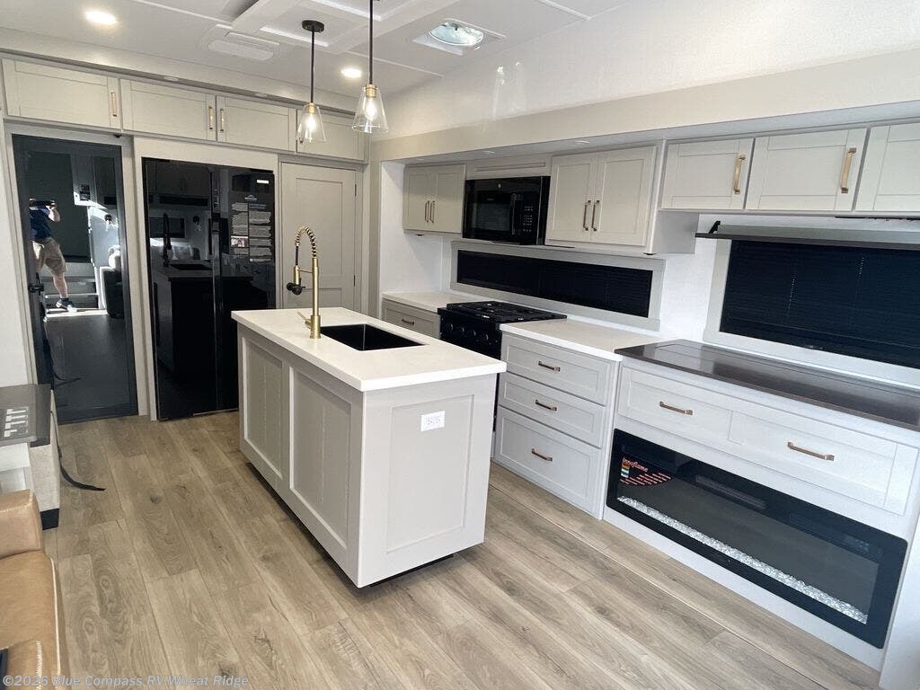 You're going to love every minute spent in this triple slide out fifth wheel! Once you arrive at the campground, you can put out the two side awnings, set up the rear patio and awning, then make lunch on the outdoor kitchen! There is also an outdoor TV here, a bar sink, and a refrigerator to keep drinks close by! Inside, the chef will find everything they need if the weather isn't cooperating, including a 30" residential microwave, 16 cu. ft. refrigerator, plus a large kitchen island, complete with dual trash bins and dog bowls at the foot. Your crew can get cozy on the tri-fold sofa that extends to a 54" x 70" bed for guests, and there is theater seating across from the televator and fireplace for easy viewing! You will find the front private bedroom ultra accommodating with its king bed slide out, sliding dresser top with hidden storage, your own TV, and a front wardrobe with shelves and a shoe rack. There is even washer and dryer prep if you want the option to make laundry day that much easier!
