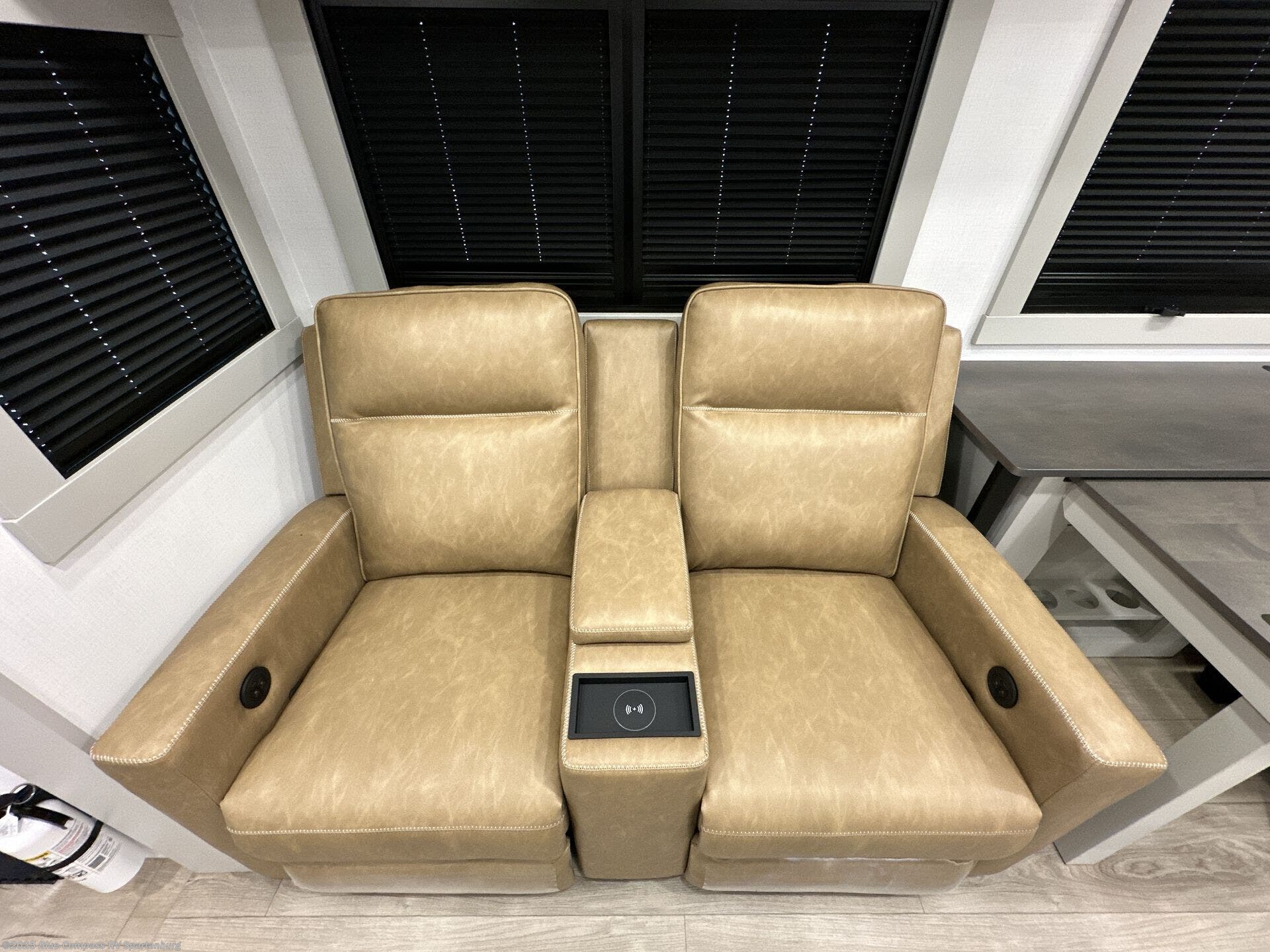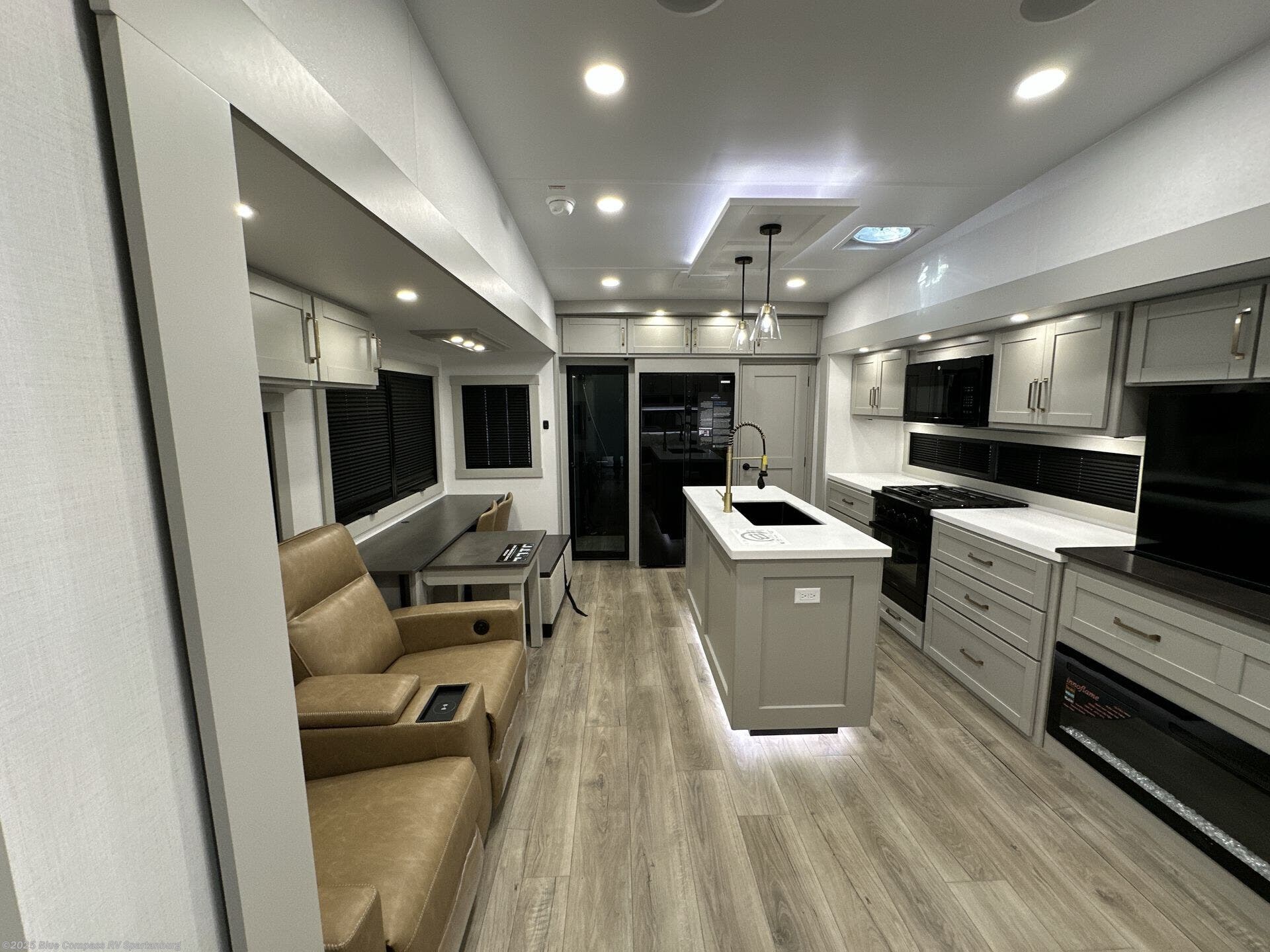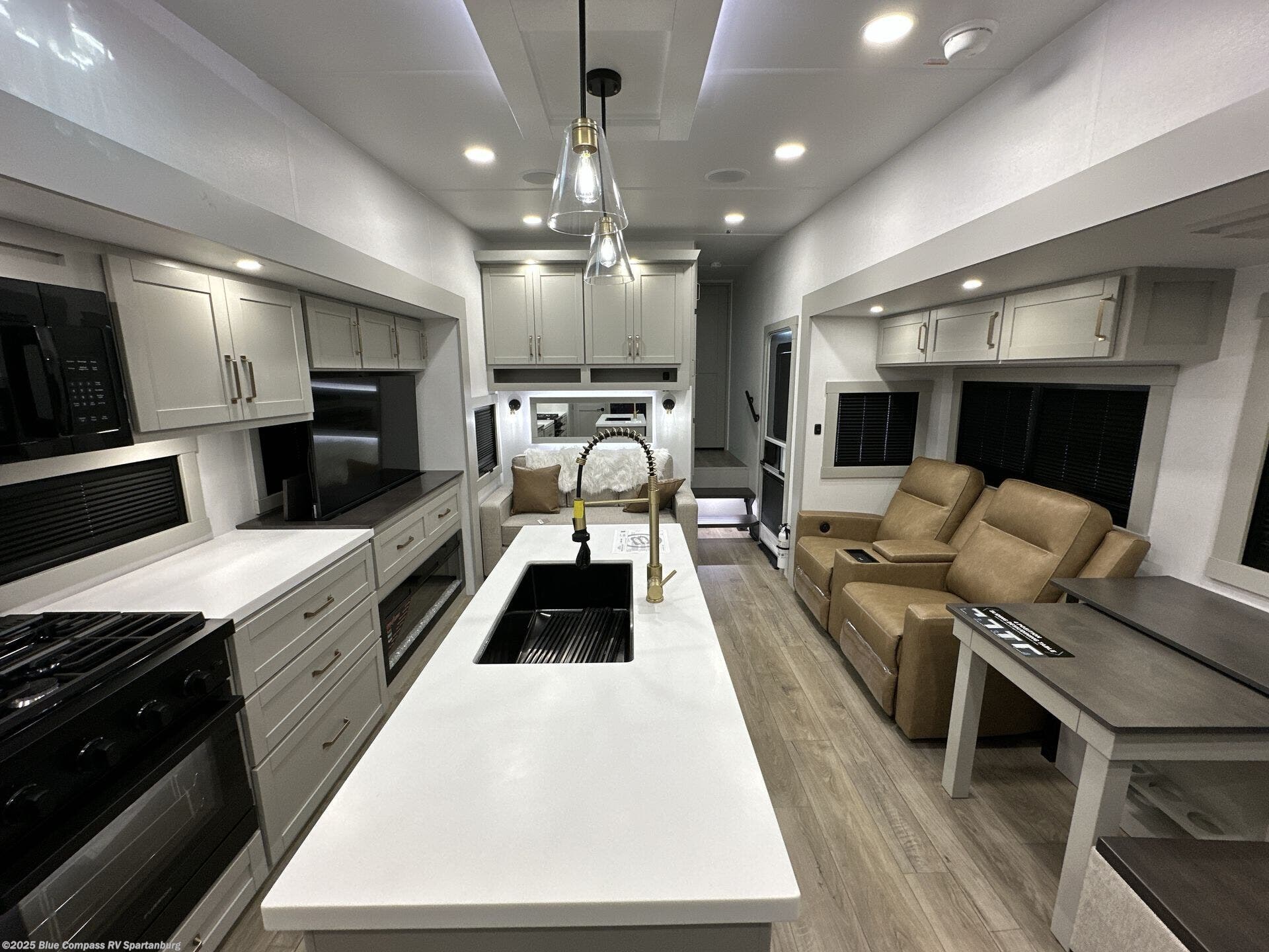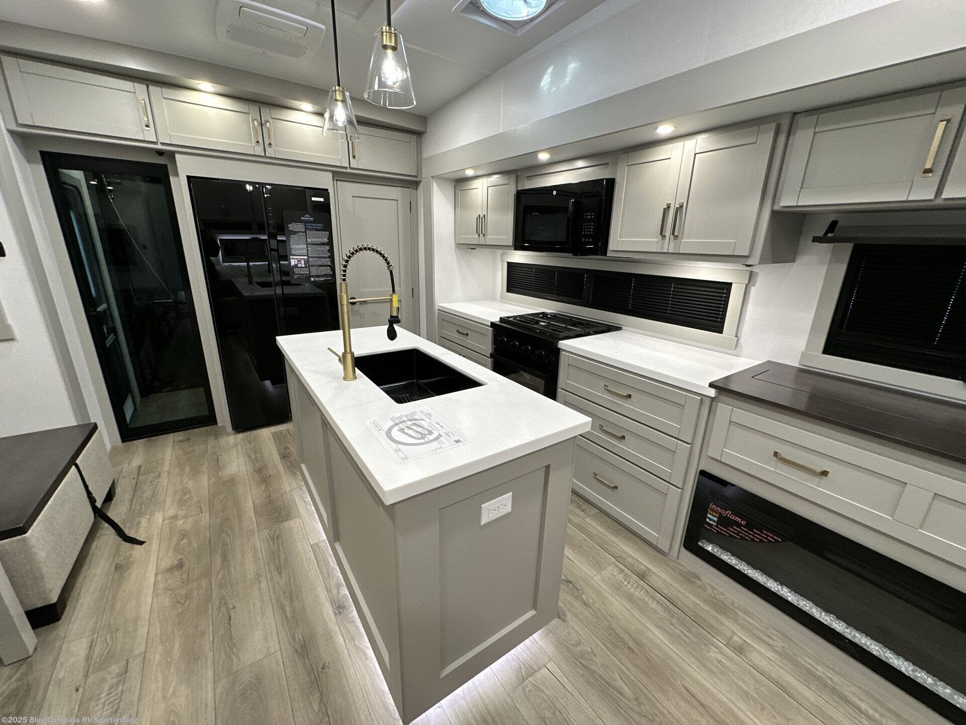 You're going to love every minute spent in this triple slide out fifth wheel! Once you arrive at the campground, you can put out the two side awnings, set up the rear patio and awning, then make lunch on the outdoor kitchen! There is also an outdoor TV here, a bar sink, and a refrigerator to keep drinks close by! Inside, the chef will find everything they need if the weather isn't cooperating, including a 30" residential microwave, 16 cu. ft. refrigerator, plus a large kitchen island, complete with dual trash bins and dog bowls at the foot. Your crew can get cozy on the tri-fold sofa that extends to a 54" x 70" bed for guests, and there is theater seating across from the televator and fireplace for easy viewing! You will find the front private bedroom ultra accommodating with its king bed slide out, sliding dresser top with hidden storage, your own TV, and a front wardrobe with shelves and a shoe rack. There is even washer and dryer prep if you want the option to make laundry day that much easier!