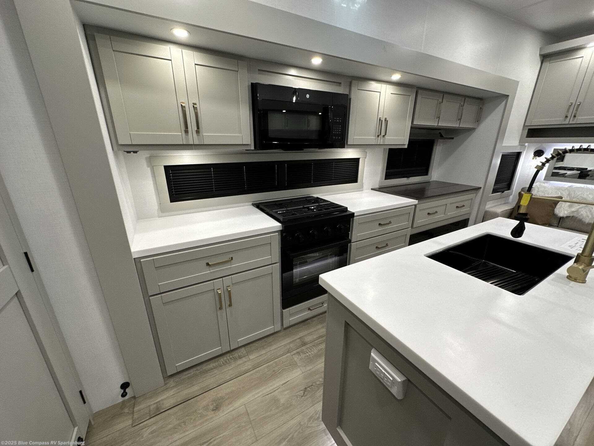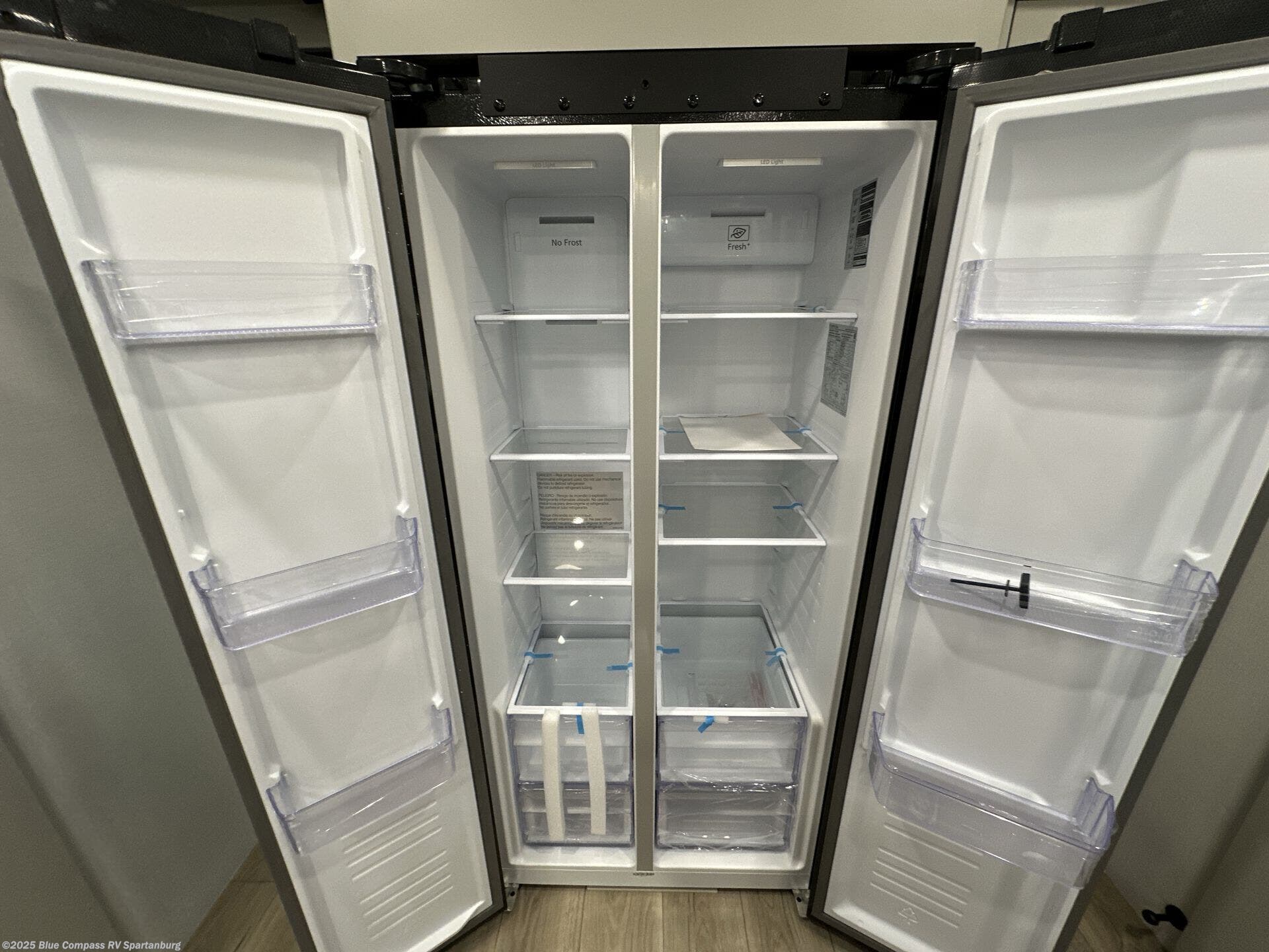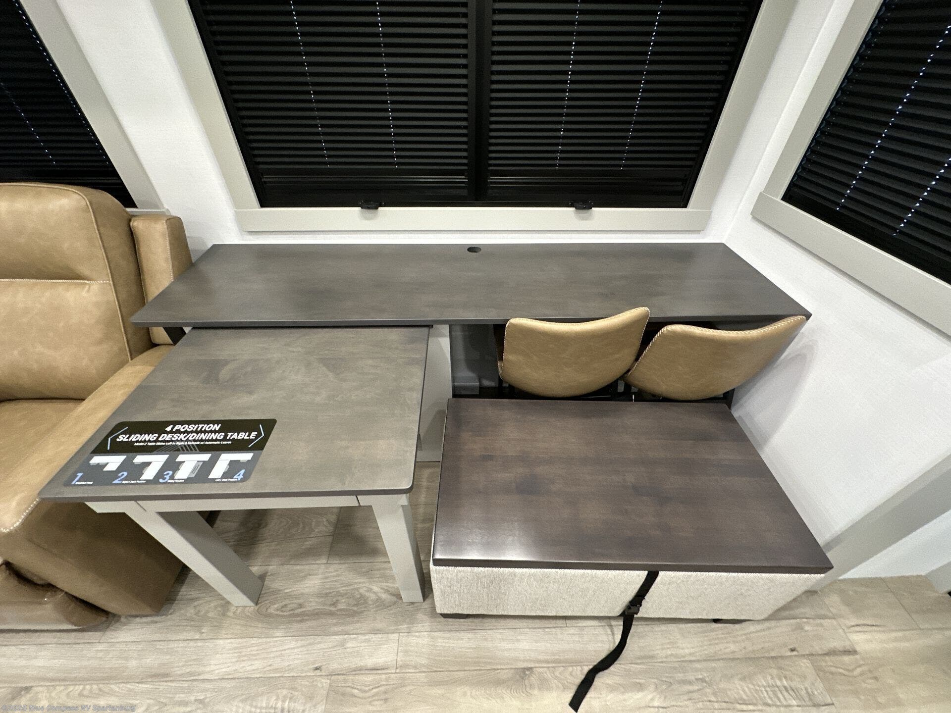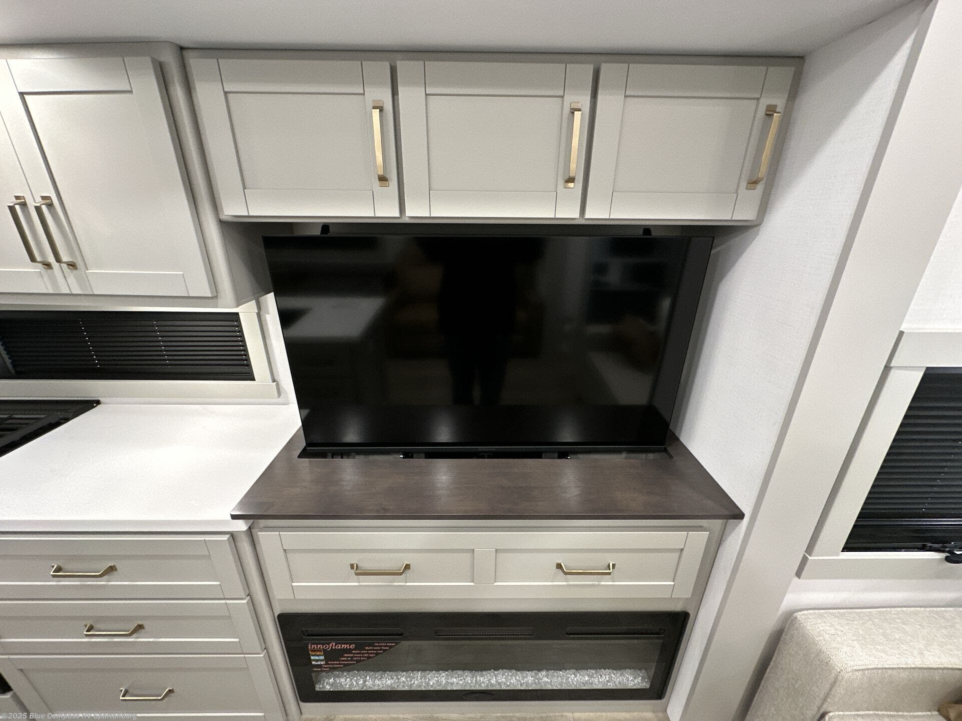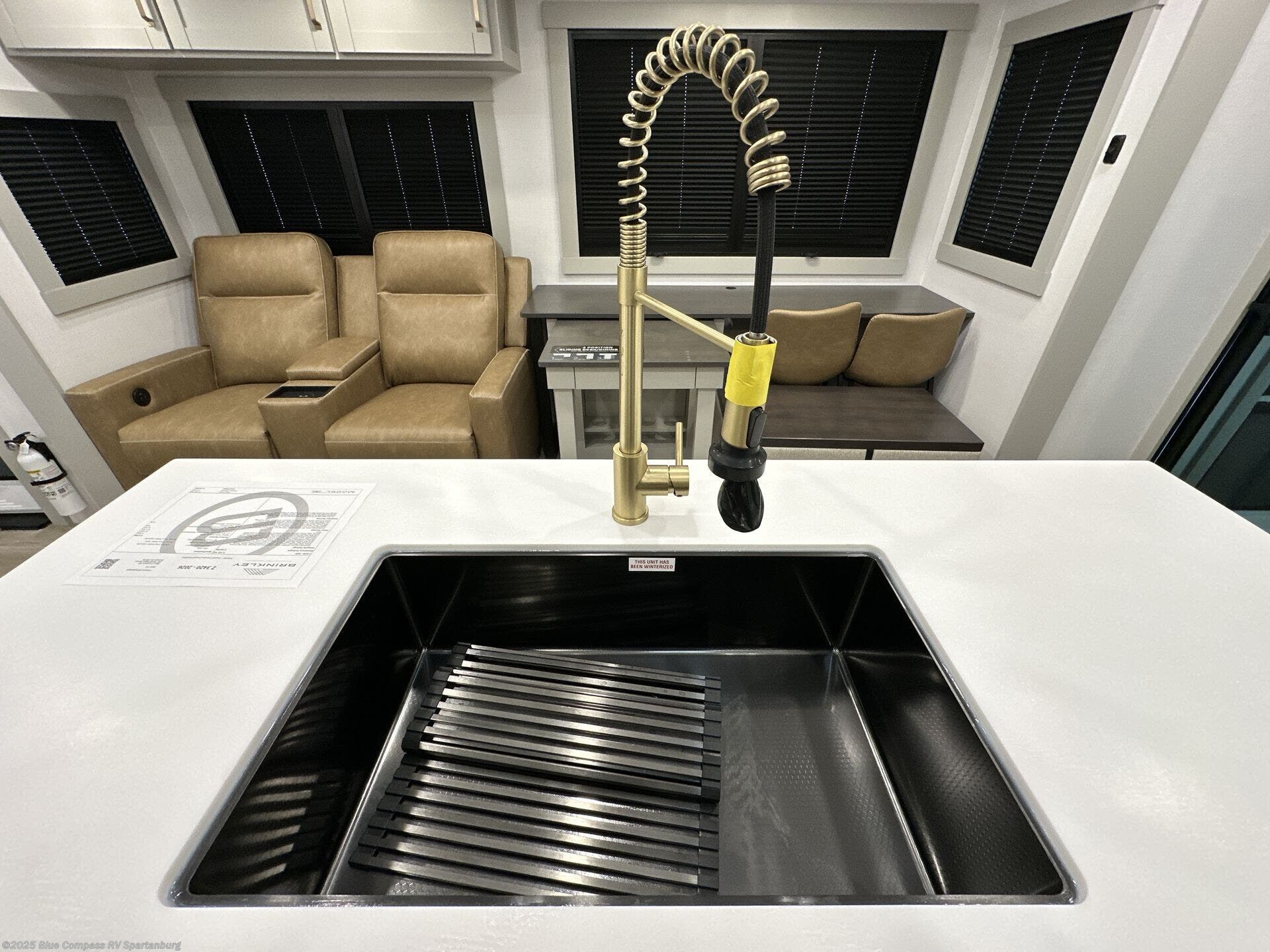 You're going to love every minute spent in this triple slide out fifth wheel! Once you arrive at the campground, you can put out the two side awnings, set up the rear patio and awning, then make lunch on the outdoor kitchen! There is also an outdoor TV here, a bar sink, and a refrigerator to keep drinks close by! Inside, the chef will find everything they need if the weather isn't cooperating, including a 30" residential microwave, 16 cu. ft. refrigerator, plus a large kitchen island, complete with dual trash bins and dog bowls at the foot. Your crew can get cozy on the tri-fold sofa that extends to a 54" x 70" bed for guests, and there is theater seating across from the televator and fireplace for easy viewing! You will find the front private bedroom ultra accommodating with its king bed slide out, sliding dresser top with hidden storage, your own TV, and a front wardrobe with shelves and a shoe rack. There is even washer and dryer prep if you want the option to make laundry day that much easier!