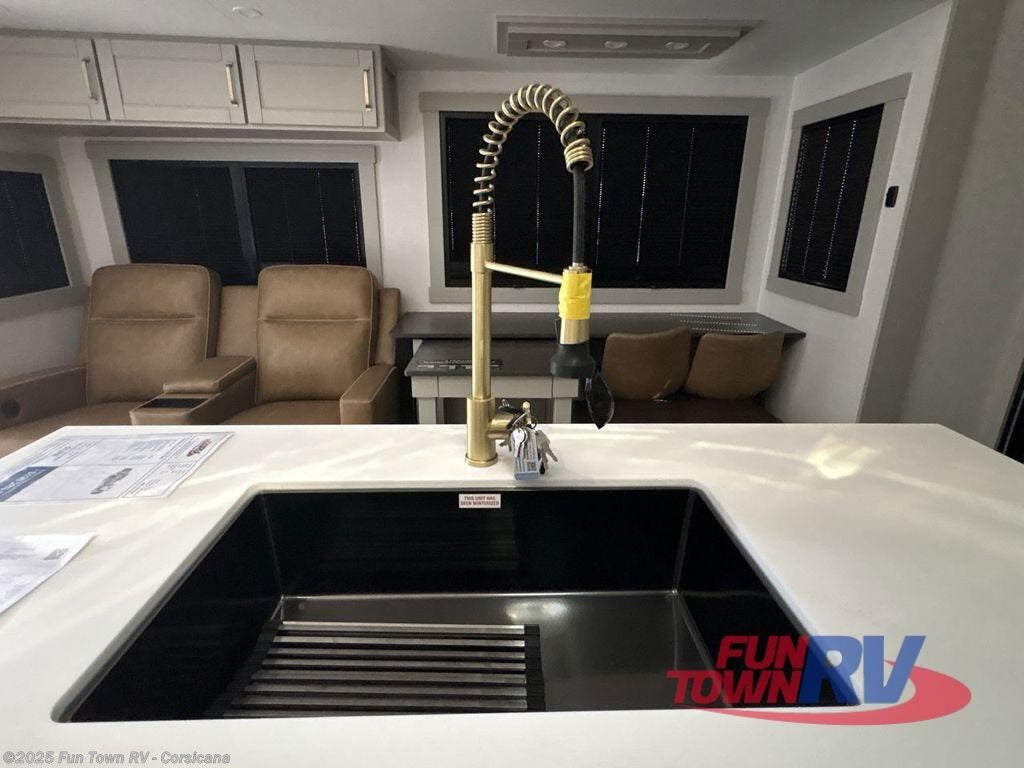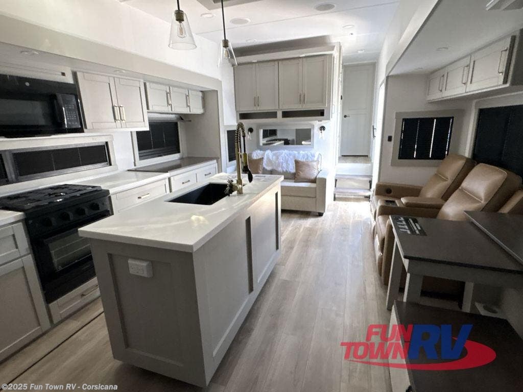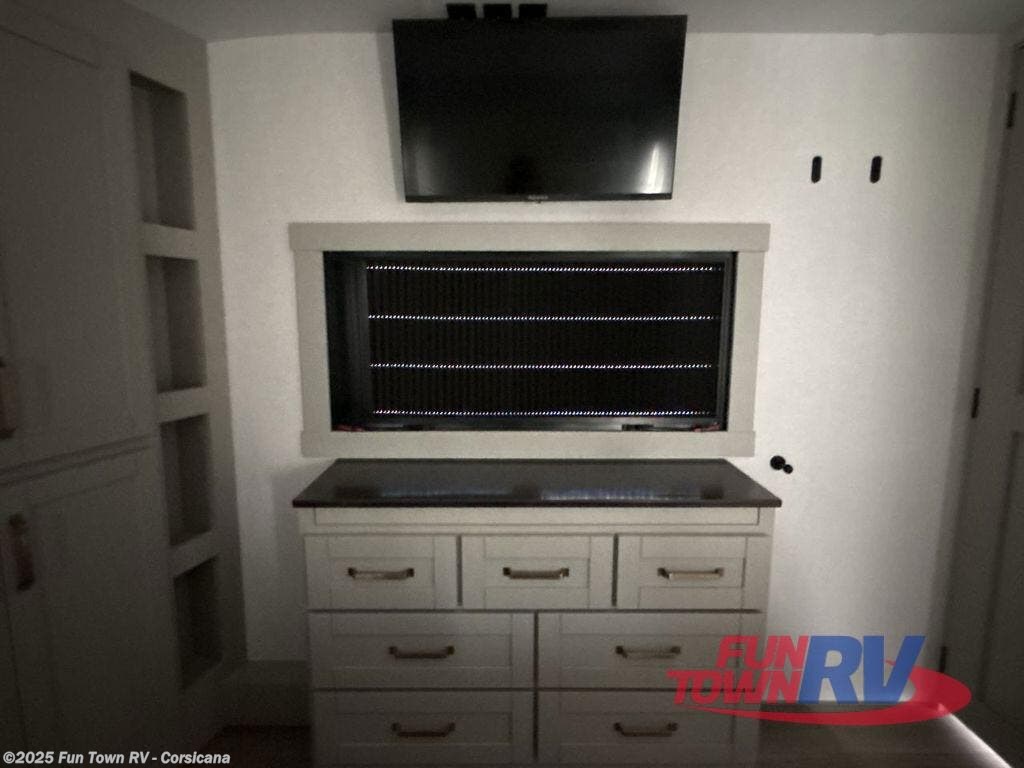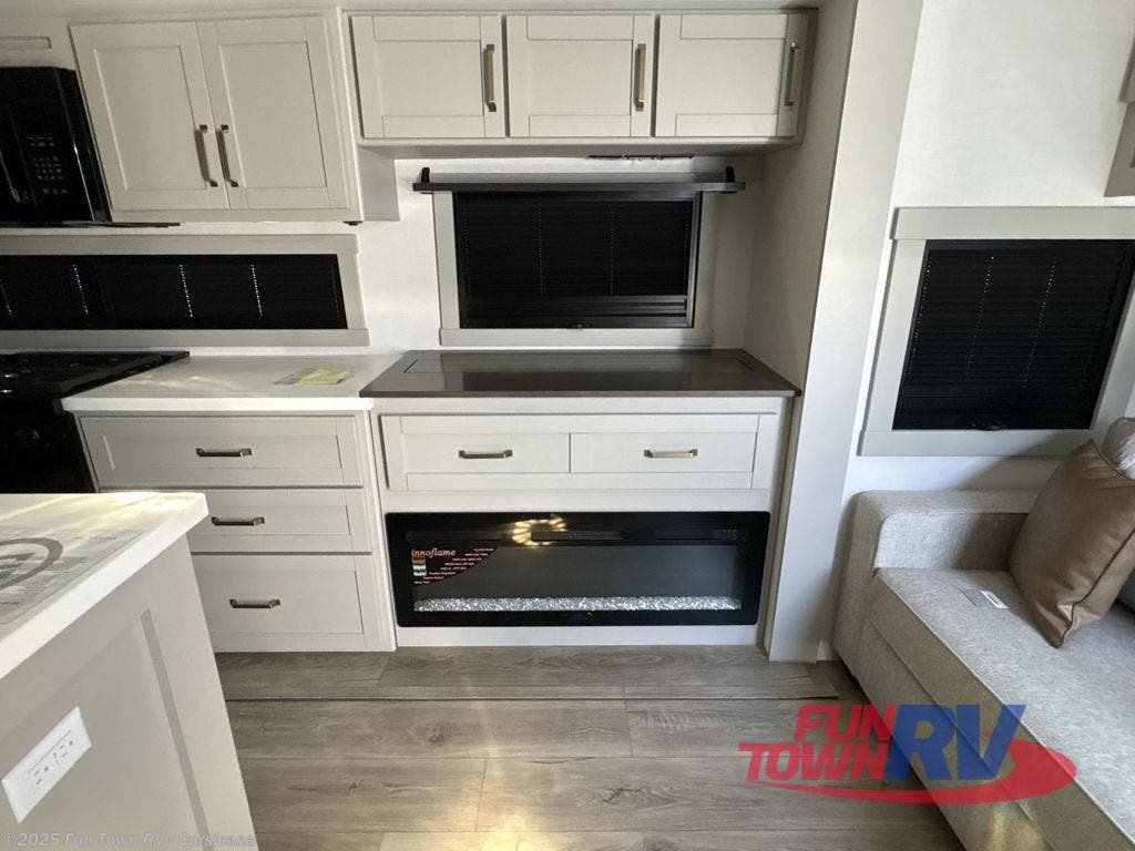You're going to love every minute spent in this triple slide out fifth wheel! Once you arrive at the campground, you can put out the two side awnings, set up the rear patio and awning, then make lunch on the outdoor kitchen! There is also an outdoor TV here, a bar sink, and a refrigerator to keep drinks close by! Inside, the chef will find everything they need if the weather isn't cooperating, including a 30" residential microwave, 16 cu. ft. refrigerator, plus a large kitchen island, complete with dual trash bins and dog bowls at the foot. Your crew can get cozy on the tri-fold sofa that extends to a 54" x 70" bed for guests, and there is theater seating across from the televator and fireplace for easy viewing! You will find the front private bedroom ultra accommodating with its king bed slide out, sliding dresser top with hidden storage, your own TV, and a front wardrobe with shelves and a shoe rack. There is even washer and dryer prep if you want the option to make laundry day that much easier!