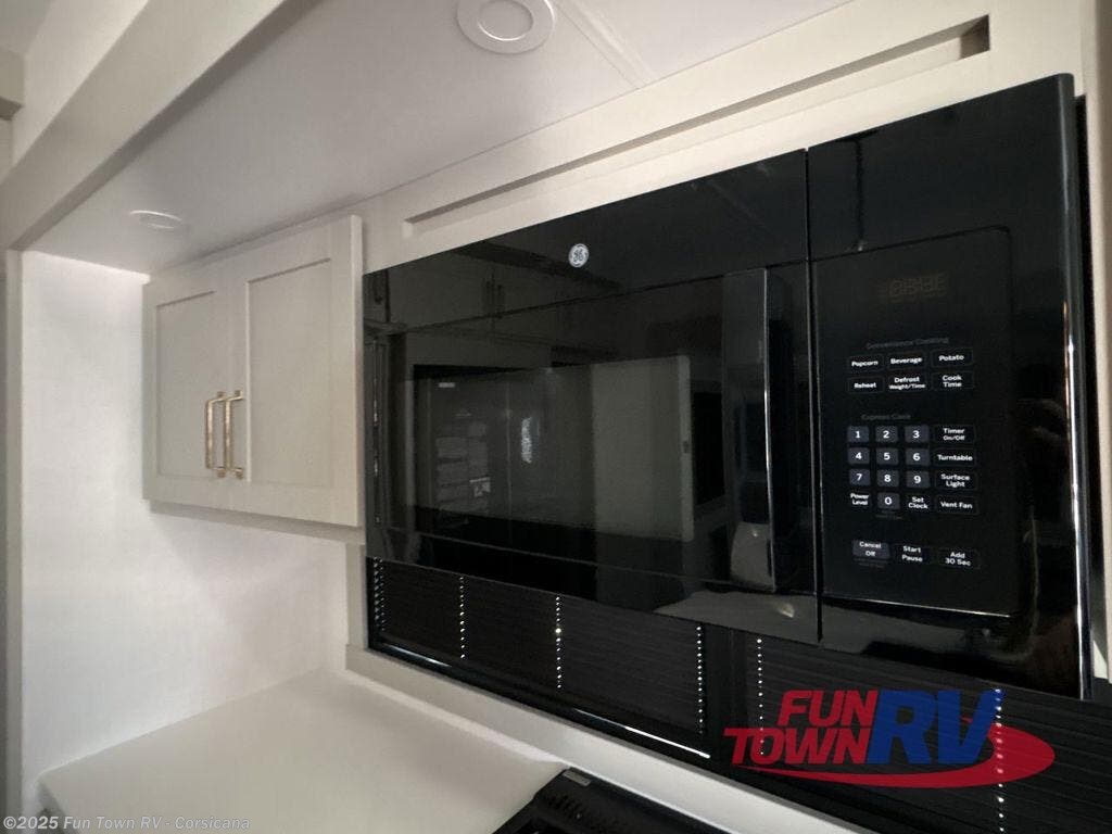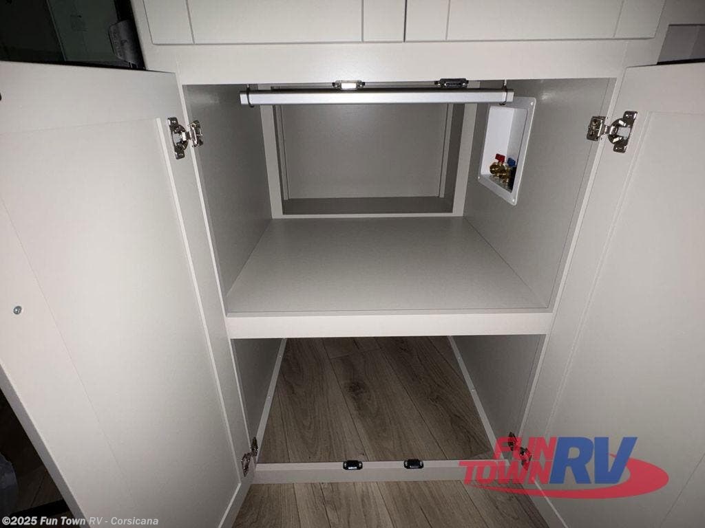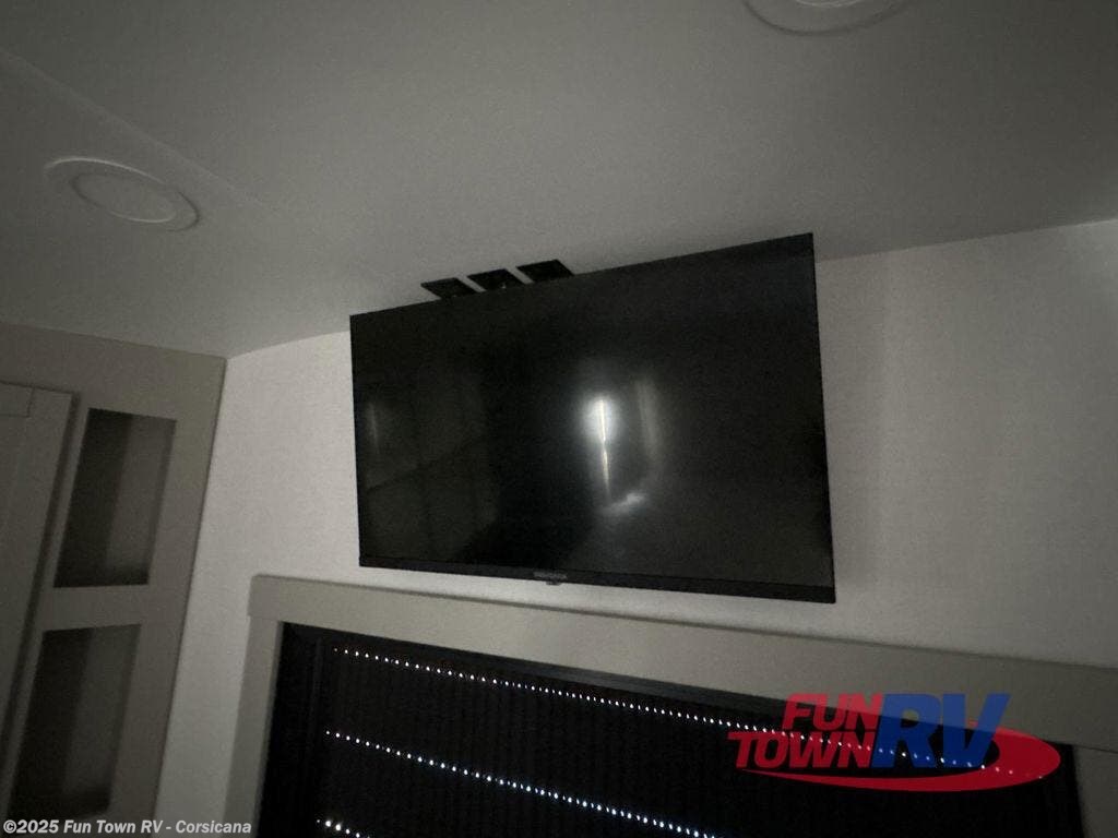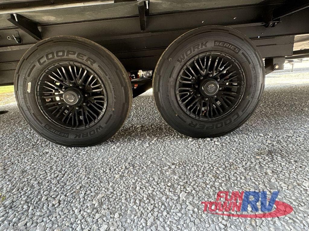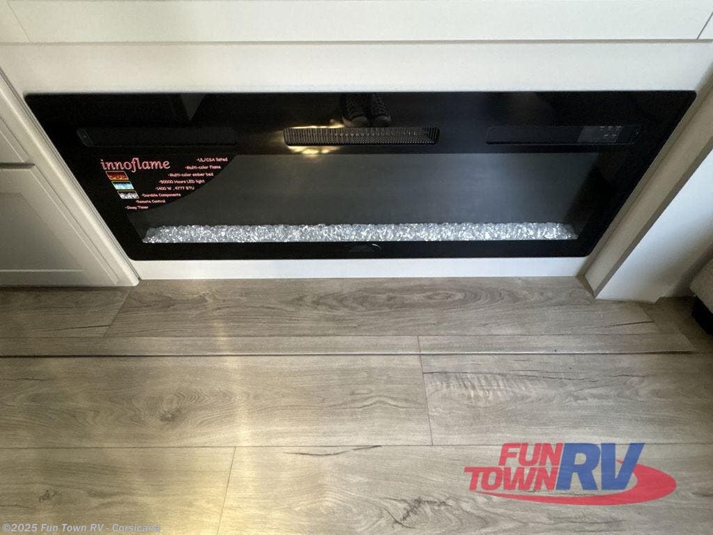 You're going to love every minute spent in this triple slide out fifth wheel! Once you arrive at the campground, you can put out the two side awnings, set up the rear patio and awning, then make lunch on the outdoor kitchen! There is also an outdoor TV here, a bar sink, and a refrigerator to keep drinks close by! Inside, the chef will find everything they need if the weather isn't cooperating, including a 30" residential microwave, 16 cu. ft. refrigerator, plus a large kitchen island, complete with dual trash bins and dog bowls at the foot. Your crew can get cozy on the tri-fold sofa that extends to a 54" x 70" bed for guests, and there is theater seating across from the televator and fireplace for easy viewing! You will find the front private bedroom ultra accommodating with its king bed slide out, sliding dresser top with hidden storage, your own TV, and a front wardrobe with shelves and a shoe rack. There is even washer and dryer prep if you want the option to make laundry day that much easier!