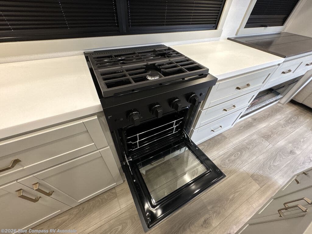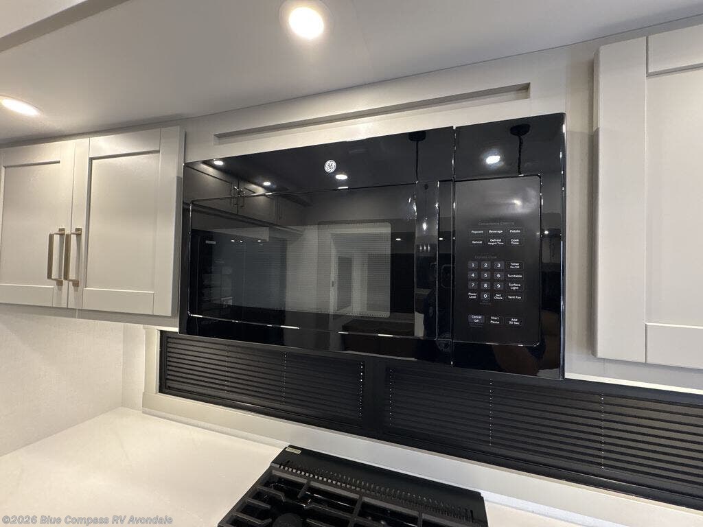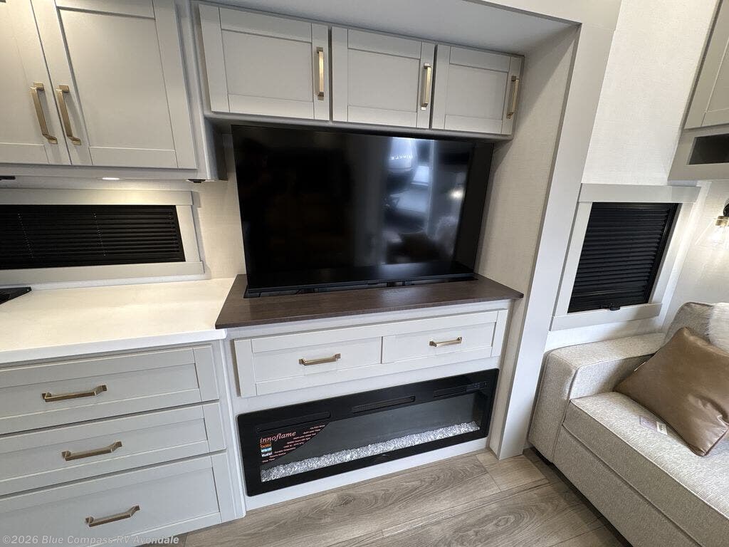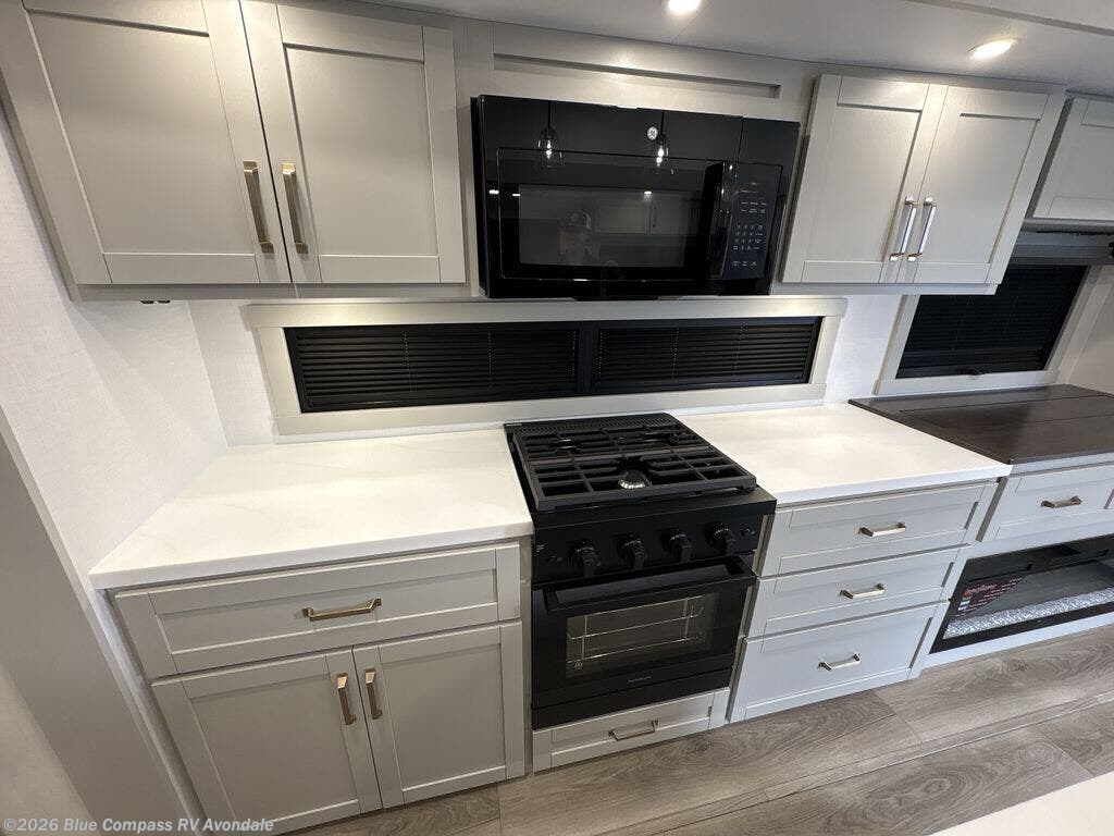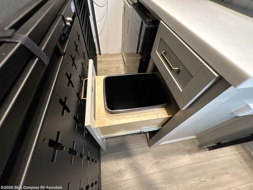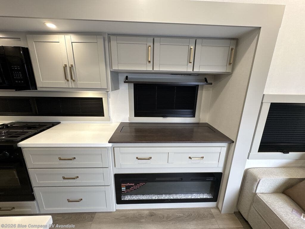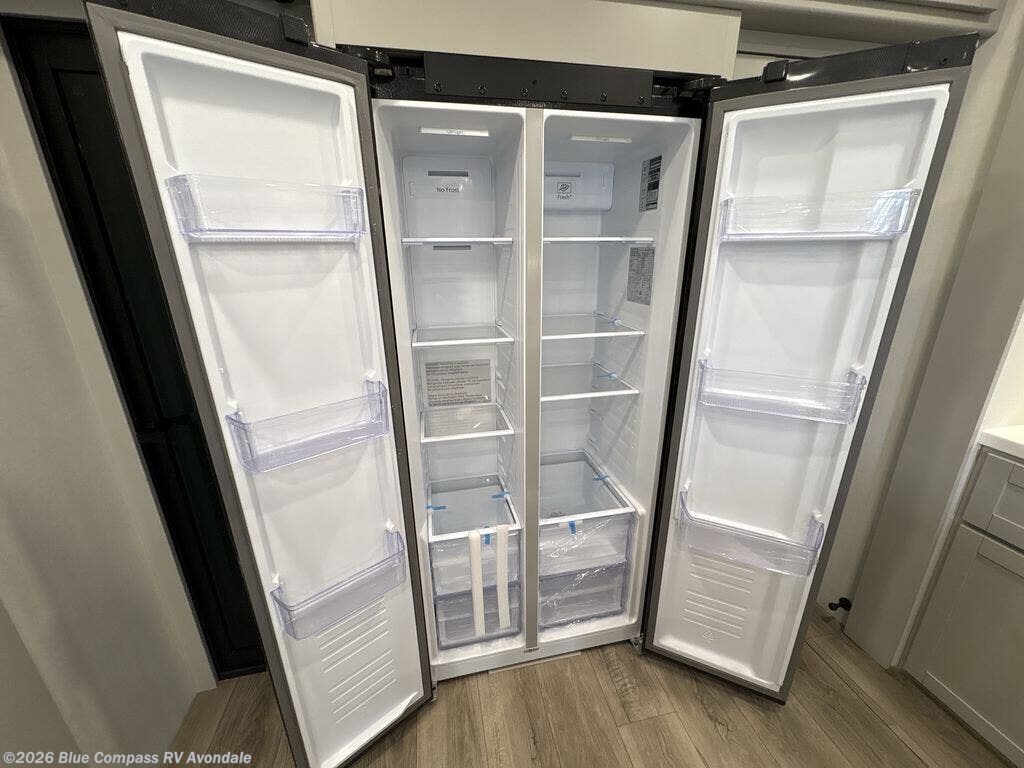 You're going to love every minute spent in this triple slide out fifth wheel! Once you arrive at the campground, you can put out the two side awnings, set up the rear patio and awning, then make lunch on the outdoor kitchen! There is also an outdoor TV here, a bar sink, and a refrigerator to keep drinks close by! Inside, the chef will find everything they need if the weather isn't cooperating, including a 30" residential microwave, 16 cu. ft. refrigerator, plus a large kitchen island, complete with dual trash bins and dog bowls at the foot. Your crew can get cozy on the tri-fold sofa that extends to a 54" x 70" bed for guests, and there is theater seating across from the televator and fireplace for easy viewing! You will find the front private bedroom ultra accommodating with its king bed slide out, sliding dresser top with hidden storage, your own TV, and a front wardrobe with shelves and a shoe rack. There is even washer and dryer prep if you want the option to make laundry day that much easier!