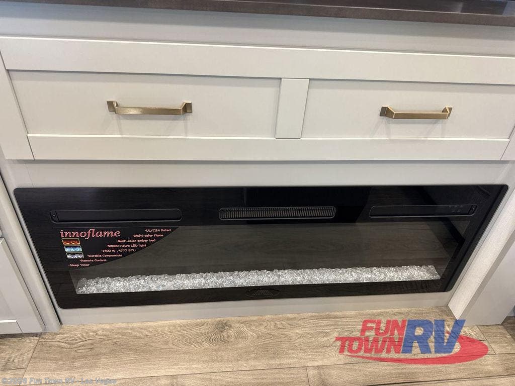 You're going to love every minute spent in this triple slide out fifth wheel! Once you arrive at the campground, you can put out the two side awnings, set up the rear patio and awning, then make lunch on the outdoor kitchen! There is also an outdoor TV here, a bar sink, and a refrigerator to keep drinks close by! Inside, the chef will find everything they need if the weather isn't cooperating, including a 30" residential microwave, 16 cu. ft. refrigerator, plus a large kitchen island, complete with dual trash bins and dog bowls at the foot. Your crew can get cozy on the tri-fold sofa that extends to a 54" x 70" bed for guests, and there is theater seating across from the televator and fireplace for easy viewing! You will find the front private bedroom ultra accommodating with its king bed slide out, sliding dresser top with hidden storage, your own TV, and a front wardrobe with shelves and a shoe rack. There is even washer and dryer prep if you want the option to make laundry day that much easier!