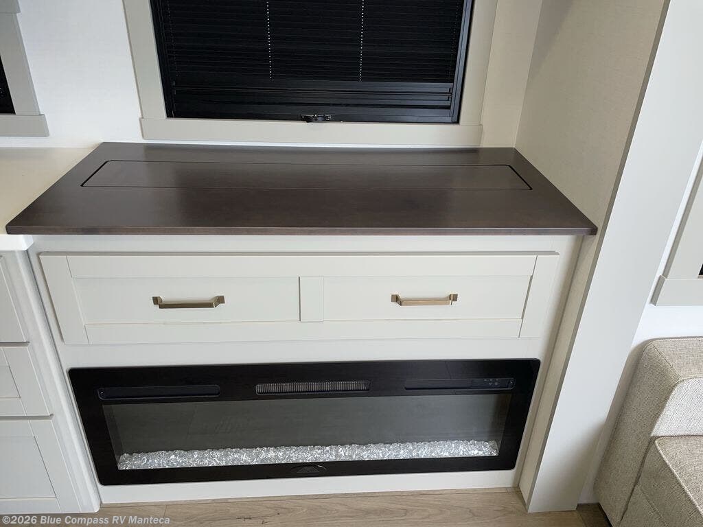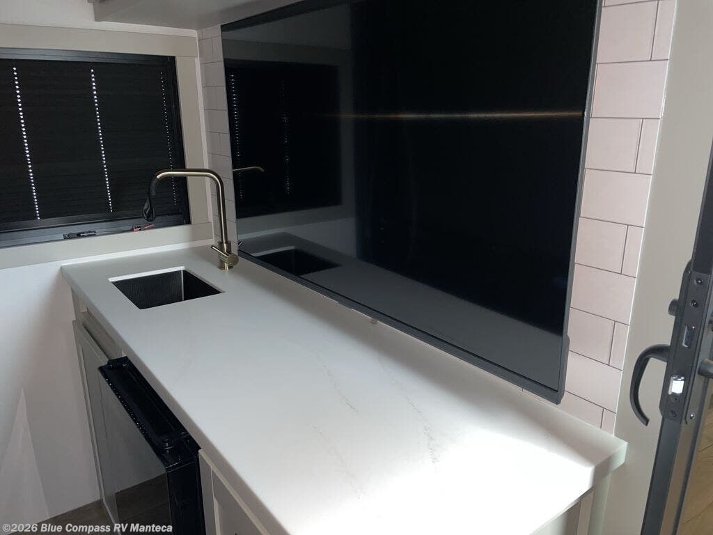 You're going to love every minute spent in this triple slide out fifth wheel! Once you arrive at the campground, you can put out the two side awnings, set up the rear patio and awning, then make lunch on the outdoor kitchen! There is also an outdoor TV here, a bar sink, and a refrigerator to keep drinks close by! Inside, the chef will find everything they need if the weather isn't cooperating, including a 30" residential microwave, 16 cu. ft. refrigerator, plus a large kitchen island, complete with dual trash bins and dog bowls at the foot. Your crew can get cozy on the tri-fold sofa that extends to a 54" x 70" bed for guests, and there is theater seating across from the televator and fireplace for easy viewing! You will find the front private bedroom ultra accommodating with its king bed slide out, sliding dresser top with hidden storage, your own TV, and a front wardrobe with shelves and a shoe rack. There is even washer and dryer prep if you want the option to make laundry day that much easier!