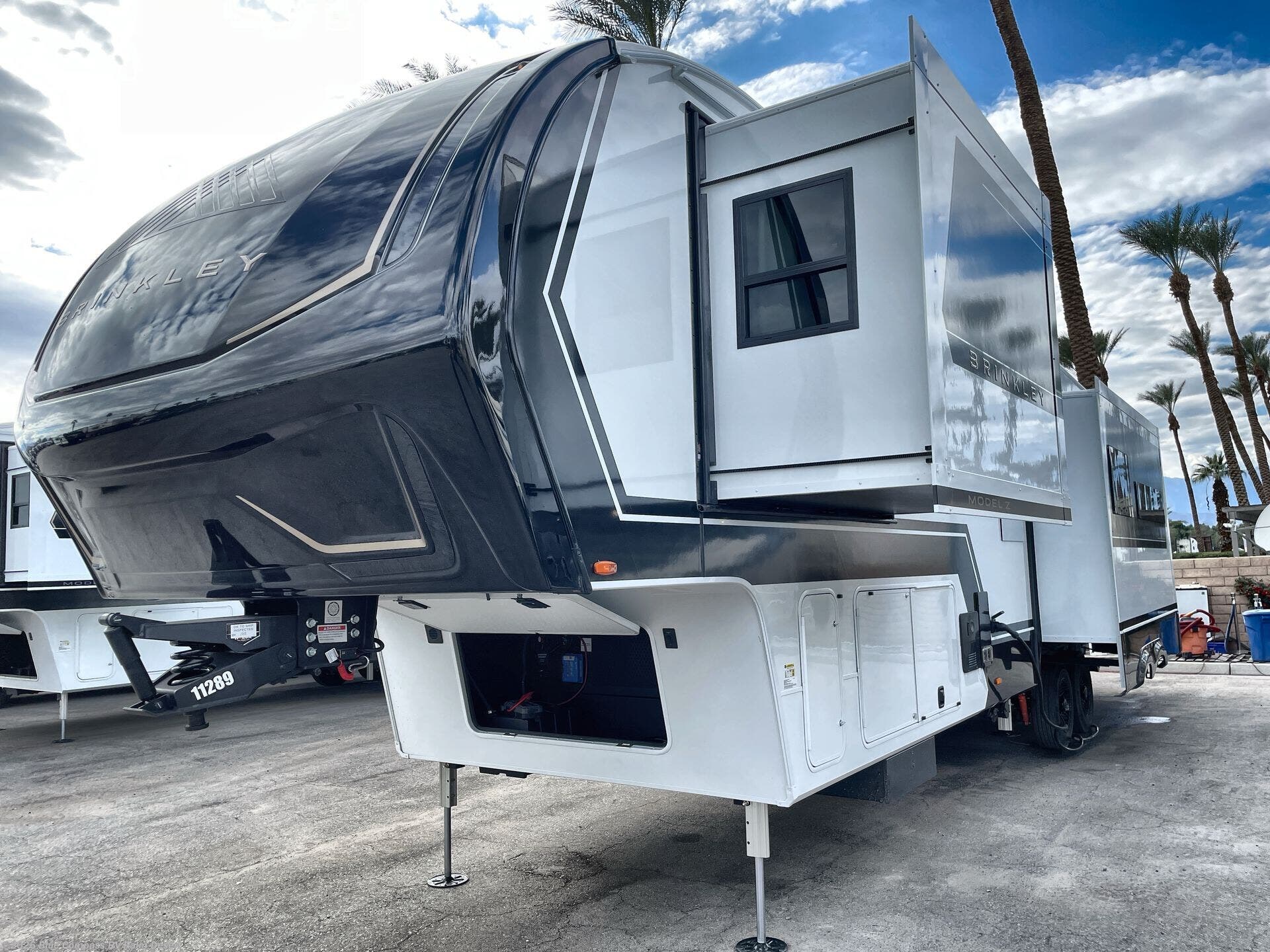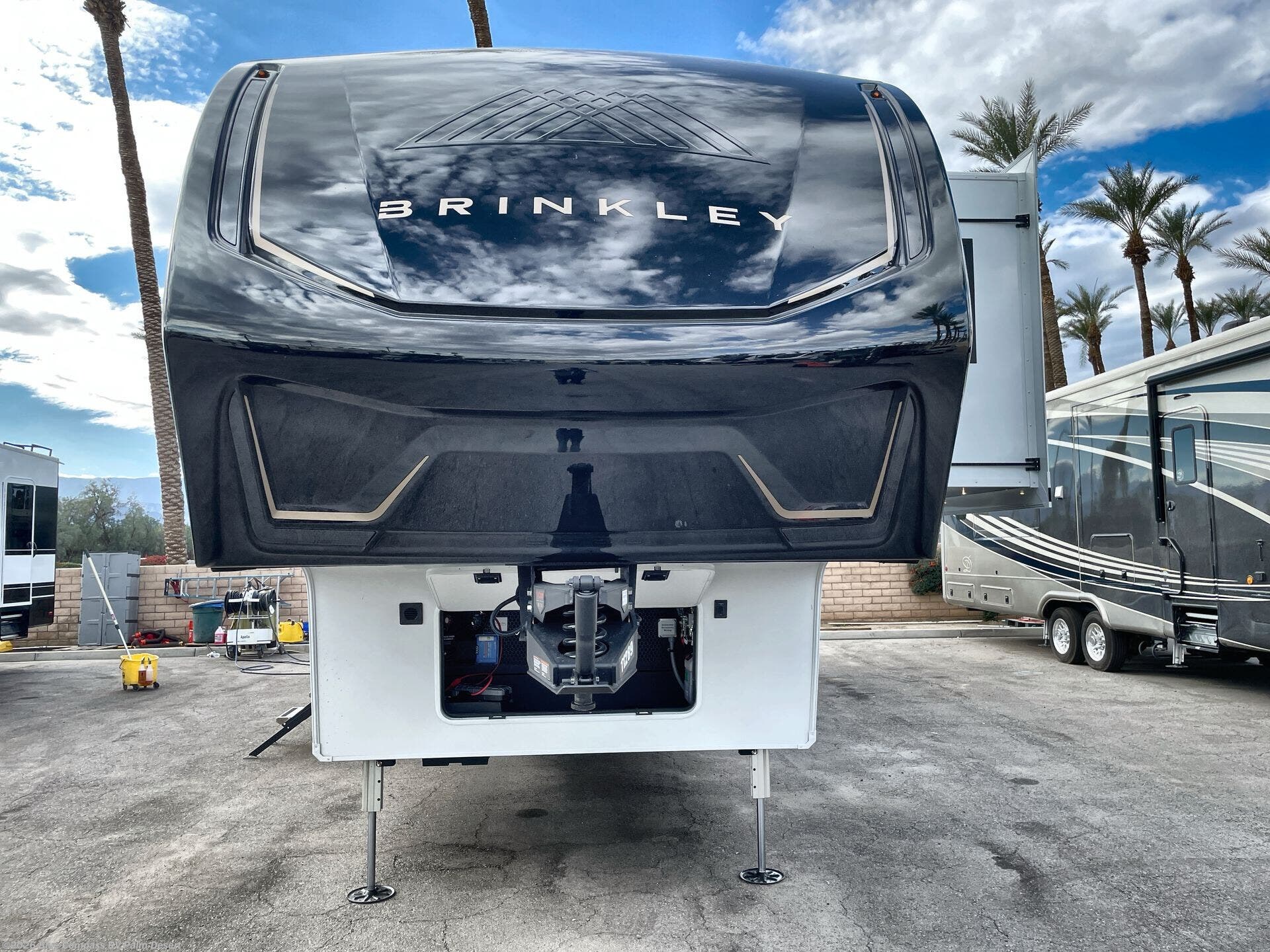 The Brinkley mid-profile Model Z fifth wheels bring you clean lines and an upscale look with plenty of style and exciting new features like the industry first brass plumbing connections. These units also feature an automotive grade front cap, plenty of exterior storage, exterior hot and cold showers, and wide stance leveling jacks for easy set up. Residential frameless windows provide a clean look and beautiful views, and ample electrical outlets and 6 USB/USB-C outlets allow all of your electronics and appliances to easily be used and charged.