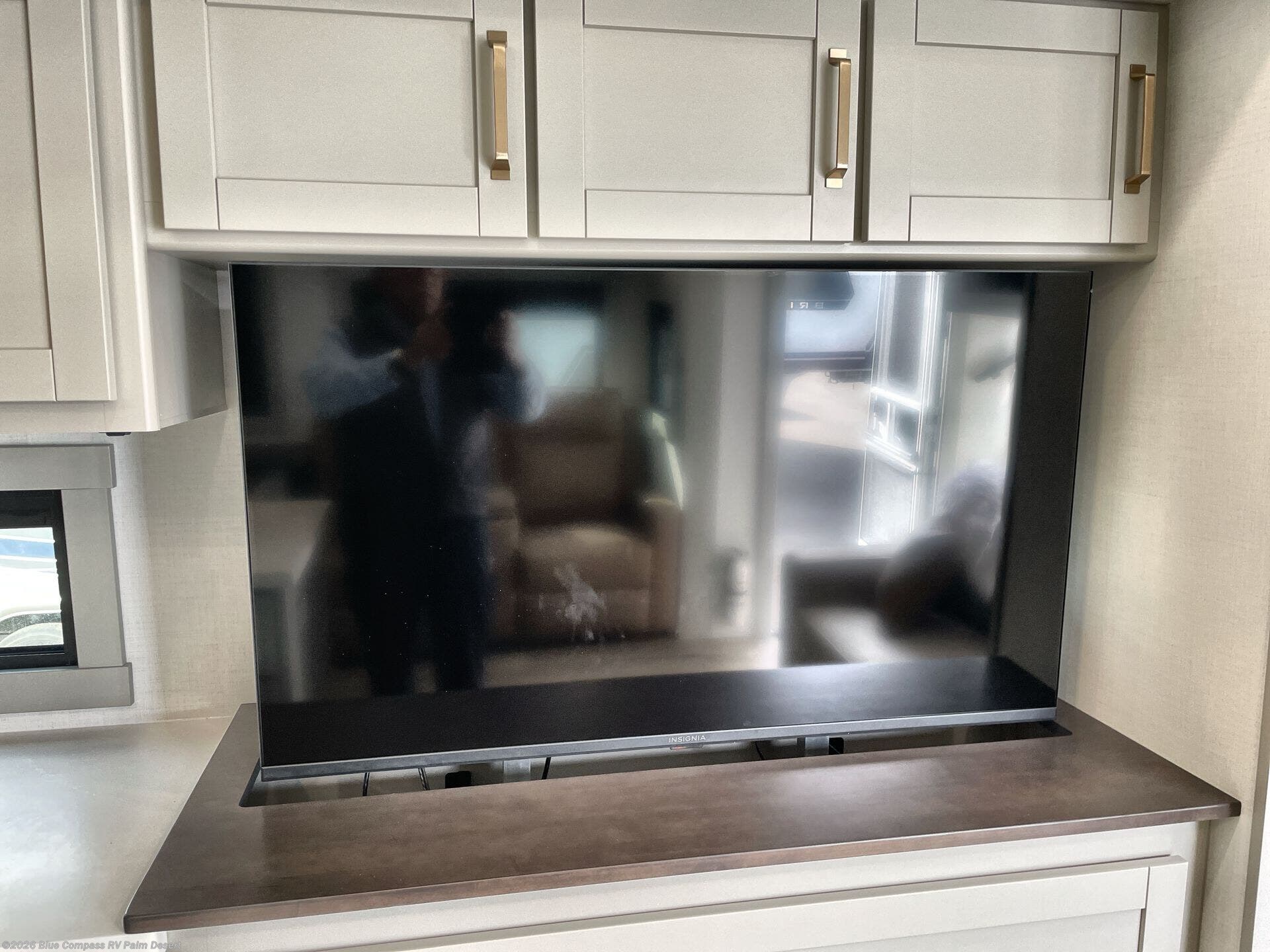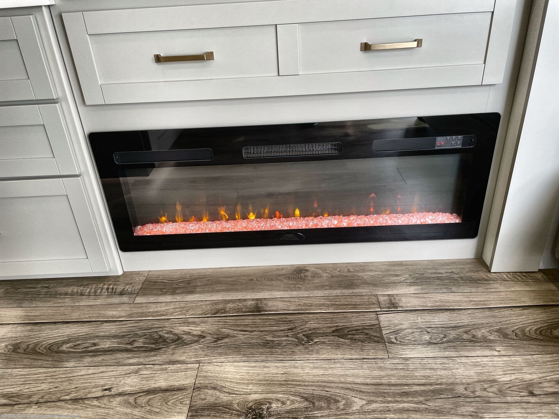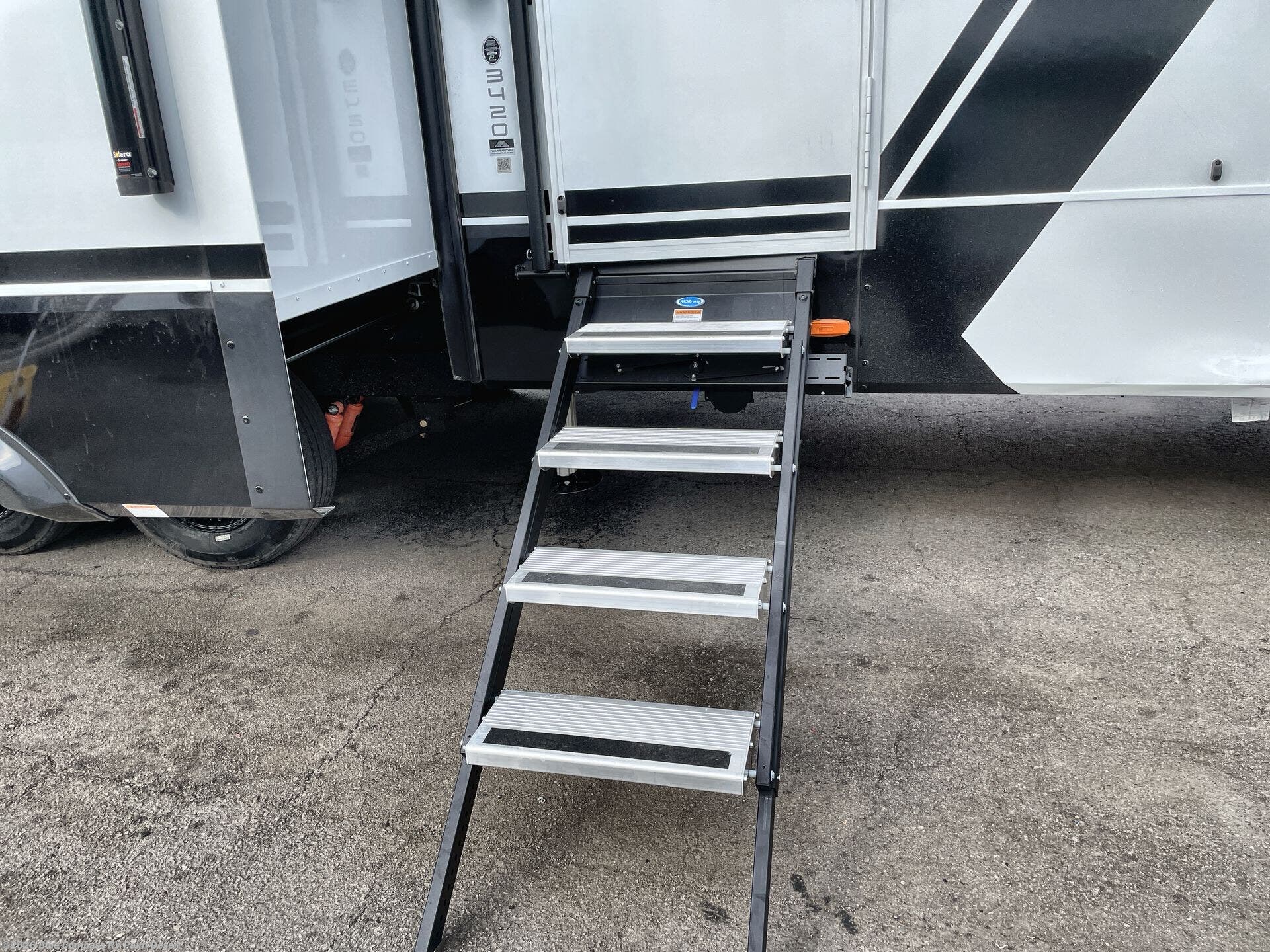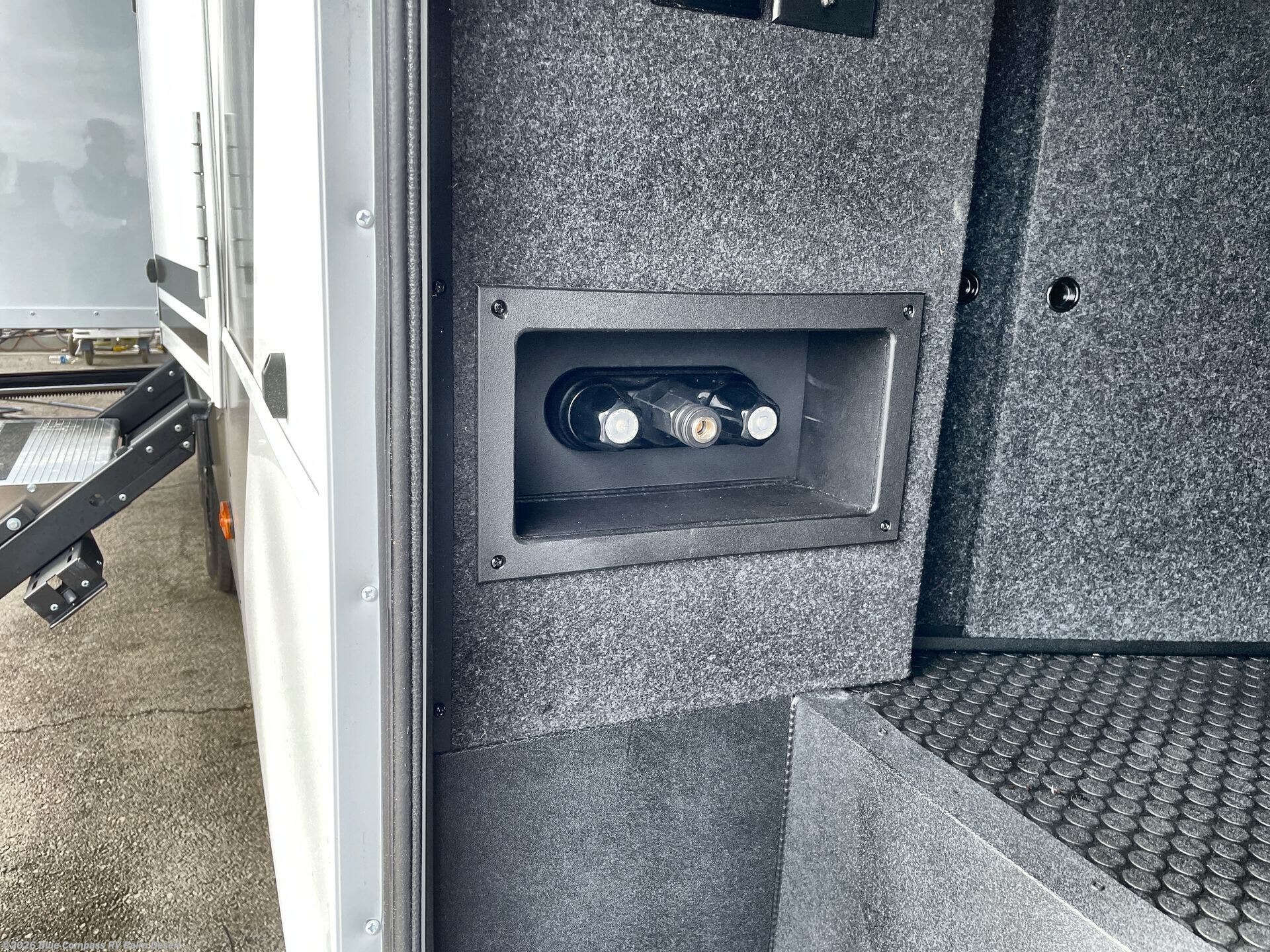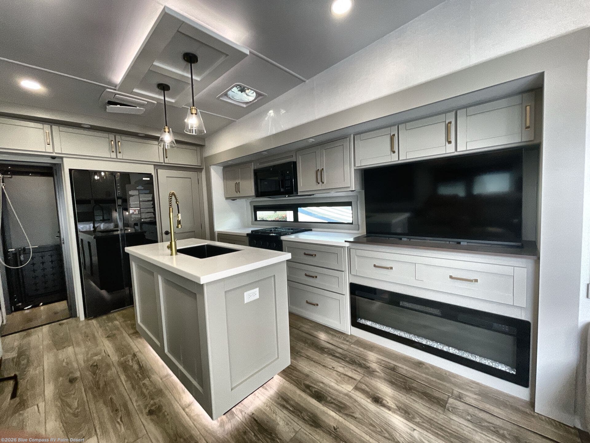 You're going to love every minute spent in this triple slide out fifth wheel! Once you arrive at the campground, you can put out the two side awnings, set up the rear patio and awning, then make lunch on the outdoor kitchen! There is also an outdoor TV here, a bar sink, and a refrigerator to keep drinks close by! Inside, the chef will find everything they need if the weather isn't cooperating, including a 30" residential microwave, 16 cu. ft. refrigerator, plus a large kitchen island, complete with dual trash bins and dog bowls at the foot. Your crew can get cozy on the tri-fold sofa that extends to a 54" x 70" bed for guests, and there is theater seating across from the televator and fireplace for easy viewing! You will find the front private bedroom ultra accommodating with its king bed slide out, sliding dresser top with hidden storage, your own TV, and a front wardrobe with shelves and a shoe rack. There is even washer and dryer prep if you want the option to make laundry day that much easier!
