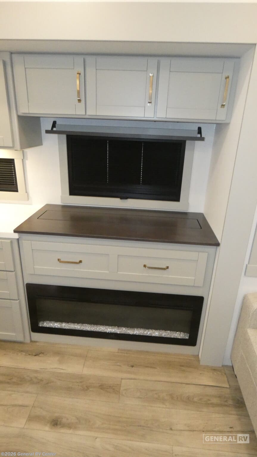 Brinkley Model Z fifth wheel 3420 highlights: Kitchen Island Dual Entry Full Bath Pantry with Adjustable Shelves Sliding Desk/Dining Table Outdoor Kitchen with TV You're going to love every minute spent in this triple slide out fifth wheel! Once you arrive at the campground, you can put out the two side awnings, set up the rear patio and awning, then make lunch on the outdoor kitchen! There is also an outdoor TV here, a bar sink, and a refrigerator to keep drinks close by! Inside, the chef will find everything they need if the weather isn't cooperating, including a 30" residential microwave, 16 cu. ft. refrigerator, plus a large kitchen island, complete with dual trash bins and dog bowls at the foot. Your crew can get cozy on the tri-fold sofa that extends to a 54" x 70" bed for guests, and there is theater seating across from the televator and fireplace for easy viewing! You will find the front private bedroom ultra accommodating with its king bed slide out, sliding dresser top with hidden storage, your own TV, and a front wardrobe with shelves and a shoe rack. There is even washer and dryer prep if you want the option to make laundry day that much easier! The Brinkley mid-profile Model Z fifth wheels bring you clean lines and an upscale look with plenty of style and exciting new features like the industry first brass plumbing connections. These units also feature an automotive grade front cap, plenty of exterior storage, exterior hot and cold showers, and wide stance leveling jacks for easy set up. Residential frameless windows provide a clean look and beautiful views, and ample electrical outlets and 6 USB/USB-C outlets allow all of your electronics and appliances to easily be used and charged.