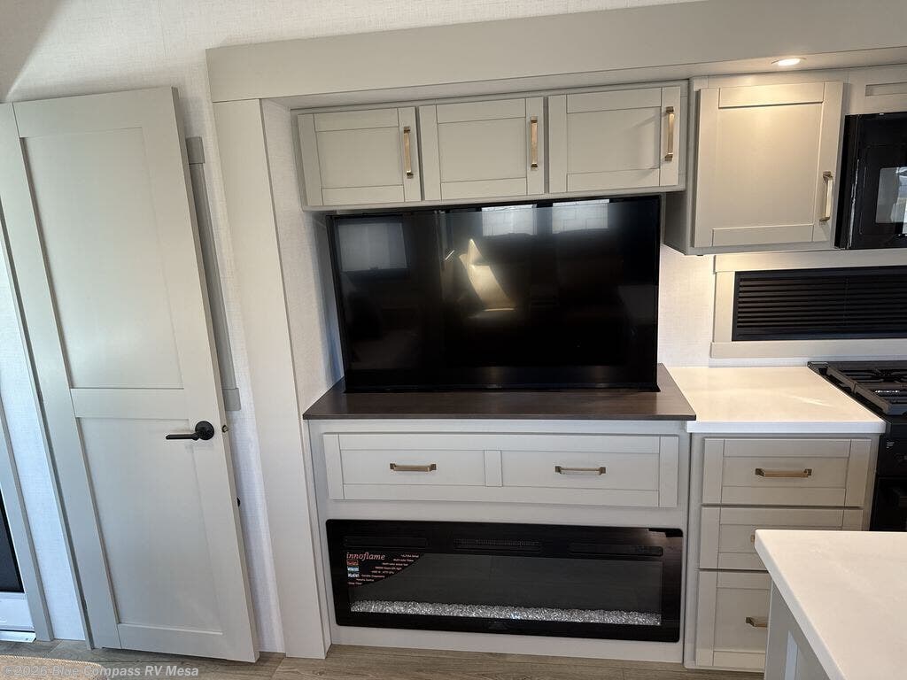 If you're looking for a feature-packed fifth wheel, this is the one! The rear multipurpose flex space can be used as an office/butler's pantry/laundry room/mudroom! There is an adjustable-height desk, storage space, plus washer and dryer prep. One of the dual entry doors is even found here for added convenience. The combined middle kitchen and living room includes dual opposing slides, a tri-fold sofa, theater seating, and a sliding desk/dining table. There is also a televator and fireplace, kitchen island with pet bowls, and an 84" pantry with adjustable shelving to name a few more features. A full bath towards the front includes a 30" x 42" shower, and the front private bedroom will feel just like home with its king bed slide out. There is also a sliding dresser top with hidden storage, bedside shelves, a front wardrobe, and washer and dryer prep here also!