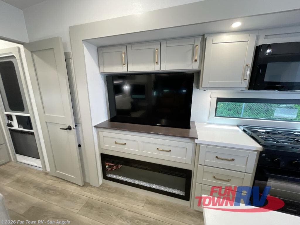 If you're looking for a feature-packed fifth wheel, this is the one! The rear multipurpose flex space can be used as an office/butler's pantry/laundry room/mudroom! There is an adjustable-height desk, storage space, plus washer and dryer prep. One of the dual entry doors is even found here for added convenience. The combined middle kitchen and living room includes dual opposing slides, a tri-fold sofa, theater seating, and a sliding desk/dining table. There is also a televator and fireplace, kitchen island with pet bowls, and an 84" pantry with adjustable shelving to name a few more features. A full bath towards the front includes a 30" x 42" shower, and the front private bedroom will feel just like home with its king bed slide out. There is also a sliding dresser top with hidden storage, bedside shelves, a front wardrobe, and washer and dryer prep here also!
