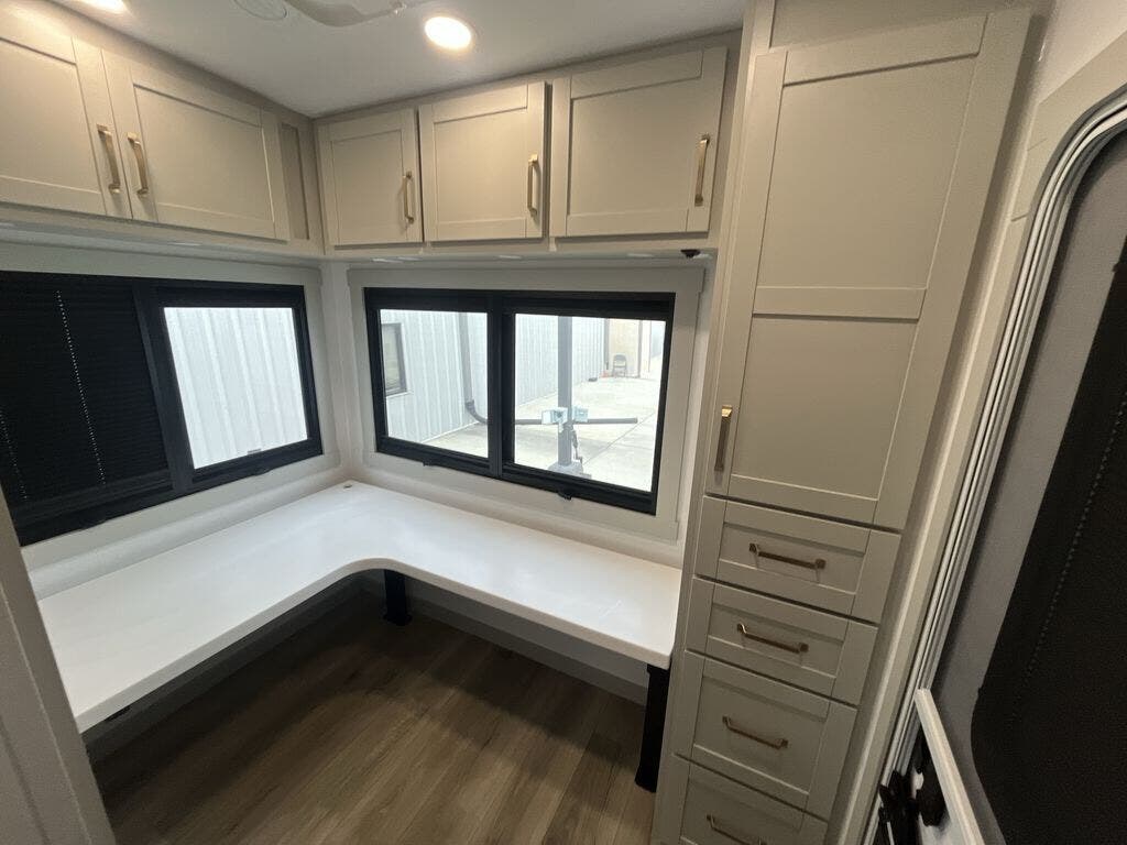 If you're looking for a feature-packed fifth wheel, this is the one! The rear multipurpose flex space can be used as an office/butler's pantry/laundry room/mudroom! There is an adjustable-height desk, storage space, plus washer and dryer prep. One of the dual entry doors is even found here for added convenience. The combined middle kitchen and living room includes dual opposing slides, a tri-fold sofa, theater seating, and a sliding desk/dining table. There is also a televator and fireplace, kitchen island with pet bowls, and an 84" pantry with adjustable shelving to name a few more features. A full bath towards the front includes a 30" x 42" shower, and the front private bedroom will feel just like home with its king bed slide out. There is also a sliding dresser top with hidden storage, bedside shelves, a front wardrobe, and washer and dryer prep here also!