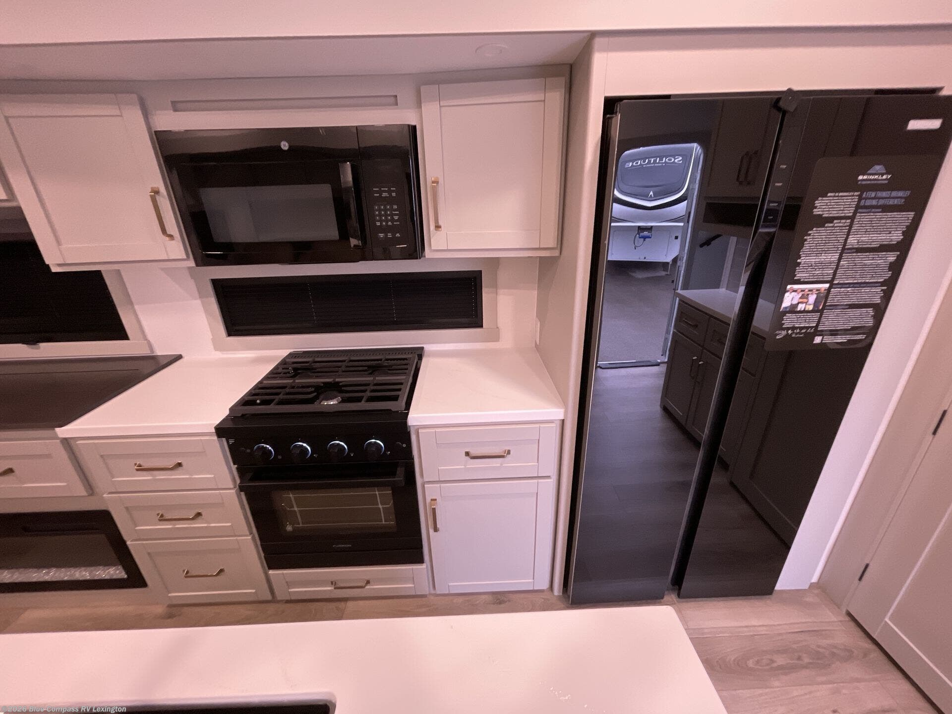 If you're looking for a feature-packed fifth wheel, this is the one! The rear multipurpose flex space can be used as an office/butler's pantry/laundry room/mudroom! There is an adjustable-height desk, storage space, plus washer and dryer prep. One of the dual entry doors is even found here for added convenience. The combined middle kitchen and living room includes dual opposing slides, a tri-fold sofa, theater seating, and a sliding desk/dining table. There is also a televator and fireplace, kitchen island with pet bowls, and an 84" pantry with adjustable shelving to name a few more features. A full bath towards the front includes a 30" x 42" shower, and the front private bedroom will feel just like home with its king bed slide out. There is also a sliding dresser top with hidden storage, bedside shelves, a front wardrobe, and washer and dryer prep here also!