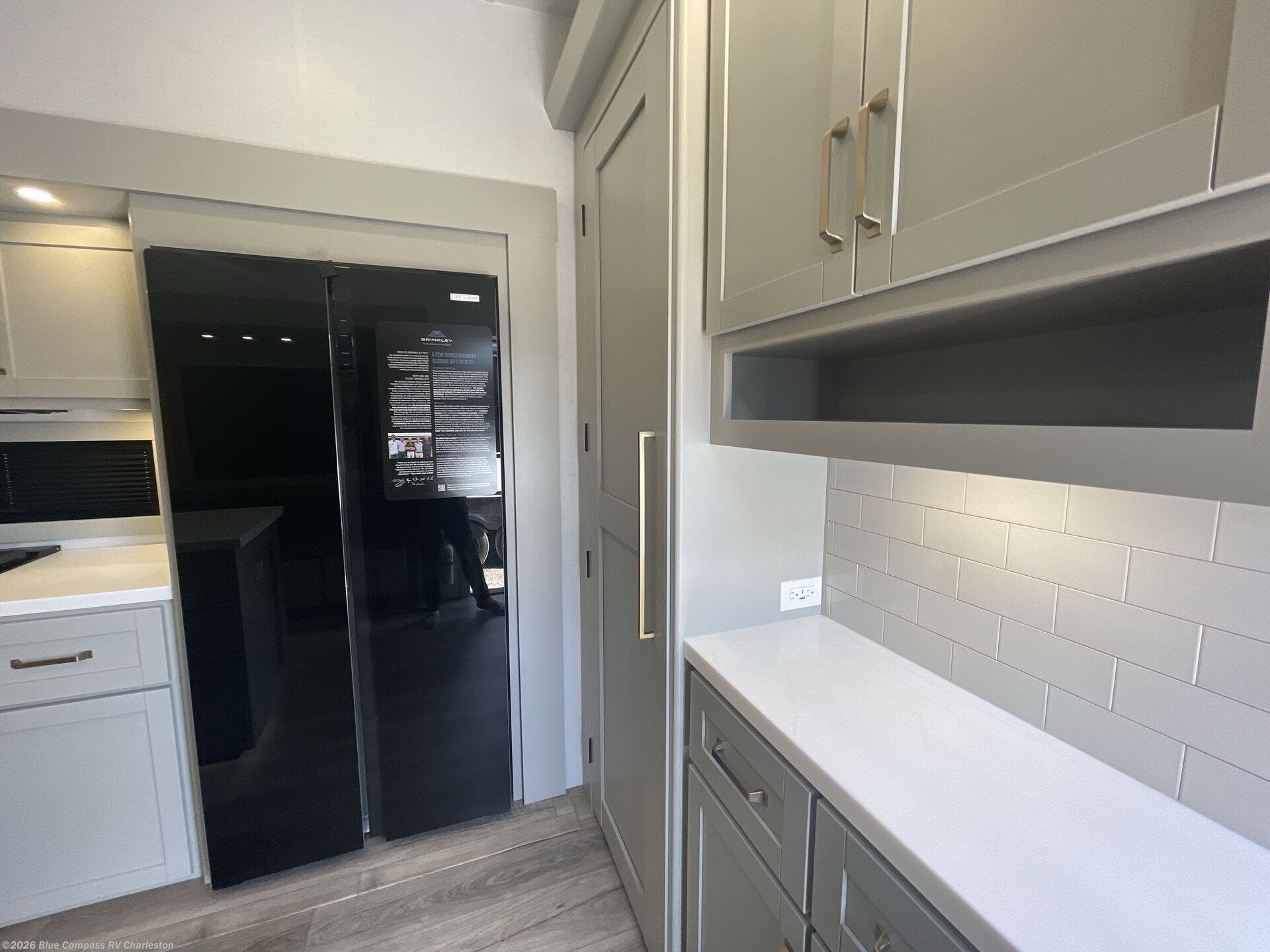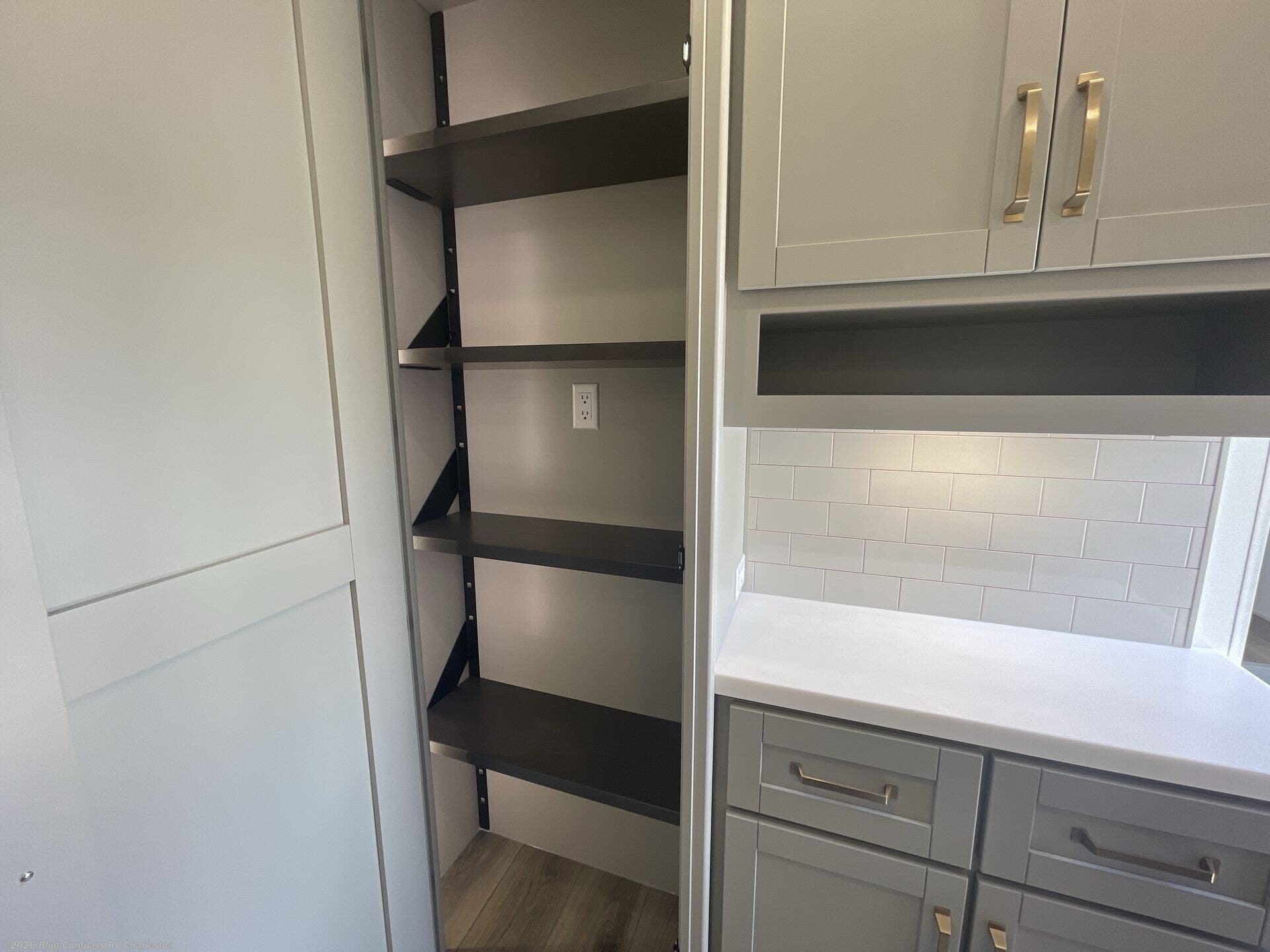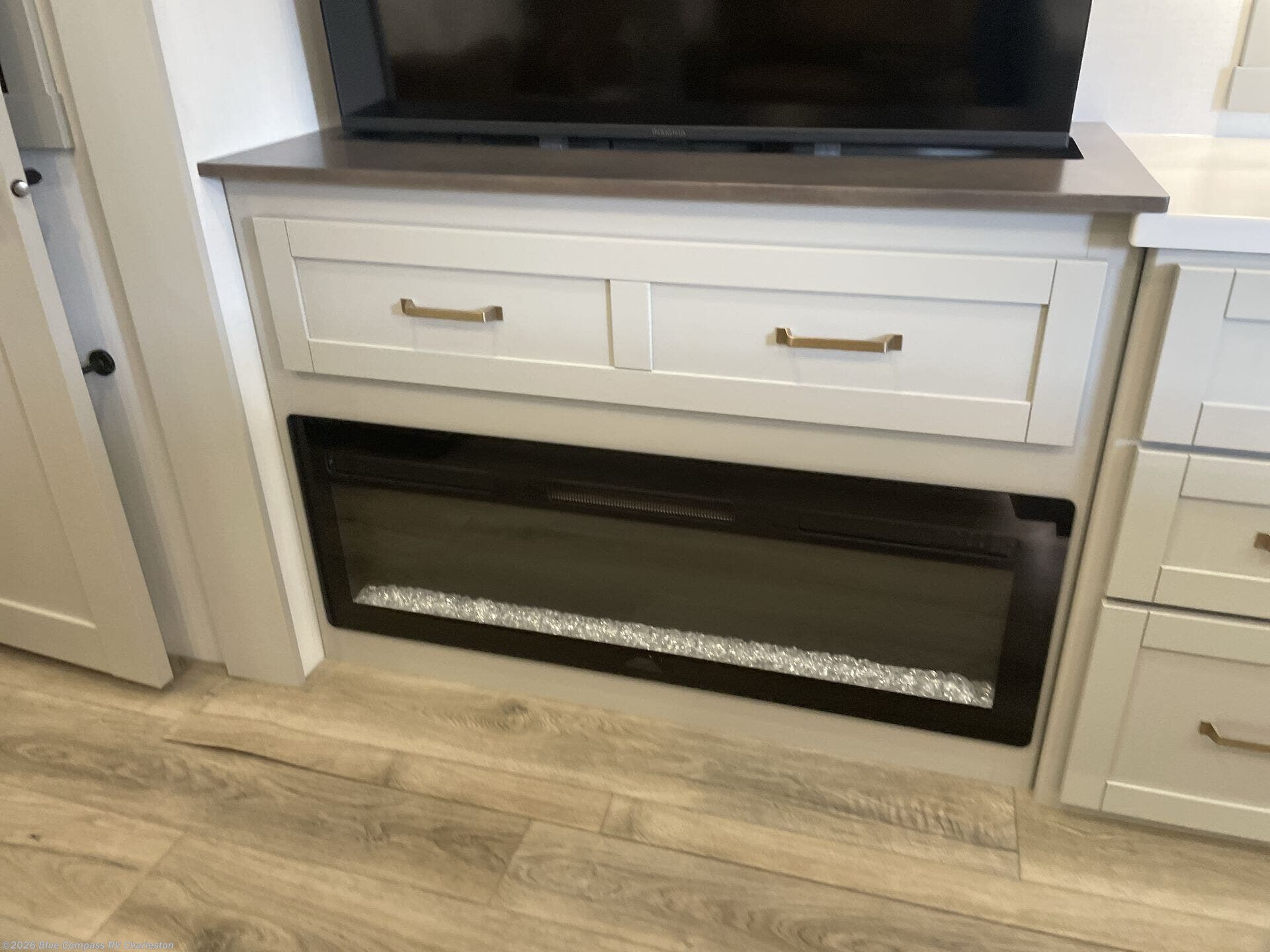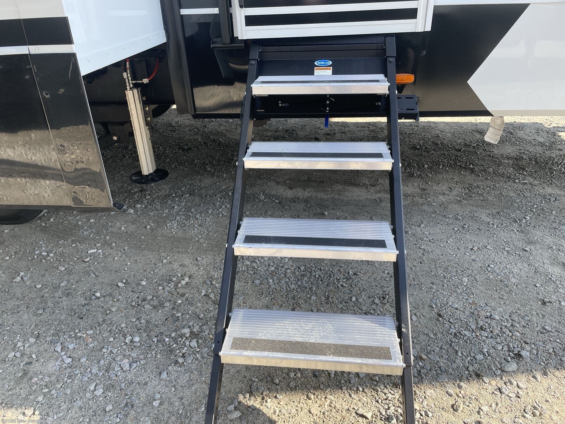 If you're looking for a feature-packed fifth wheel, this is the one! The rear multipurpose flex space can be used as an office/butler's pantry/laundry room/mudroom! There is an adjustable-height desk, storage space, plus washer and dryer prep. One of the dual entry doors is even found here for added convenience. The combined middle kitchen and living room includes dual opposing slides, a tri-fold sofa, theater seating, and a sliding desk/dining table. There is also a televator and fireplace, kitchen island with pet bowls, and an 84" pantry with adjustable shelving to name a few more features. A full bath towards the front includes a 30" x 42" shower, and the front private bedroom will feel just like home with its king bed slide out. There is also a sliding dresser top with hidden storage, bedside shelves, a front wardrobe, and washer and dryer prep here also!