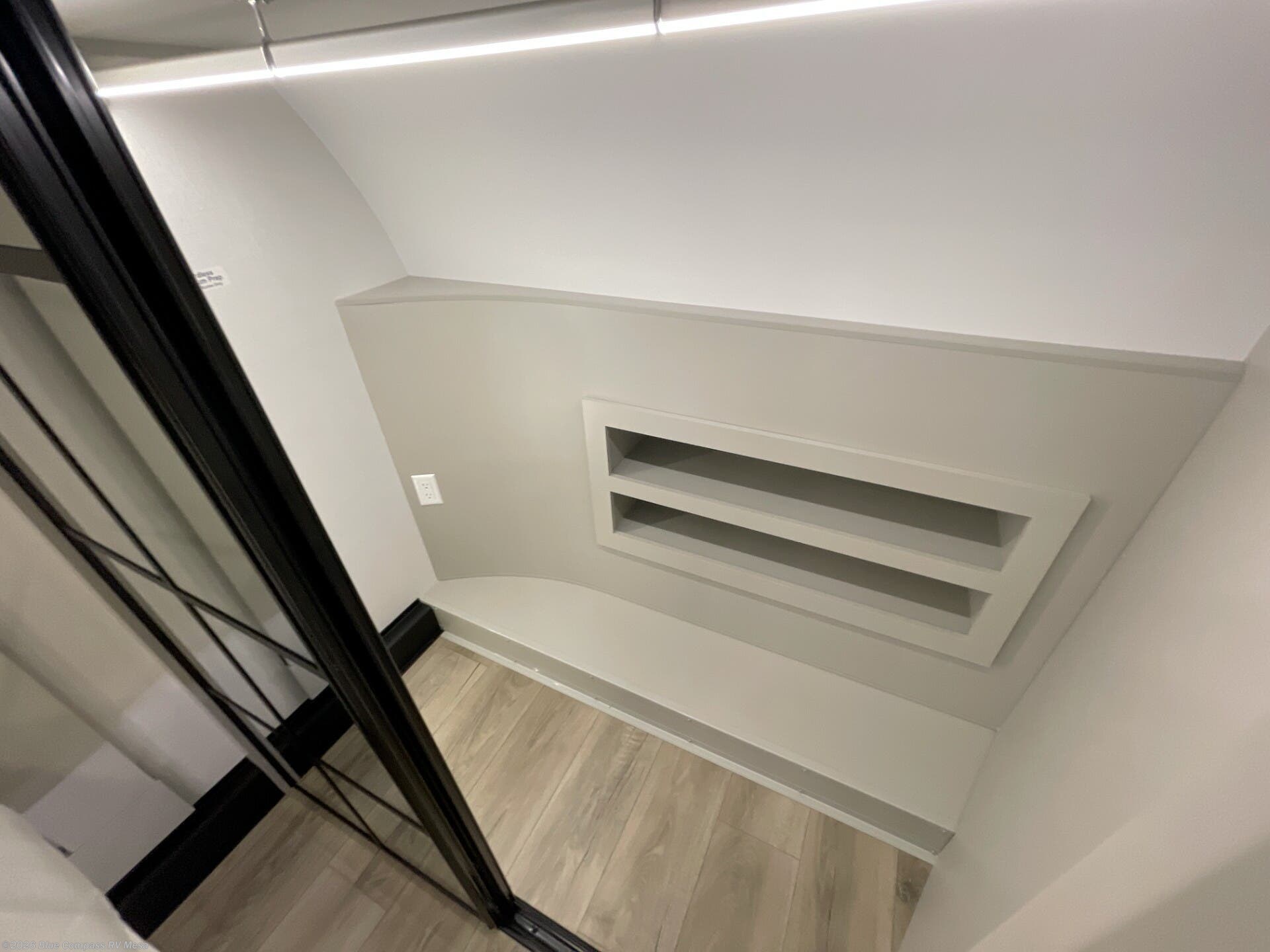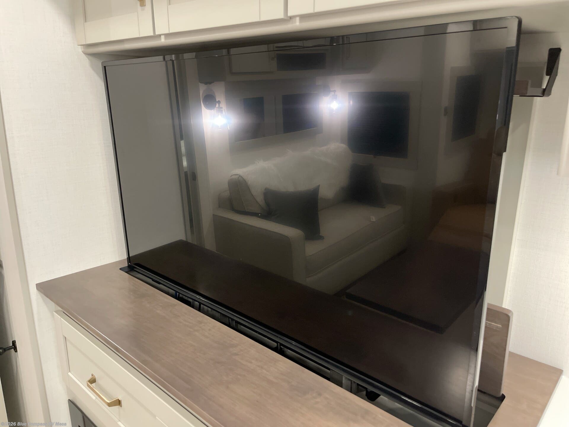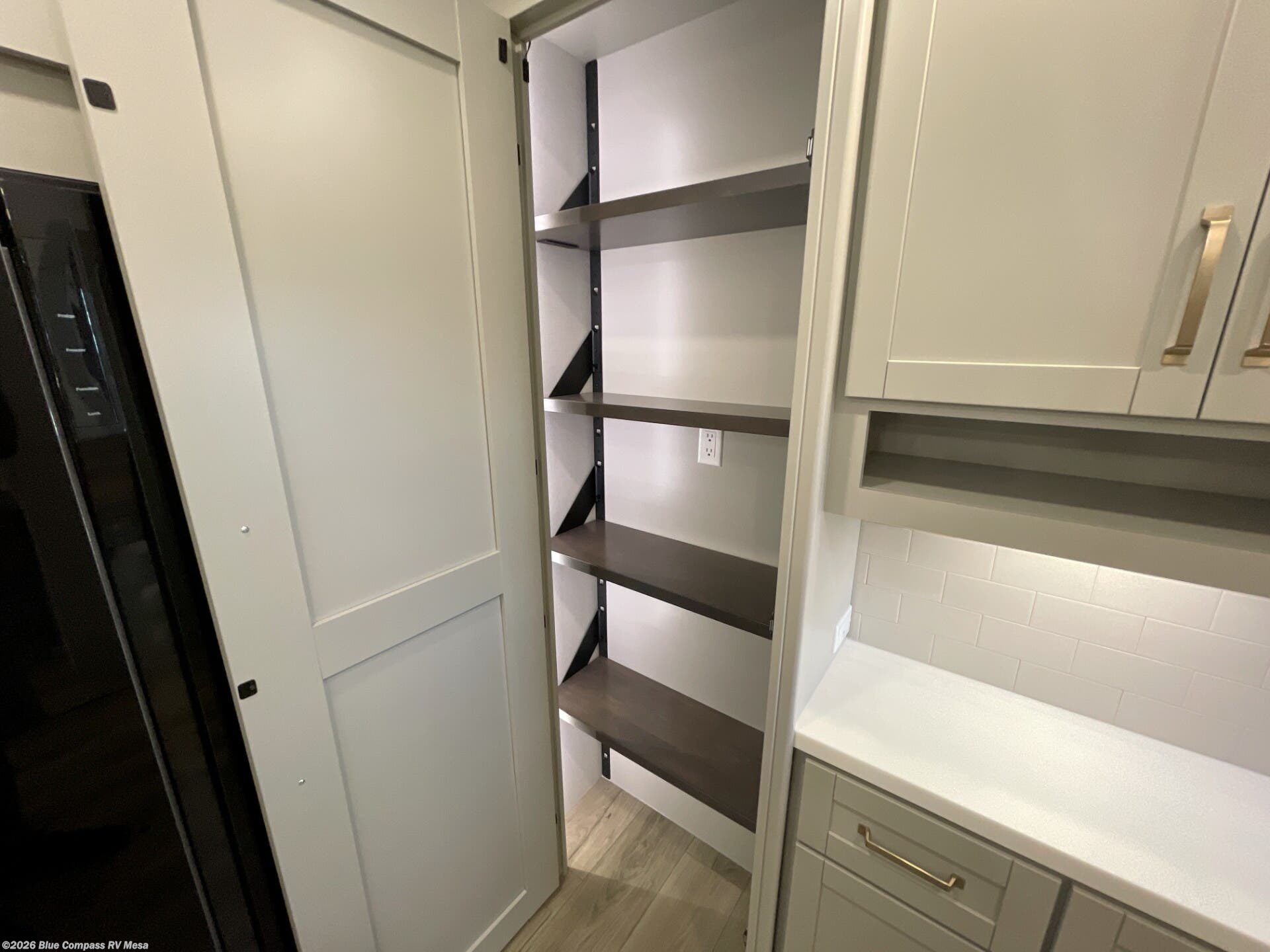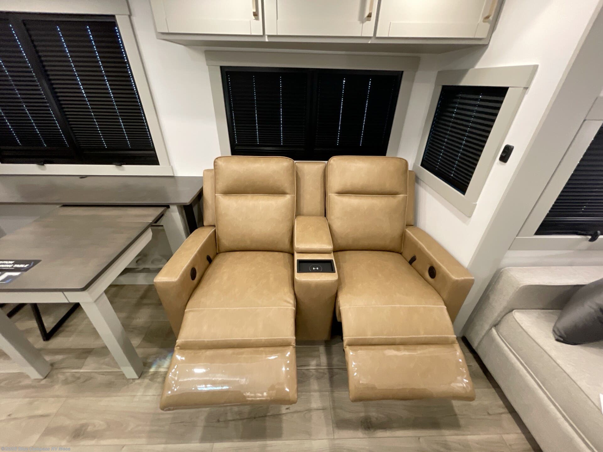 If you're looking for a feature-packed fifth wheel, this is the one! The rear multipurpose flex space can be used as an office/butler's pantry/laundry room/mudroom! There is an adjustable-height desk, storage space, plus washer and dryer prep. One of the dual entry doors is even found here for added convenience. The combined middle kitchen and living room includes dual opposing slides, a tri-fold sofa, theater seating, and a sliding desk/dining table. There is also a televator and fireplace, kitchen island with pet bowls, and an 84" pantry with adjustable shelving to name a few more features. A full bath towards the front includes a 30" x 42" shower, and the front private bedroom will feel just like home with its king bed slide out. There is also a sliding dresser top with hidden storage, bedside shelves, a front wardrobe, and washer and dryer prep here also!