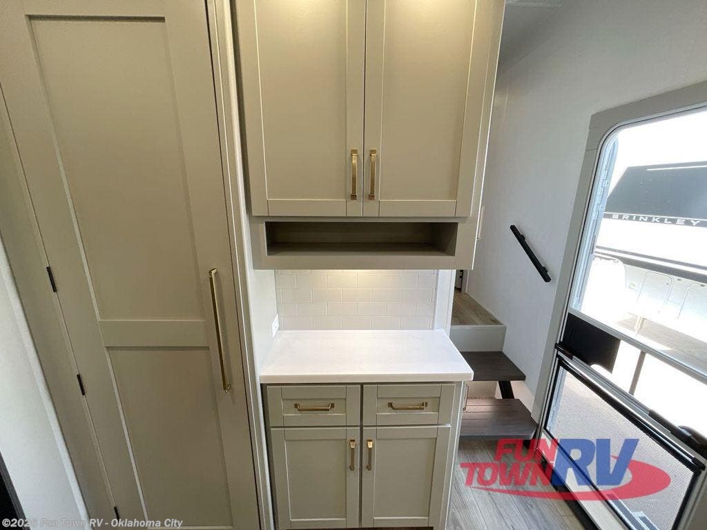 The Brinkley mid-profile Model Z fifth wheels bring you clean lines and an upscale look with plenty of style and exciting new features like the industry first brass plumbing connections. These units also feature an automotive grade front cap, plenty of exterior storage, dual exterior hot and cold showers, and wide stance leveling jacks for easy set up. Residential frameless windows provide a clean look and beautiful views, and ample electrical outlets and 6 USB/USB-C outlets allow all of your electronics and appliances to easily be used and charged.