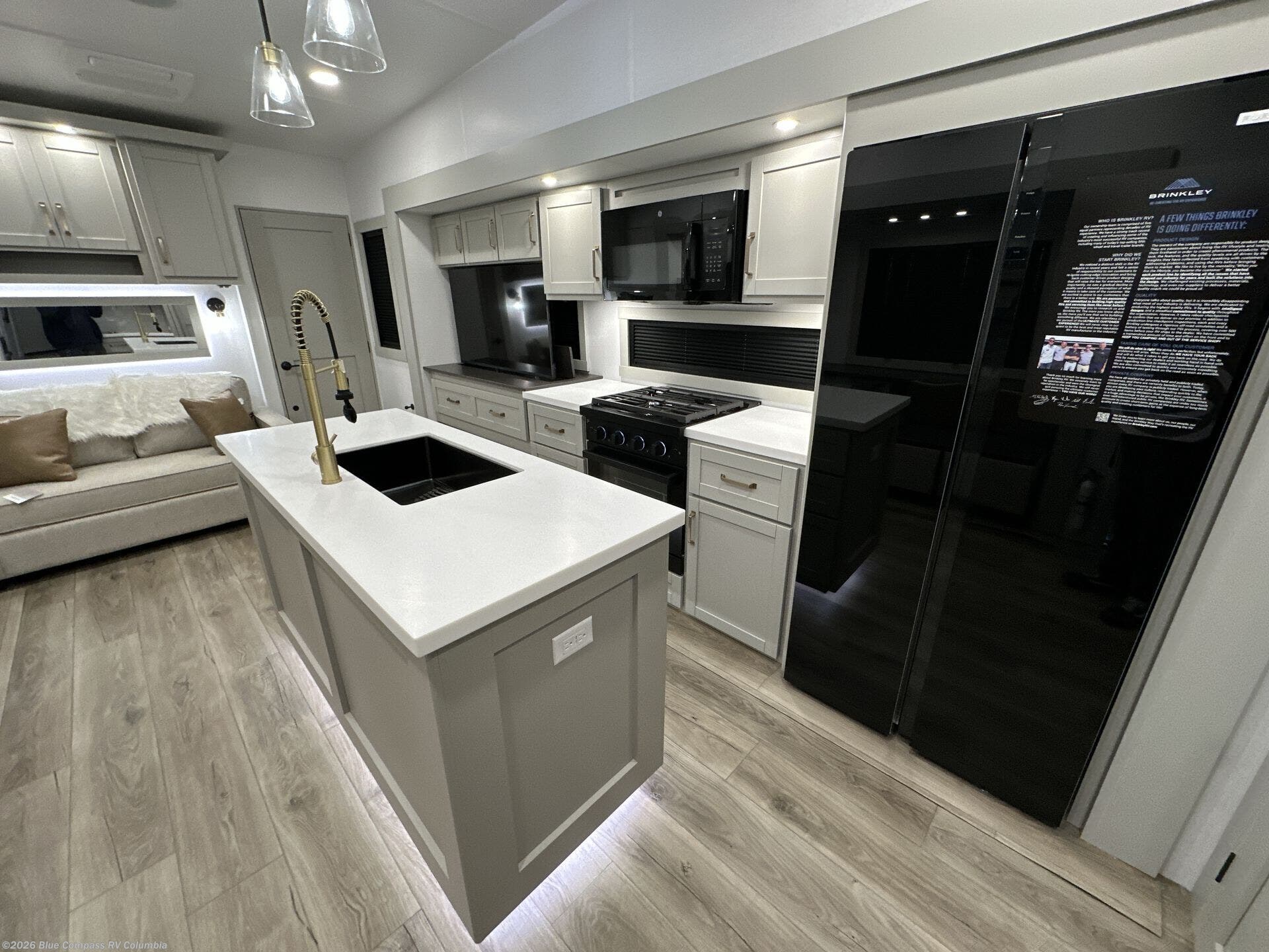 The Brinkley mid-profile Model Z fifth wheels bring you clean lines and an upscale look with plenty of style and exciting new features like the industry first brass plumbing connections. These units also feature an automotive grade front cap, plenty of exterior storage, dual exterior hot and cold showers, and wide stance leveling jacks for easy set up. Residential frameless windows provide a clean look and beautiful views, and ample electrical outlets and 6 USB/USB-C outlets allow all of your electronics and appliances to easily be used and charged.