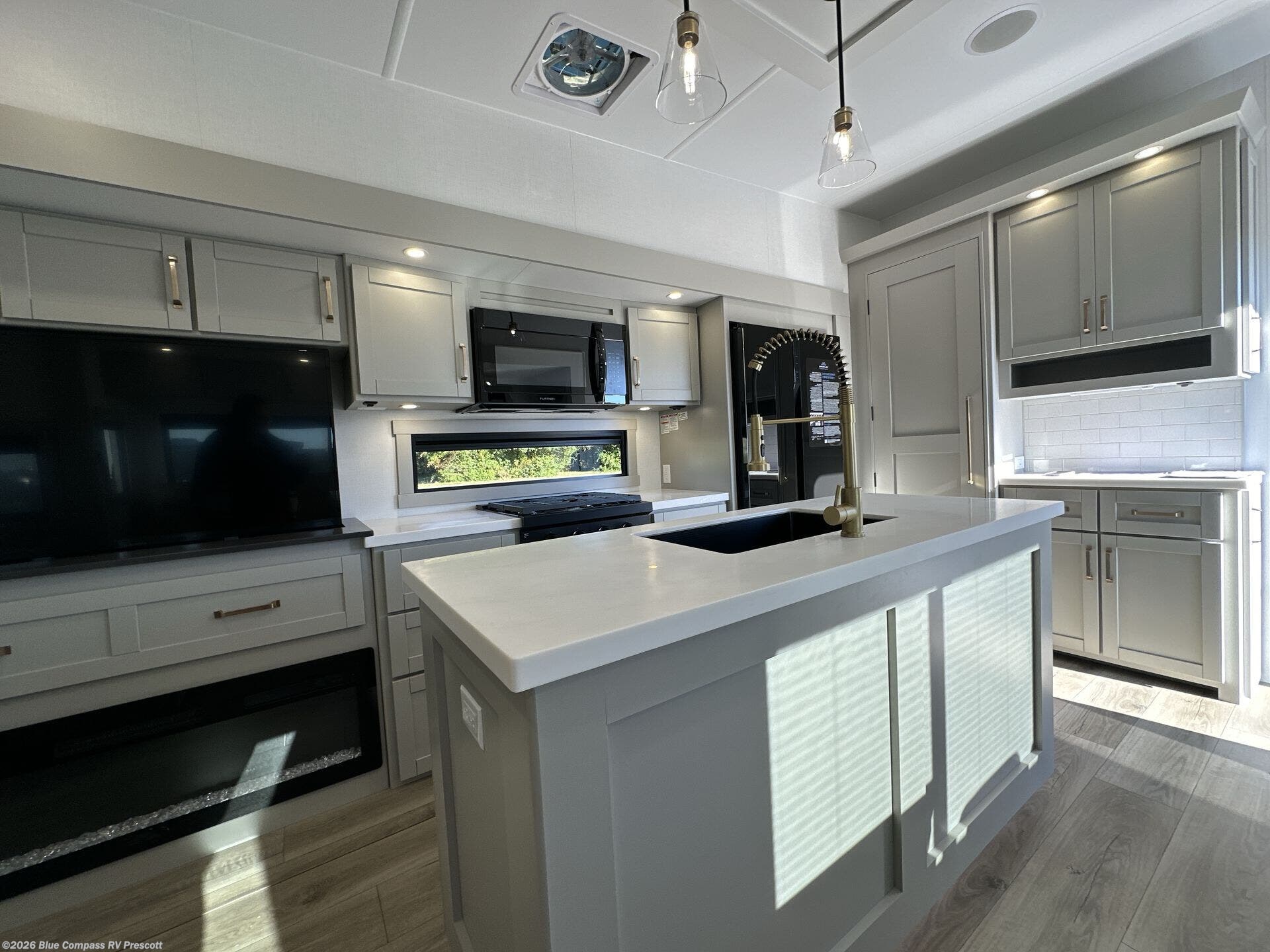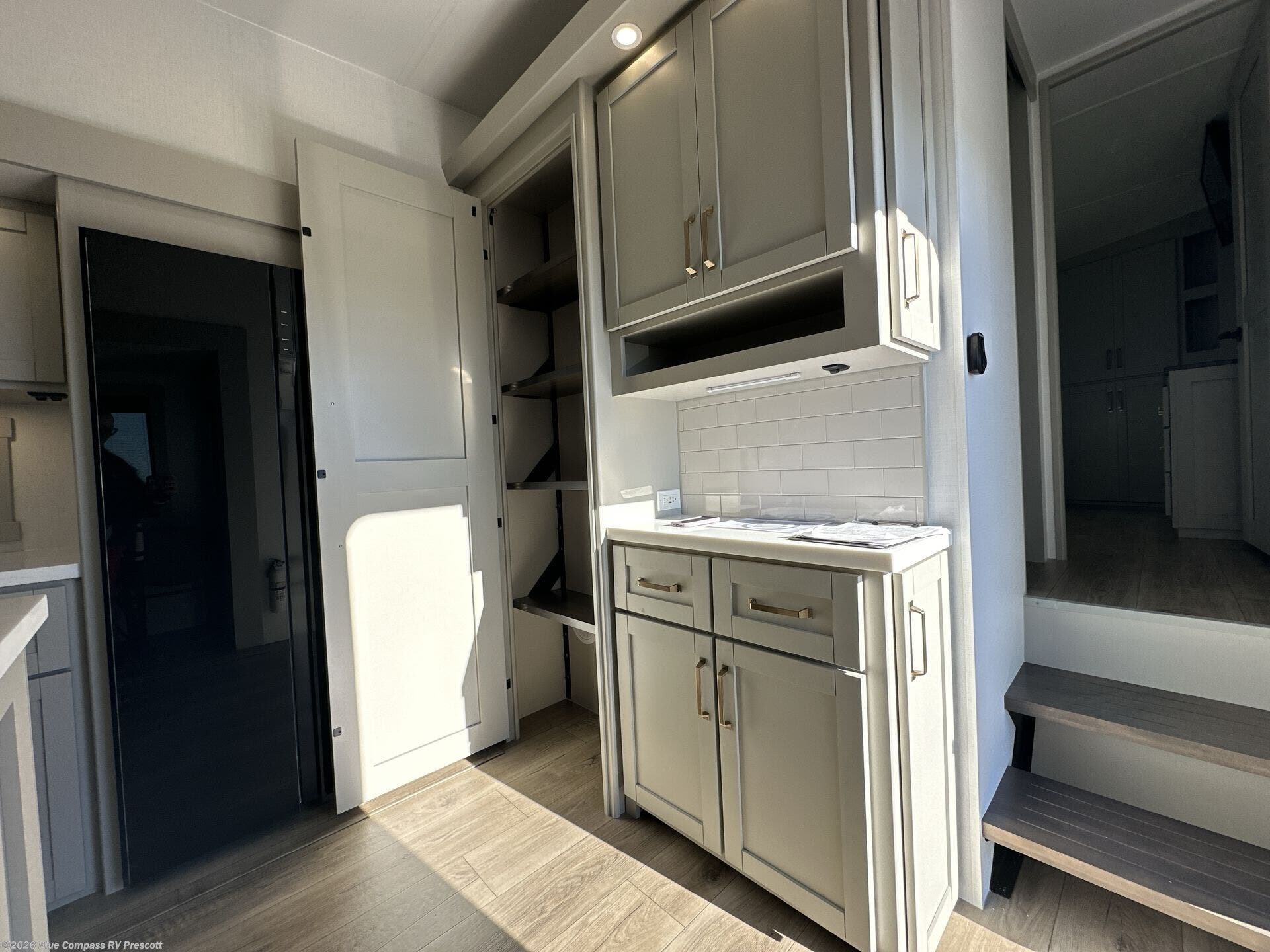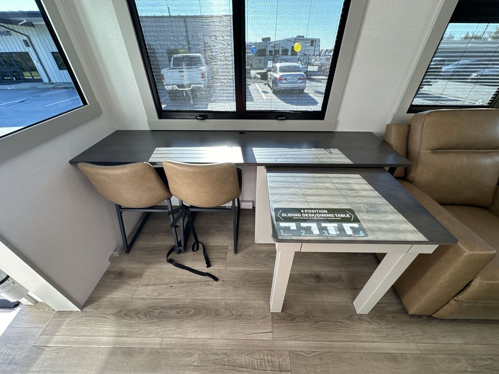 If you're looking for a feature-packed fifth wheel, this is the one! The rear multipurpose flex space can be used as an office/butler's pantry/laundry room/mudroom! There is an adjustable-height desk, storage space, plus washer and dryer prep. One of the dual entry doors is even found here for added convenience. The combined middle kitchen and living room includes dual opposing slides, a tri-fold sofa, theater seating, and a sliding desk/dining table. There is also a televator and fireplace, kitchen island with pet bowls, and an 84" pantry with adjustable shelving to name a few more features. A full bath towards the front includes a 30" x 42" shower, and the front private bedroom will feel just like home with its king bed slide out. There is also a sliding dresser top with hidden storage, bedside shelves, a front wardrobe, and washer and dryer prep here also!