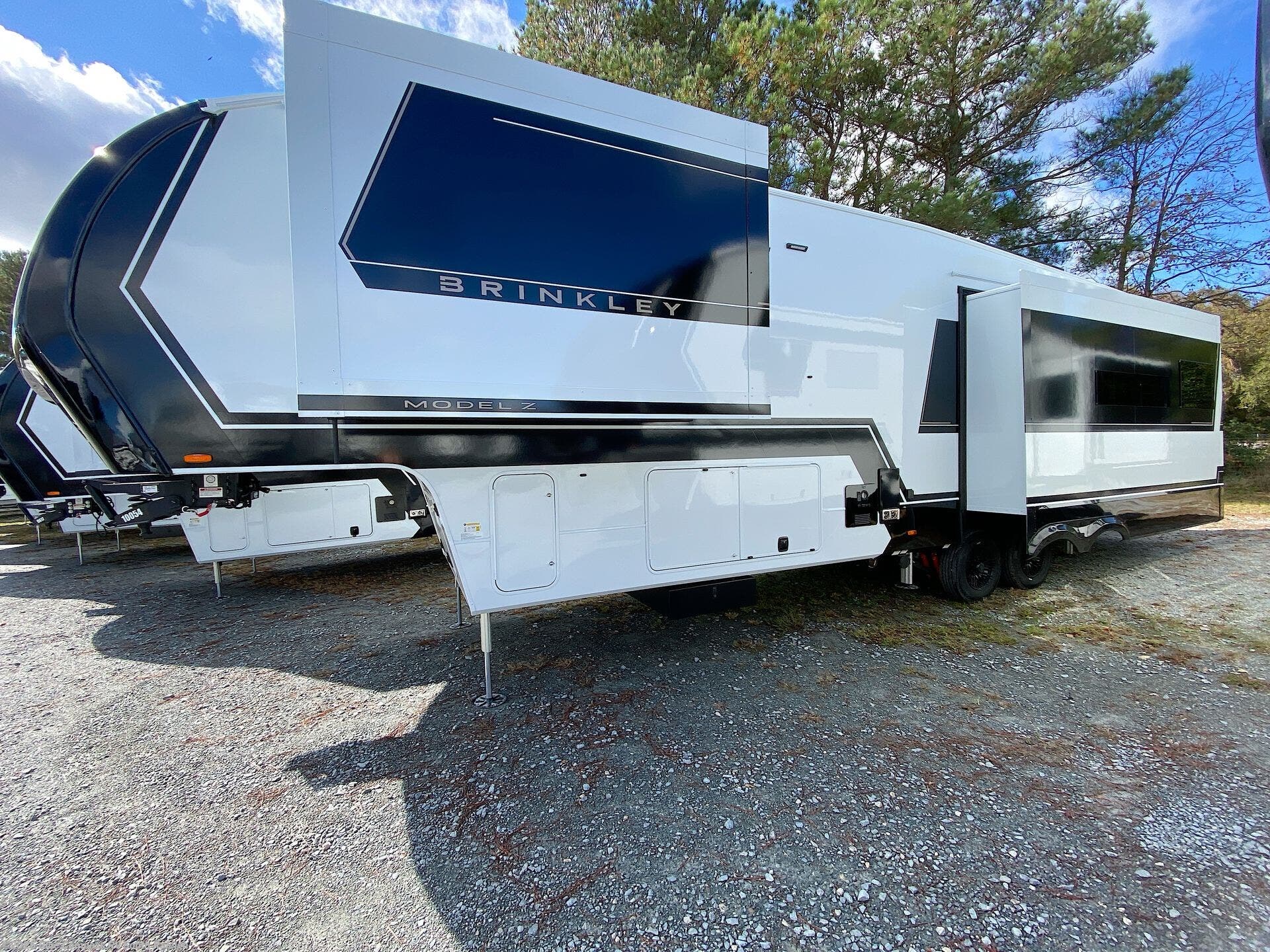 The Brinkley mid-profile Model Z fifth wheels bring you clean lines and an upscale look with plenty of style and exciting new features like the industry first brass plumbing connections. These units also feature an automotive grade front cap, plenty of exterior storage, dual exterior hot and cold showers, and wide stance leveling jacks for easy set up. Residential frameless windows provide a clean look and beautiful views, and ample electrical outlets and 6 USB/USB-C outlets allow all of your electronics and appliances to easily be used and charged.