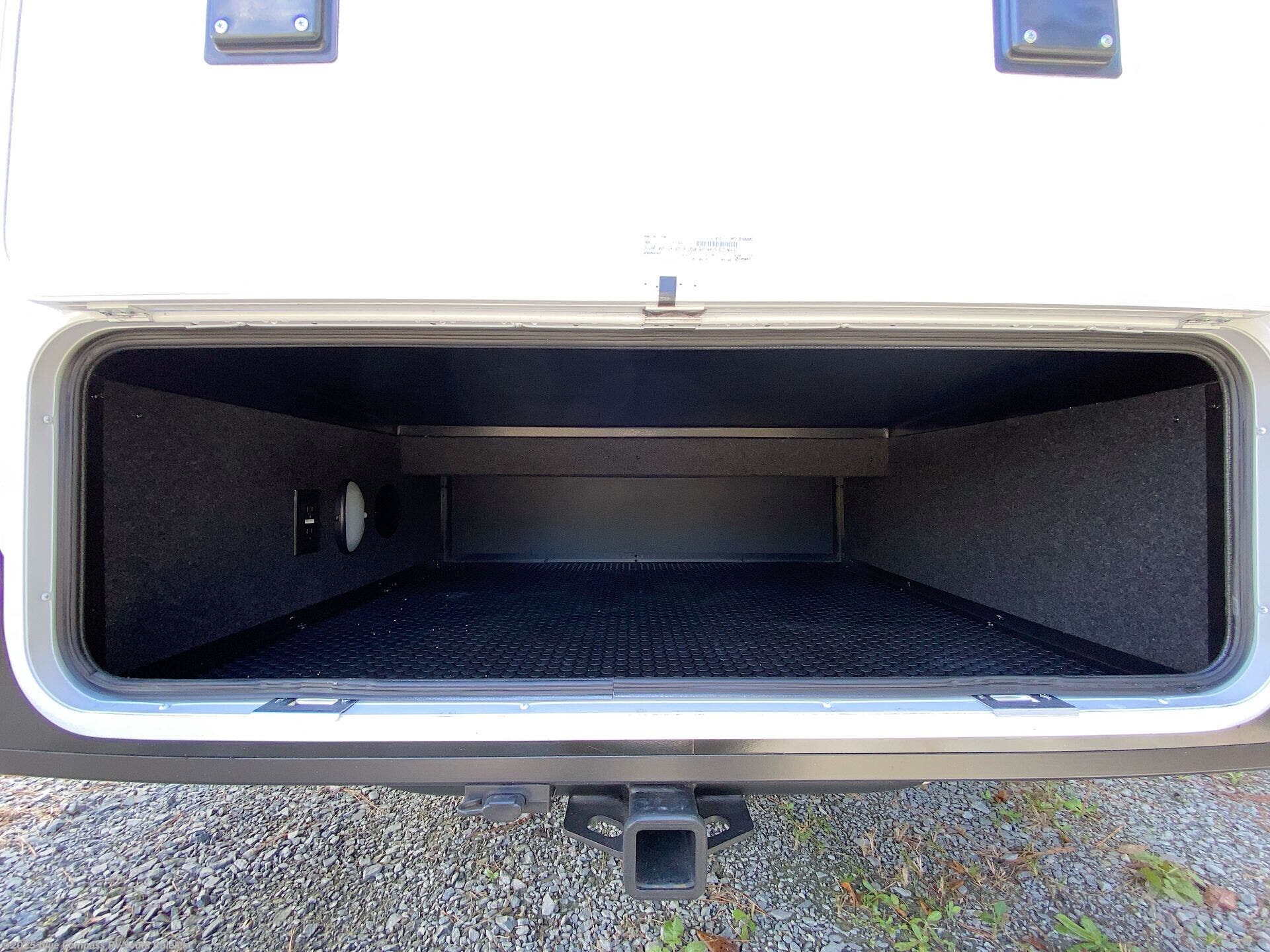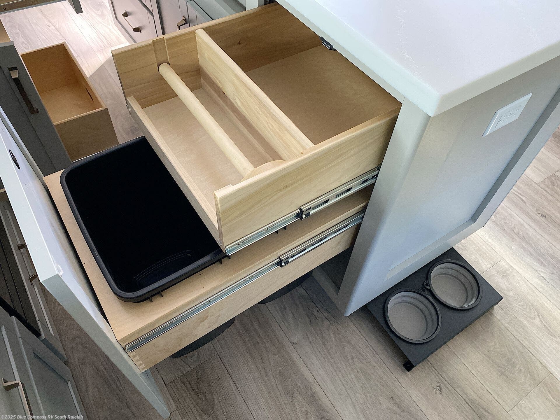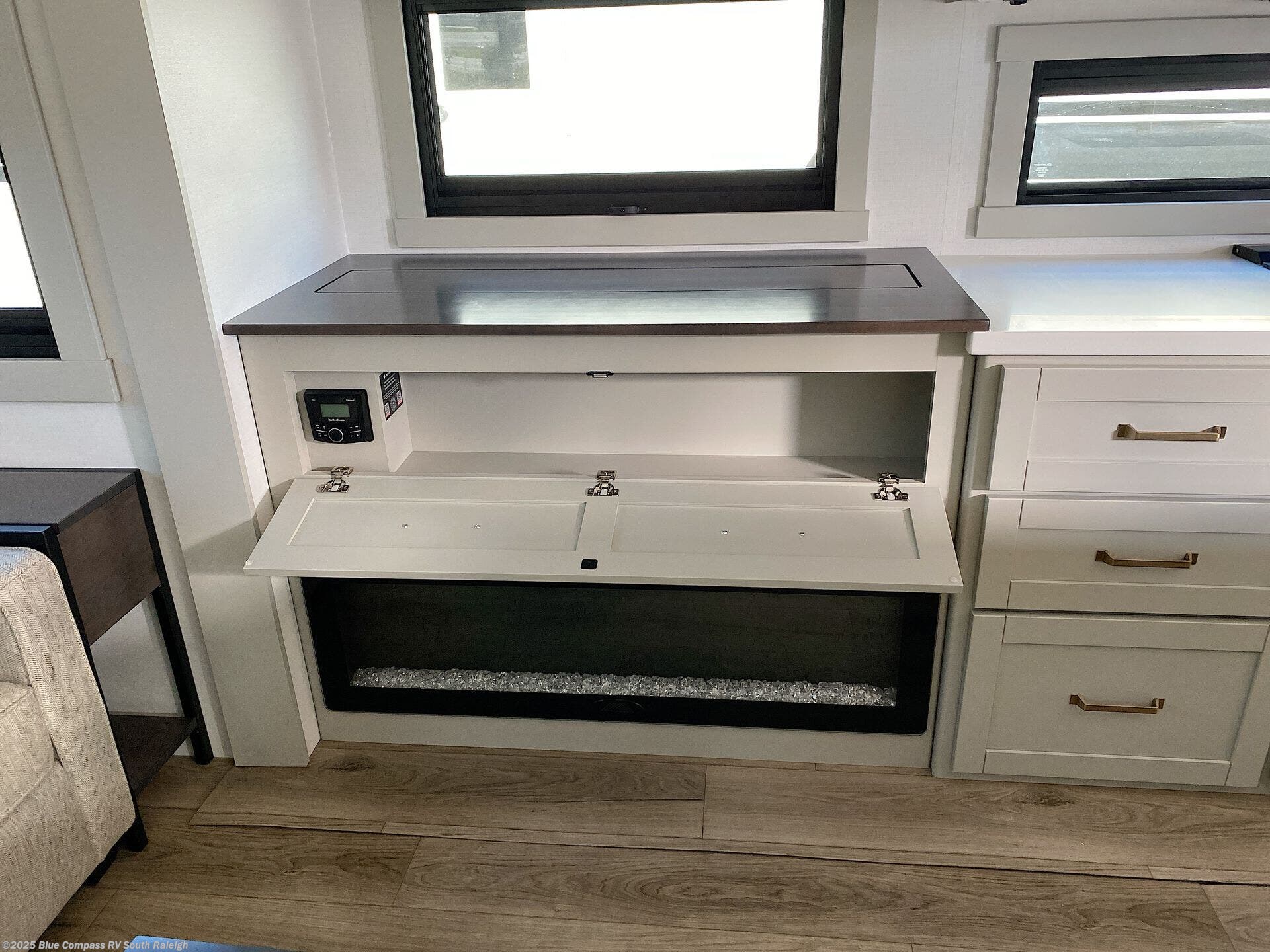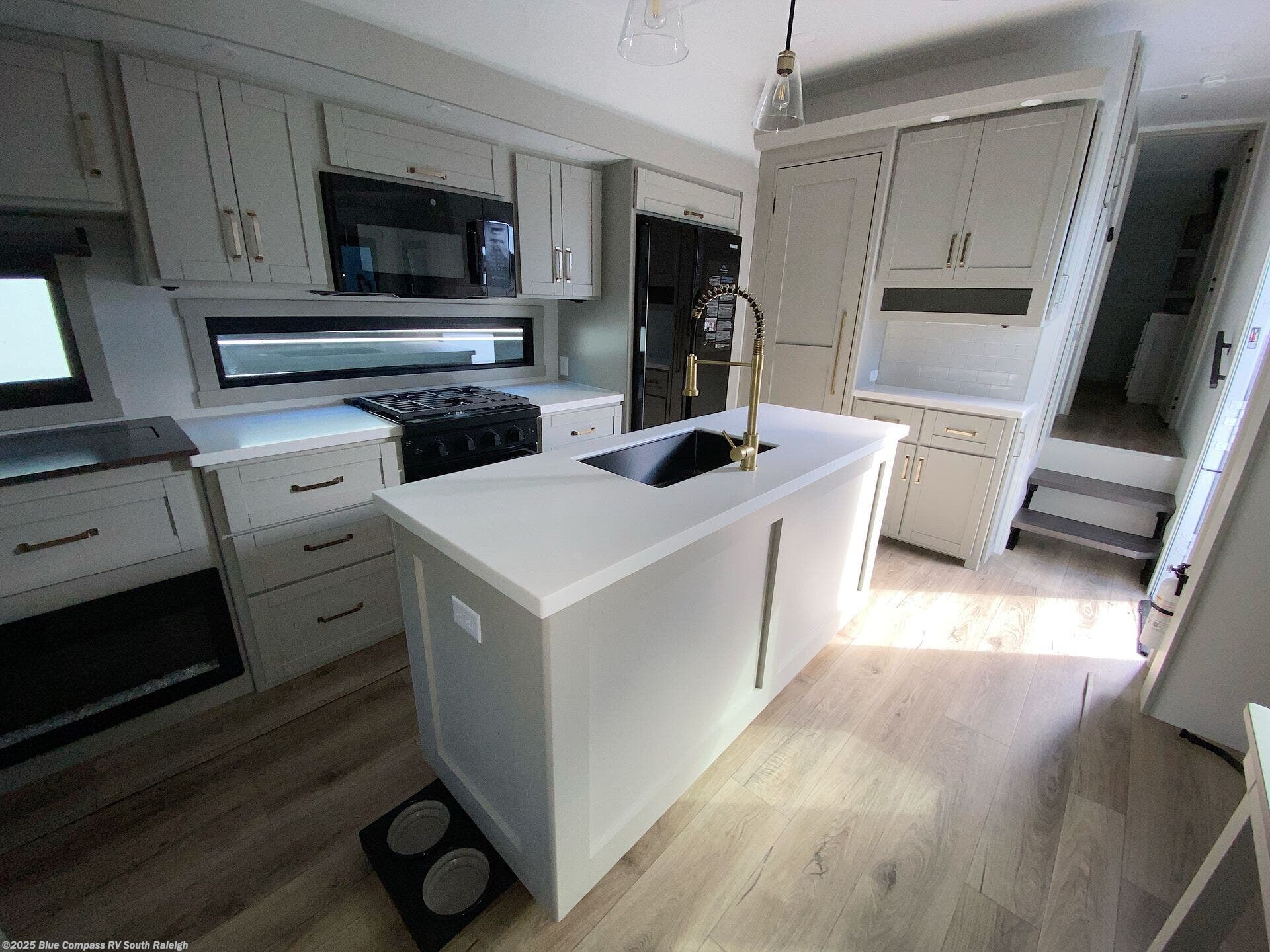 This unit is perfect for weekends at the campground or extended stays! There is ample seating with a sliding desk/dining table, 62" theater seating, and a 72" tri-fold sofa along the rear wall. You can easily relax and enjoy the telescoping TV with a cozy fireplace below. The kitchen offers all that you need to prepare and cook meals just like home with a 16-cu. ft. refrigerator for your perishables, a 30" residential microwave oven, and three burner range top and oven. You will love the kitchen island all outfitted with pull-out pet bowls and double pull-out trash bins with an integrated Stow & Go paper towel holder. There is also an 84" pantry with adjustable shelves for all of your canned and dry goods. Head up the steps to a find a full bath and a private bedroom with a king bed slide all the way up front. A sliding dresser top features hidden storage which is perfect for jewelry and other personal belongings. The front wardrobe features mirrored doors, and the corner closet has been prepped for a stackable washer and dryer if you choose to add that option.