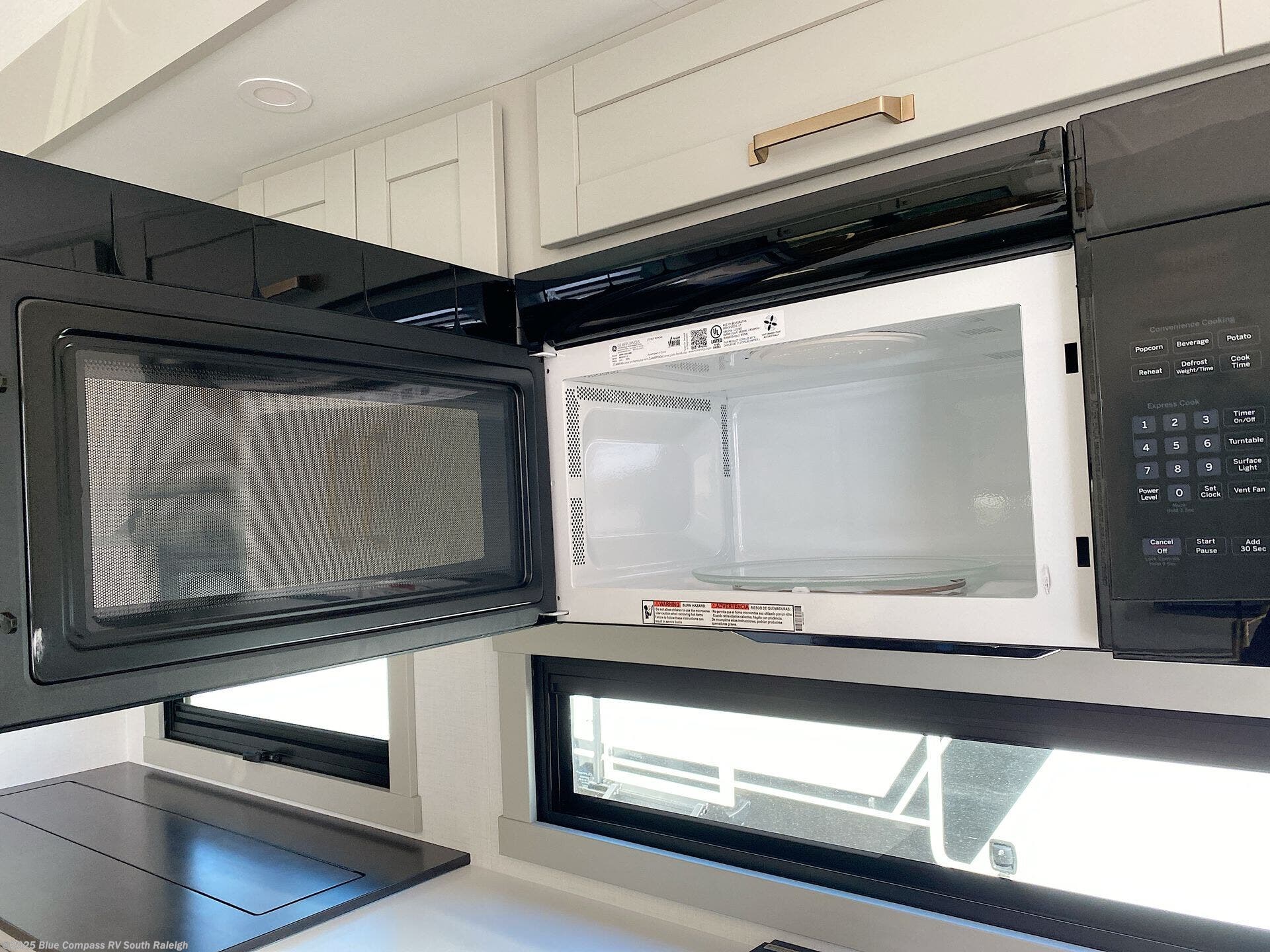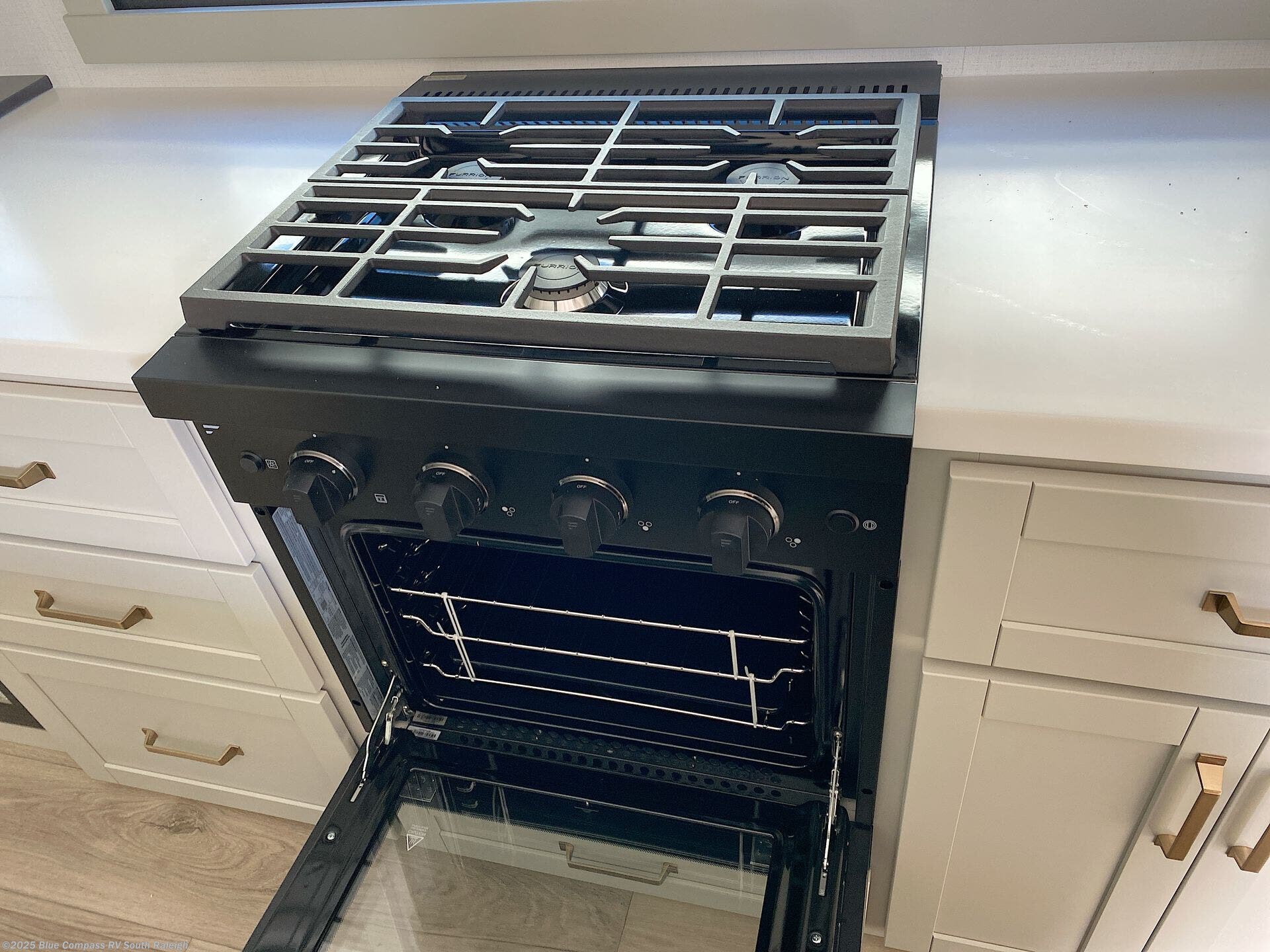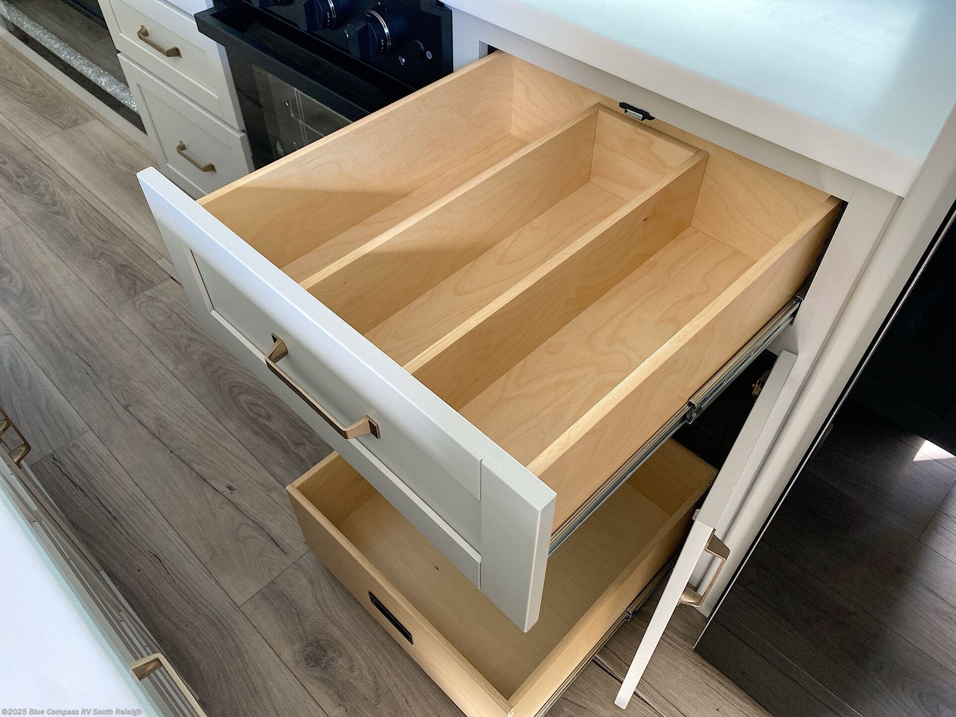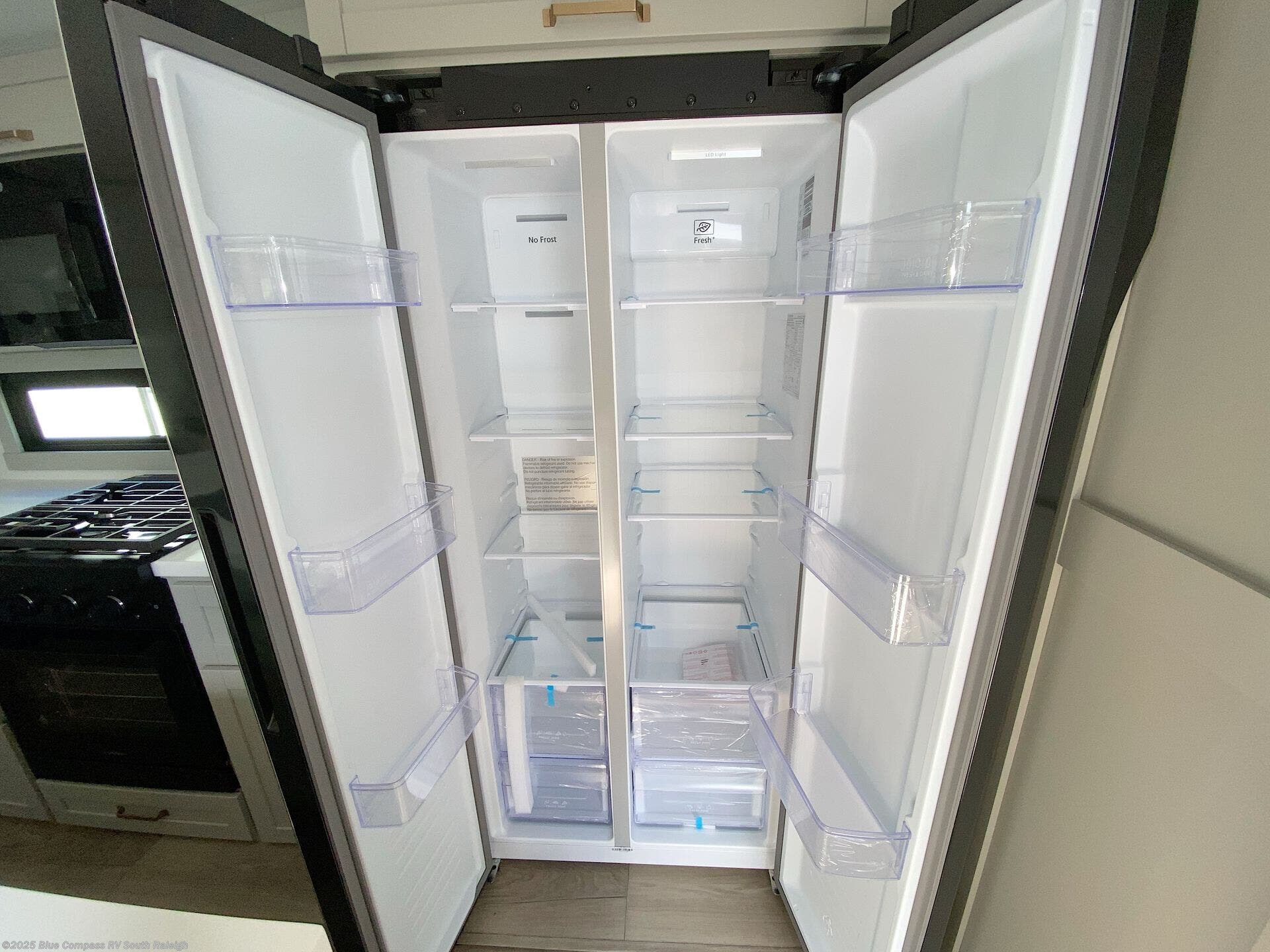 This unit is perfect for weekends at the campground or extended stays! There is ample seating with a sliding desk/dining table, 62" theater seating, and a 72" tri-fold sofa along the rear wall. You can easily relax and enjoy the telescoping TV with a cozy fireplace below. The kitchen offers all that you need to prepare and cook meals just like home with a 16-cu. ft. refrigerator for your perishables, a 30" residential microwave oven, and three burner range top and oven. You will love the kitchen island all outfitted with pull-out pet bowls and double pull-out trash bins with an integrated Stow & Go paper towel holder. There is also an 84" pantry with adjustable shelves for all of your canned and dry goods. Head up the steps to a find a full bath and a private bedroom with a king bed slide all the way up front. A sliding dresser top features hidden storage which is perfect for jewelry and other personal belongings. The front wardrobe features mirrored doors, and the corner closet has been prepped for a stackable washer and dryer if you choose to add that option.