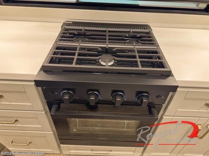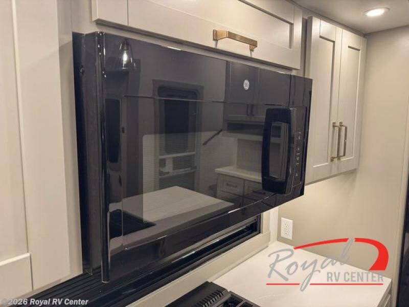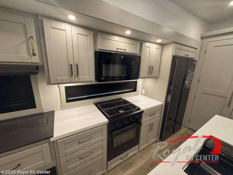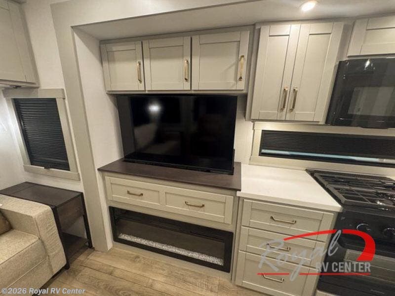 This unit is perfect for weekends at the campground or extended stays! There is ample seating with a sliding desk/dining table, 62" theater seating, and a 72" tri-fold sofa along the rear wall. You can easily relax and enjoy the telescoping TV with a cozy fireplace below. The kitchen offers all that you need to prepare and cook meals just like home with a 16-cu. ft. refrigerator for your perishables, a 30" residential microwave oven, and three burner range top and oven. You will love the kitchen island all outfitted with pull-out pet bowls and double pull-out trash bins with an integrated Stow & Go paper towel holder. There is also an 84" pantry with adjustable shelves for all of your canned and dry goods. Head up the steps to a find a full bath and a private bedroom with a king bed slide all the way up front. A sliding dresser top features hidden storage which is perfect for jewelry and other personal belongings. The front wardrobe features mirrored doors, and the corner closet has been prepped for a stackable washer and dryer if you choose to add that option.