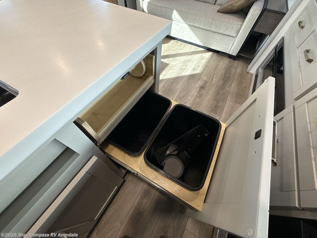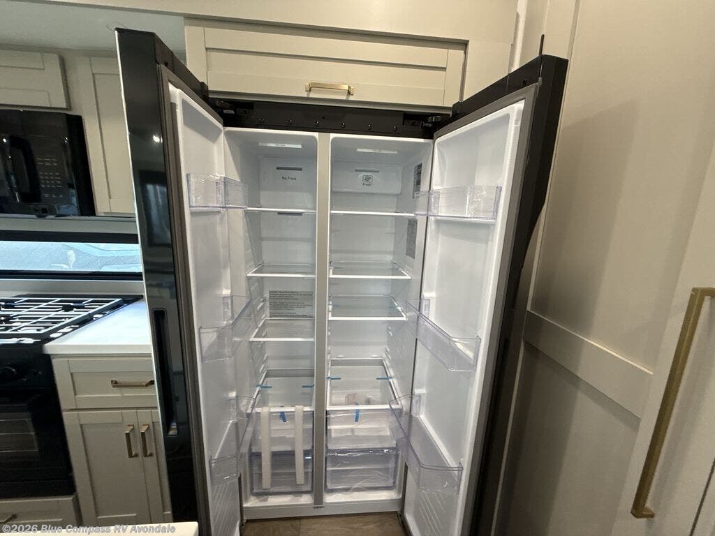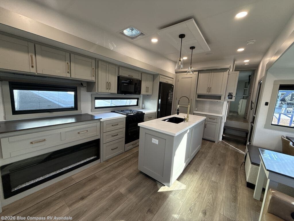 This unit is perfect for weekends at the campground or extended stays! There is ample seating with a sliding desk/dining table, 62" theater seating, and a 72" tri-fold sofa along the rear wall. You can easily relax and enjoy the telescoping TV with a cozy fireplace below. The kitchen offers all that you need to prepare and cook meals just like home with a 16-cu. ft. refrigerator for your perishables, a 30" residential microwave oven, and three burner range top and oven. You will love the kitchen island all outfitted with pull-out pet bowls and double pull-out trash bins with an integrated Stow & Go paper towel holder. There is also an 84" pantry with adjustable shelves for all of your canned and dry goods. Head up the steps to a find a full bath and a private bedroom with a king bed slide all the way up front. A sliding dresser top features hidden storage which is perfect for jewelry and other personal belongings. The front wardrobe features mirrored doors, and the corner closet has been prepped for a stackable washer and dryer if you choose to add that option.