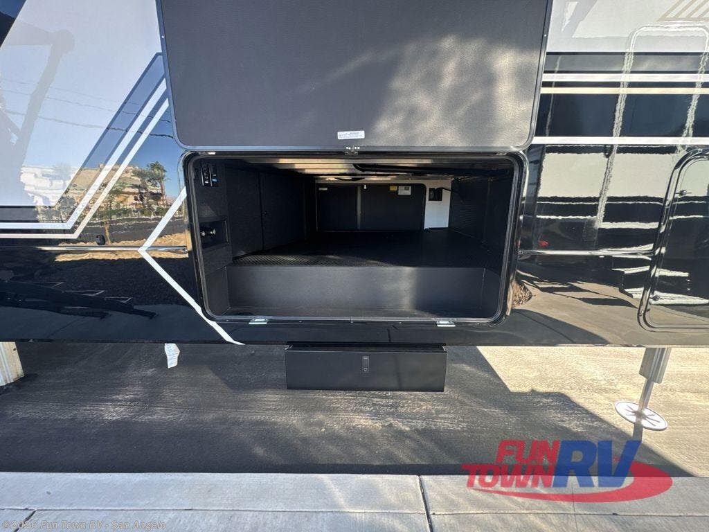 This unit is perfect for weekends at the campground or extended stays! There is ample seating with a sliding desk/dining table, 62" theater seating, and a 72" tri-fold sofa along the rear wall. You can easily relax and enjoy the telescoping TV with a cozy fireplace below. The kitchen offers all that you need to prepare and cook meals just like home with a 16-cu. ft. refrigerator for your perishables, a 30" residential microwave oven, and three burner range top and oven. You will love the kitchen island all outfitted with pull-out pet bowls and double pull-out trash bins with an integrated Stow & Go paper towel holder. There is also an 84" pantry with adjustable shelves for all of your canned and dry goods. Head up the steps to a find a full bath and a private bedroom with a king bed slide all the way up front. A sliding dresser top features hidden storage which is perfect for jewelry and other personal belongings. The front wardrobe features mirrored doors, and the corner closet has been prepped for a stackable washer and dryer if you choose to add that option.