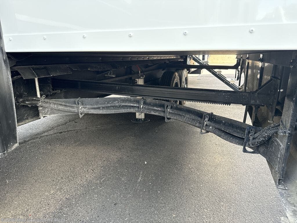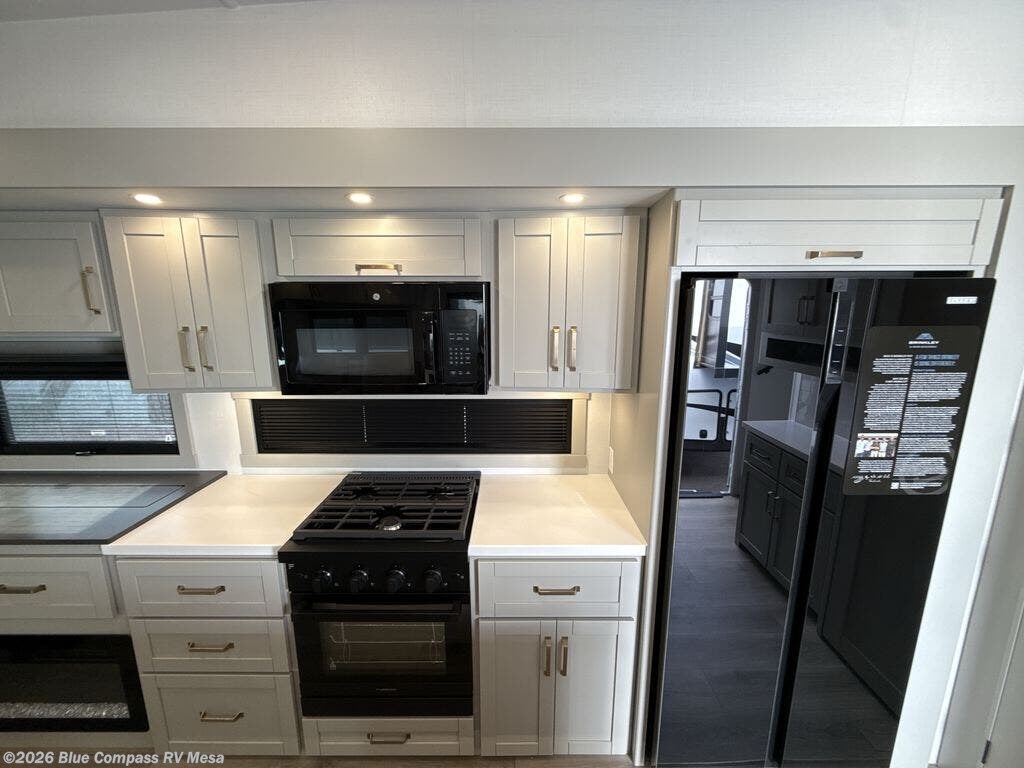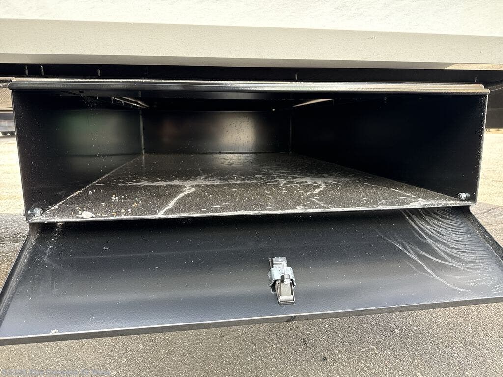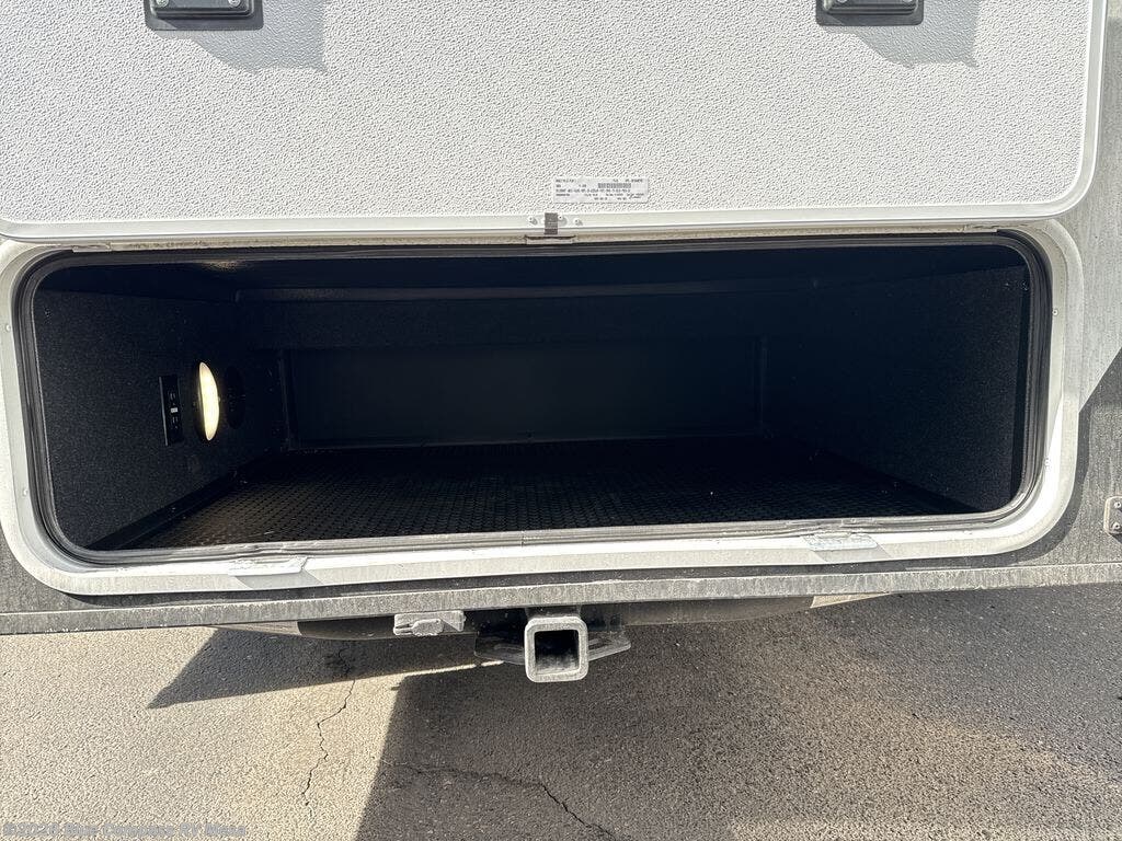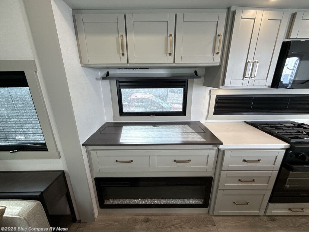 This unit is perfect for weekends at the campground or extended stays! There is ample seating with a sliding desk/dining table, 62" theater seating, and a 72" tri-fold sofa along the rear wall. You can easily relax and enjoy the telescoping TV with a cozy fireplace below. The kitchen offers all that you need to prepare and cook meals just like home with a 16-cu. ft. refrigerator for your perishables, a 30" residential microwave oven, and three burner range top and oven. You will love the kitchen island all outfitted with pull-out pet bowls and double pull-out trash bins with an integrated Stow & Go paper towel holder. There is also an 84" pantry with adjustable shelves for all of your canned and dry goods. Head up the steps to a find a full bath and a private bedroom with a king bed slide all the way up front. A sliding dresser top features hidden storage which is perfect for jewelry and other personal belongings. The front wardrobe features mirrored doors, and the corner closet has been prepped for a stackable washer and dryer if you choose to add that option.
