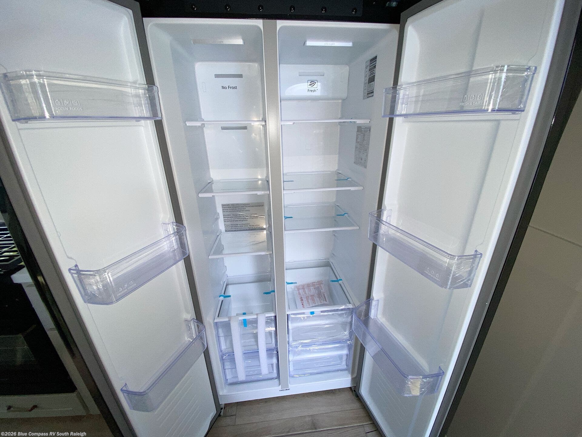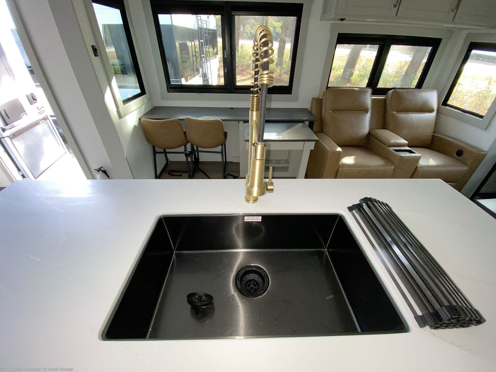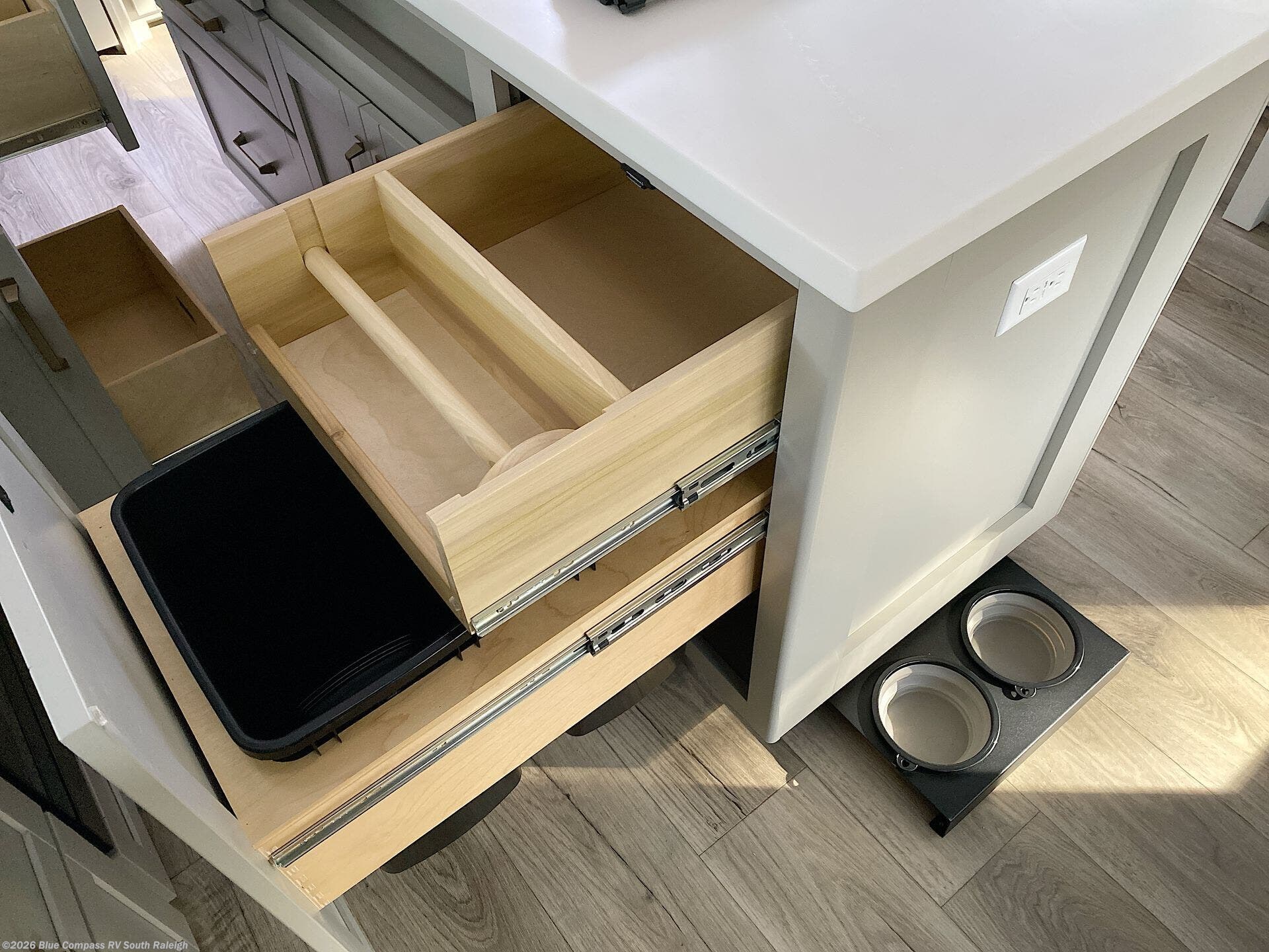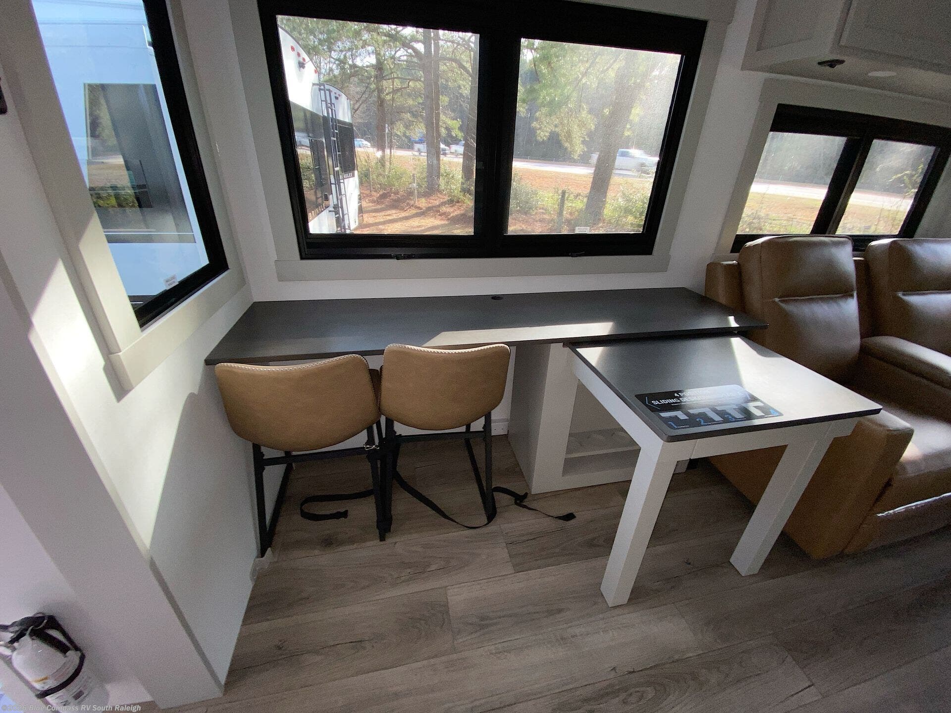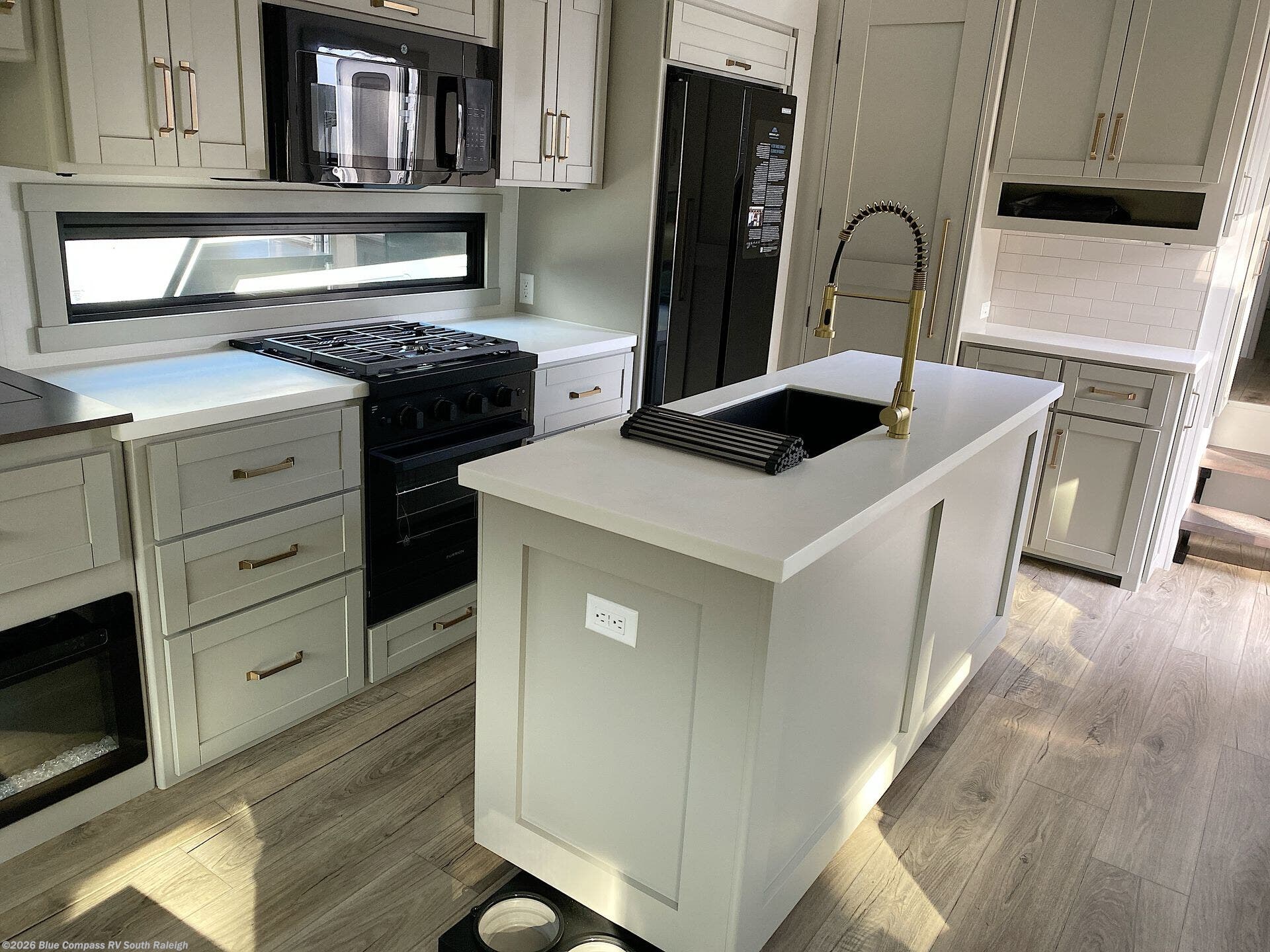 This unit is perfect for weekends at the campground or extended stays! There is ample seating with a sliding desk/dining table, 62" theater seating, and a 72" tri-fold sofa along the rear wall. You can easily relax and enjoy the telescoping TV with a cozy fireplace below. The kitchen offers all that you need to prepare and cook meals just like home with a 16-cu. ft. refrigerator for your perishables, a 30" residential microwave oven, and three burner range top and oven. You will love the kitchen island all outfitted with pull-out pet bowls and double pull-out trash bins with an integrated Stow & Go paper towel holder. There is also an 84" pantry with adjustable shelves for all of your canned and dry goods. Head up the steps to a find a full bath and a private bedroom with a king bed slide all the way up front. A sliding dresser top features hidden storage which is perfect for jewelry and other personal belongings. The front wardrobe features mirrored doors, and the corner closet has been prepped for a stackable washer and dryer if you choose to add that option.
