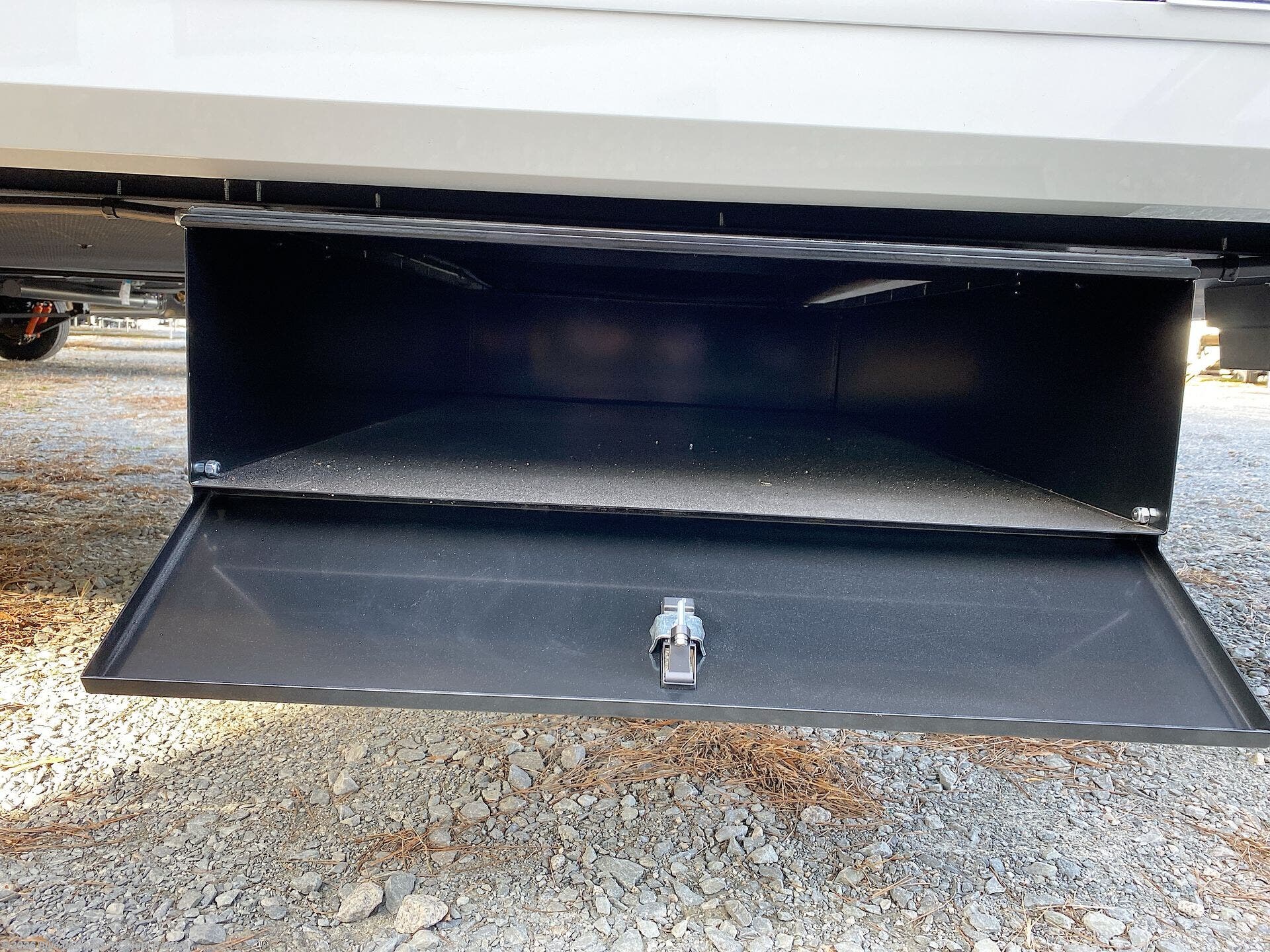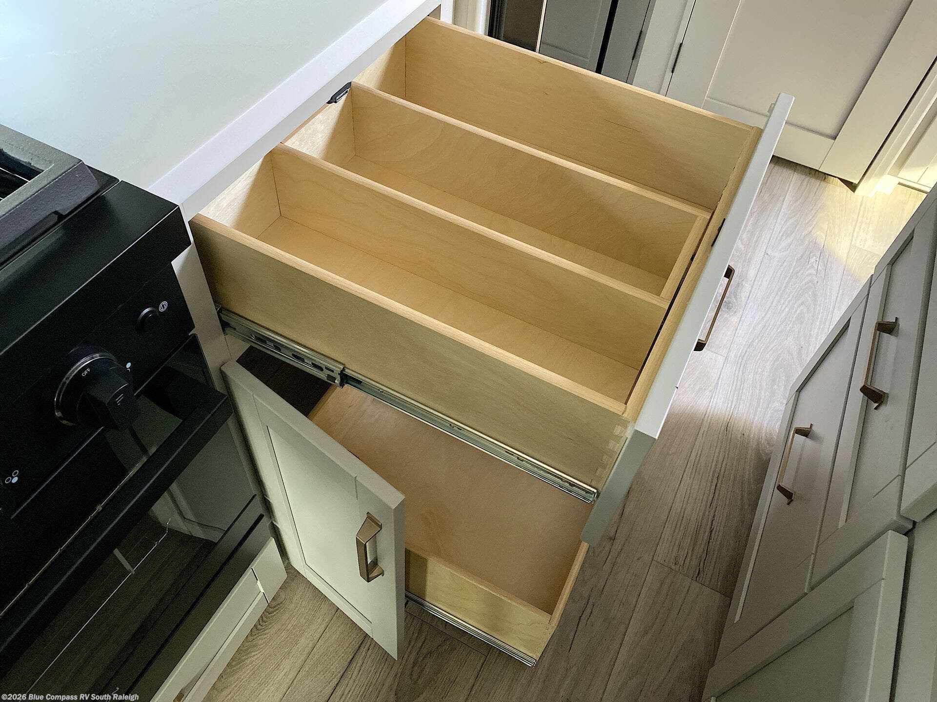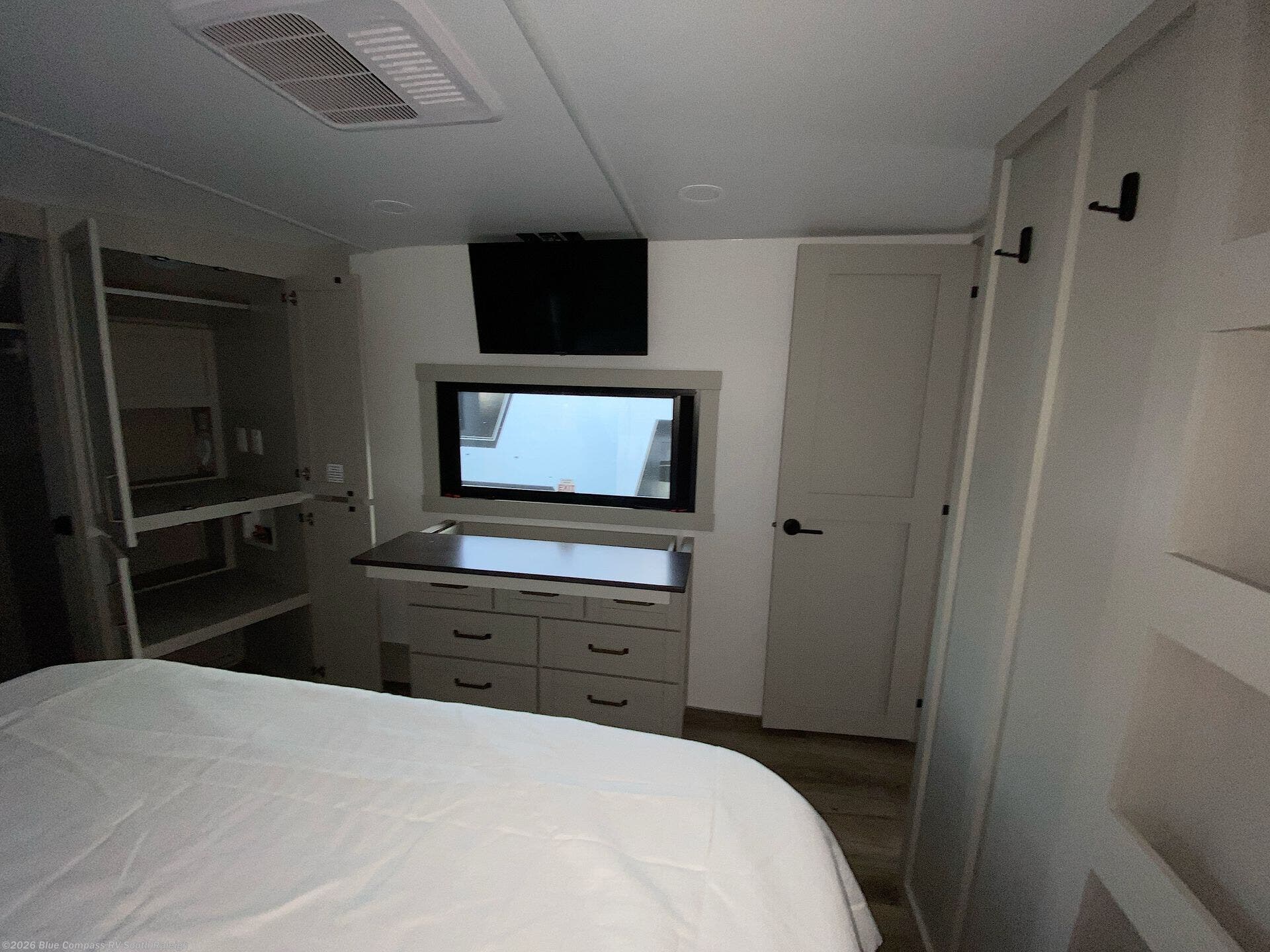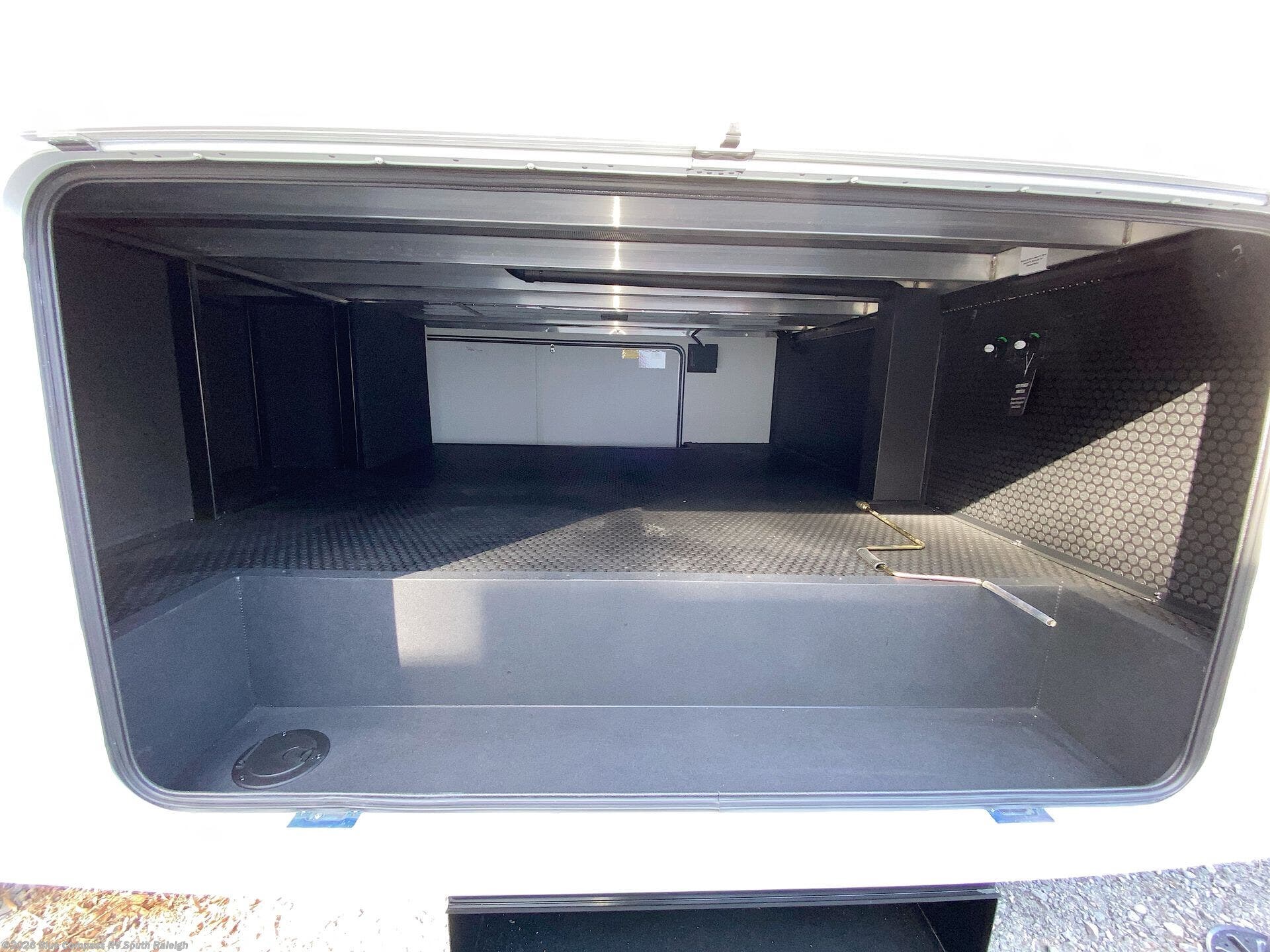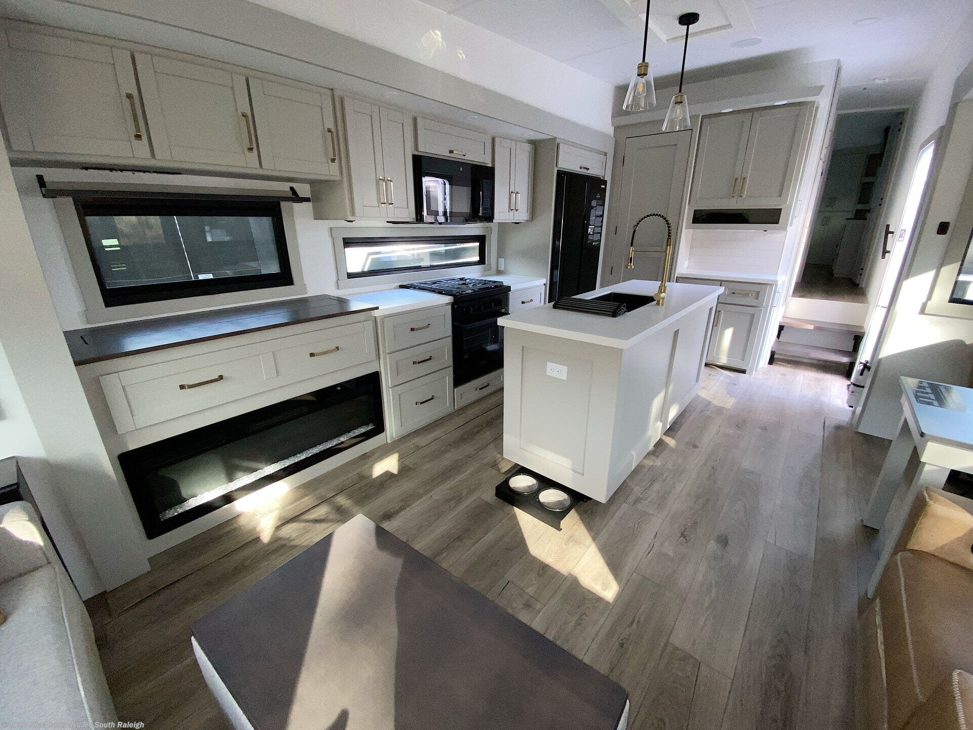 This unit is perfect for weekends at the campground or extended stays! There is ample seating with a sliding desk/dining table, 62" theater seating, and a 72" tri-fold sofa along the rear wall. You can easily relax and enjoy the telescoping TV with a cozy fireplace below. The kitchen offers all that you need to prepare and cook meals just like home with a 16-cu. ft. refrigerator for your perishables, a 30" residential microwave oven, and three burner range top and oven. You will love the kitchen island all outfitted with pull-out pet bowls and double pull-out trash bins with an integrated Stow & Go paper towel holder. There is also an 84" pantry with adjustable shelves for all of your canned and dry goods. Head up the steps to a find a full bath and a private bedroom with a king bed slide all the way up front. A sliding dresser top features hidden storage which is perfect for jewelry and other personal belongings. The front wardrobe features mirrored doors, and the corner closet has been prepped for a stackable washer and dryer if you choose to add that option.