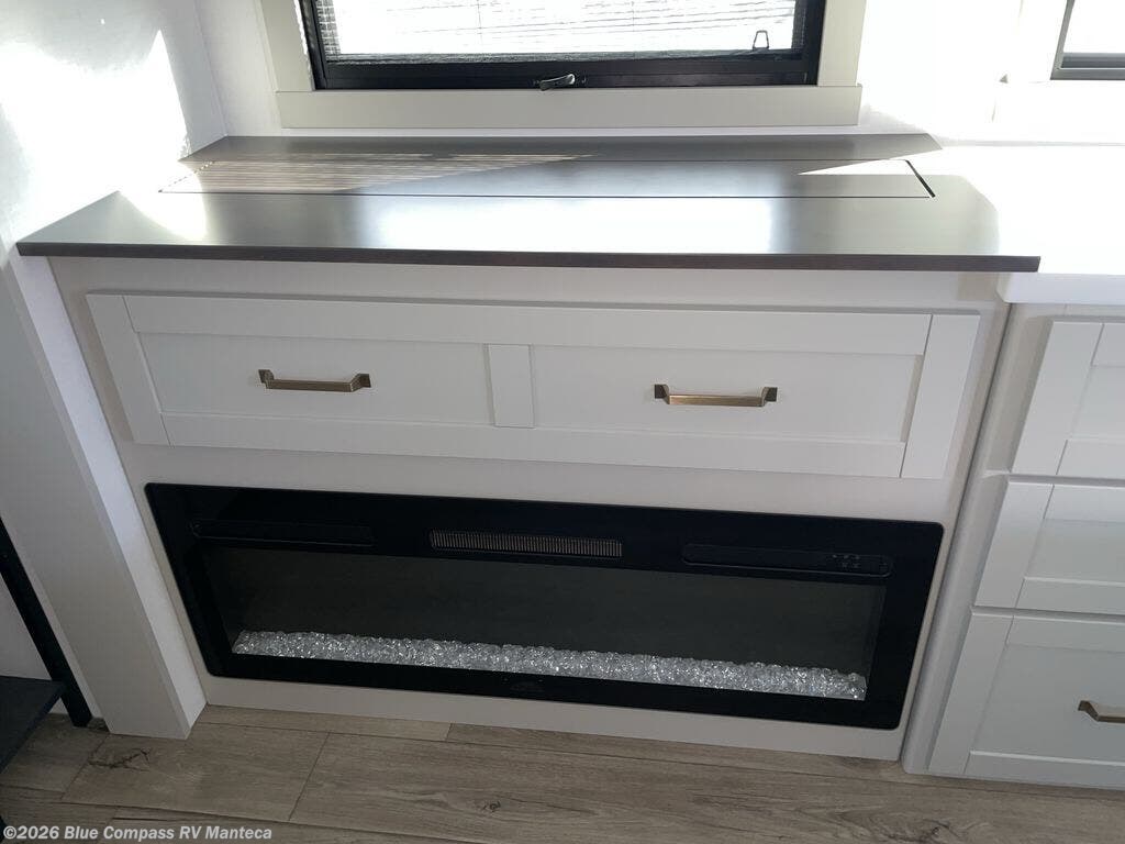 This unit is perfect for weekends at the campground or extended stays! There is ample seating with a sliding desk/dining table, 62" theater seating, and a 72" tri-fold sofa along the rear wall. You can easily relax and enjoy the telescoping TV with a cozy fireplace below. The kitchen offers all that you need to prepare and cook meals just like home with a 16-cu. ft. refrigerator for your perishables, a 30" residential microwave oven, and three burner range top and oven. You will love the kitchen island all outfitted with pull-out pet bowls and double pull-out trash bins with an integrated Stow & Go paper towel holder. There is also an 84" pantry with adjustable shelves for all of your canned and dry goods. Head up the steps to a find a full bath and a private bedroom with a king bed slide all the way up front. A sliding dresser top features hidden storage which is perfect for jewelry and other personal belongings. The front wardrobe features mirrored doors, and the corner closet has been prepped for a stackable washer and dryer if you choose to add that option.