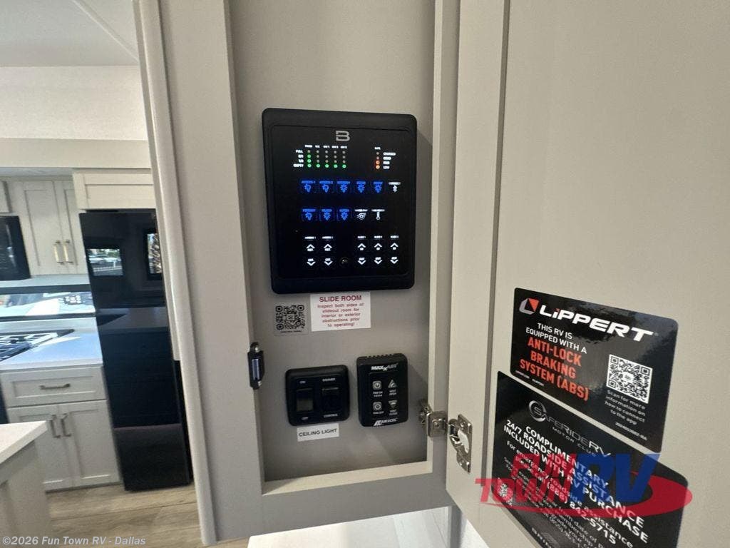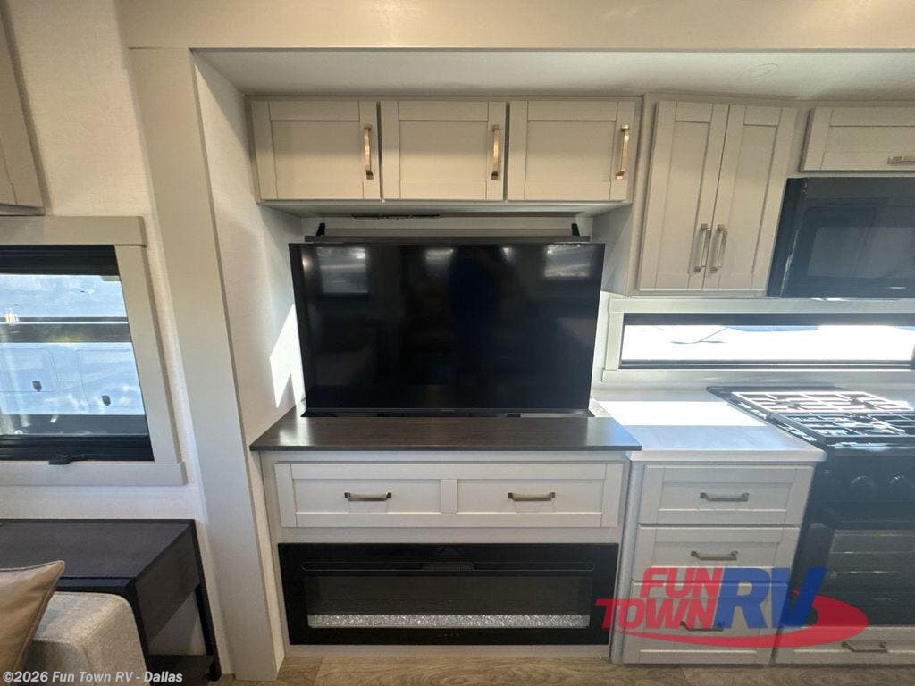 This unit is perfect for weekends at the campground or extended stays! There is ample seating with a sliding desk/dining table, 62" theater seating, and a 72" tri-fold sofa along the rear wall. You can easily relax and enjoy the telescoping TV with a cozy fireplace below. The kitchen offers all that you need to prepare and cook meals just like home with a 16-cu. ft. refrigerator for your perishables, a 30" residential microwave oven, and three burner range top and oven. You will love the kitchen island all outfitted with pull-out pet bowls and double pull-out trash bins with an integrated Stow & Go paper towel holder. There is also an 84" pantry with adjustable shelves for all of your canned and dry goods. Head up the steps to a find a full bath and a private bedroom with a king bed slide all the way up front. A sliding dresser top features hidden storage which is perfect for jewelry and other personal belongings. The front wardrobe features mirrored doors, and the corner closet has been prepped for a stackable washer and dryer if you choose to add that option.