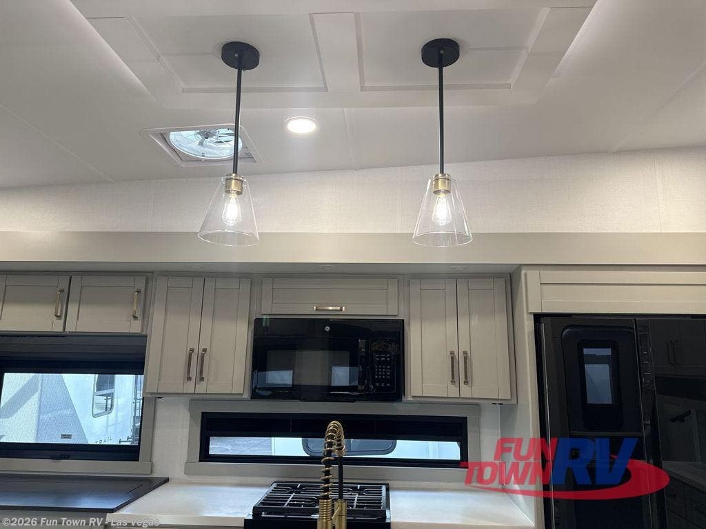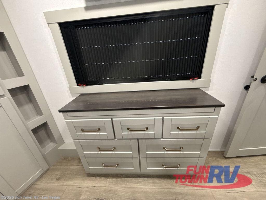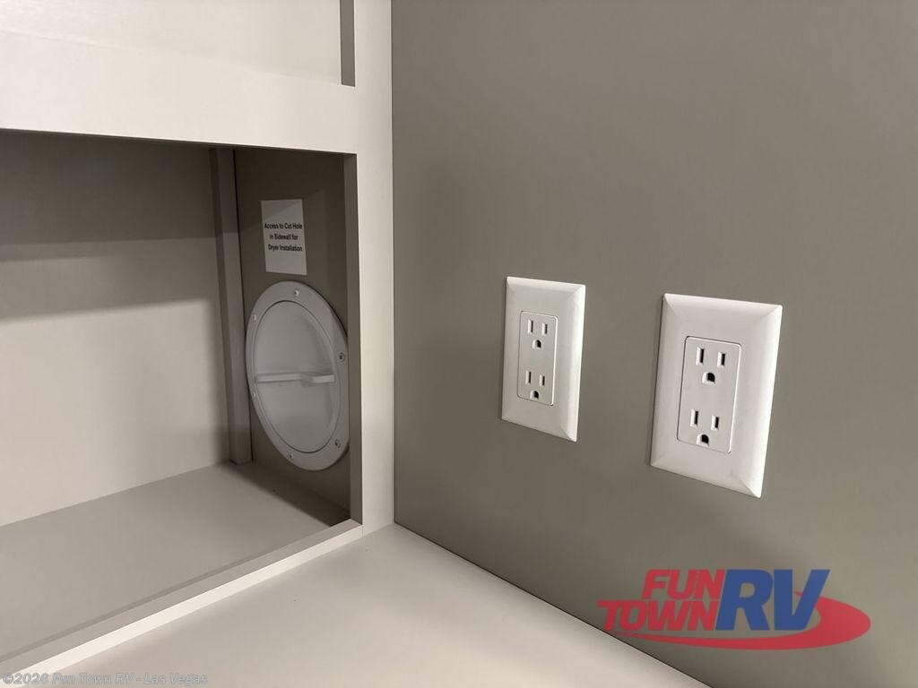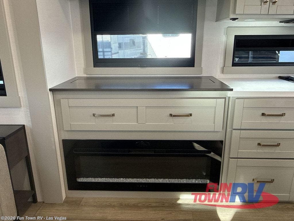 This unit is perfect for weekends at the campground or extended stays! There is ample seating with a sliding desk/dining table, 62" theater seating, and a 72" tri-fold sofa along the rear wall. You can easily relax and enjoy the telescoping TV with a cozy fireplace below. The kitchen offers all that you need to prepare and cook meals just like home with a 16-cu. ft. refrigerator for your perishables, a 30" residential microwave oven, and three burner range top and oven. You will love the kitchen island all outfitted with pull-out pet bowls and double pull-out trash bins with an integrated Stow & Go paper towel holder. There is also an 84" pantry with adjustable shelves for all of your canned and dry goods. Head up the steps to a find a full bath and a private bedroom with a king bed slide all the way up front. A sliding dresser top features hidden storage which is perfect for jewelry and other personal belongings. The front wardrobe features mirrored doors, and the corner closet has been prepped for a stackable washer and dryer if you choose to add that option.