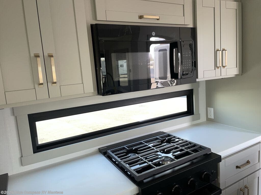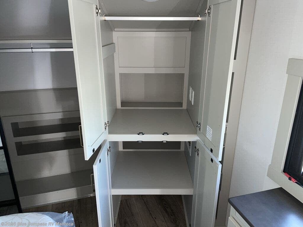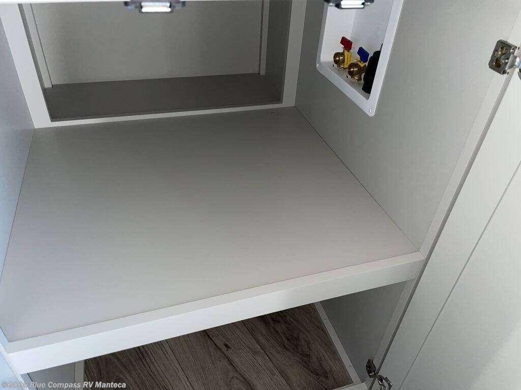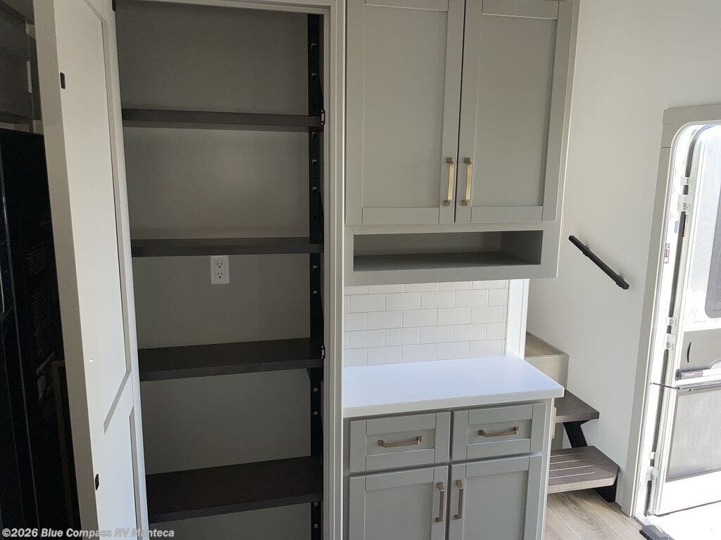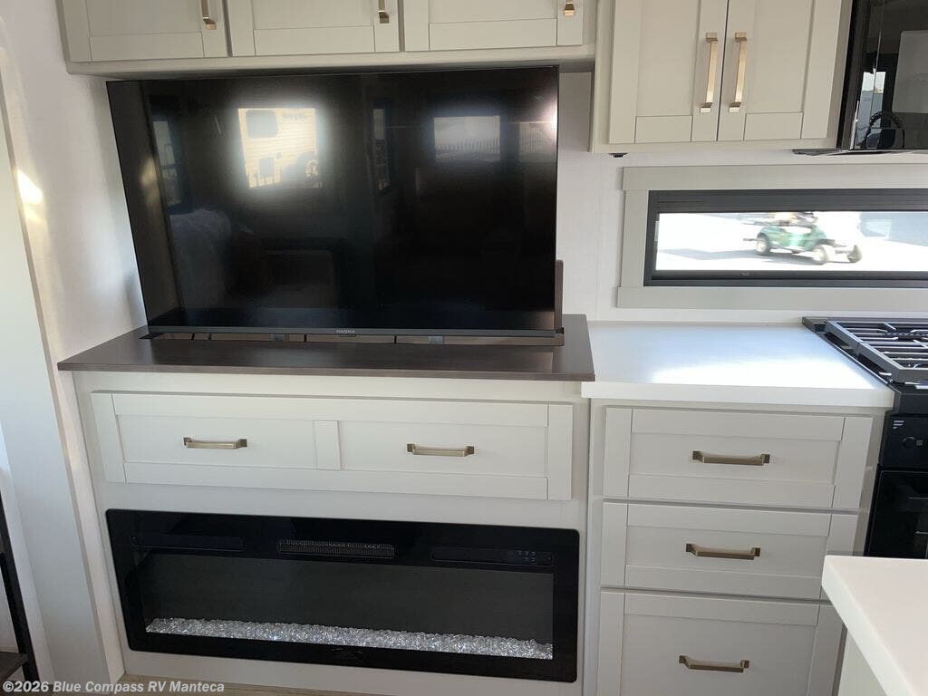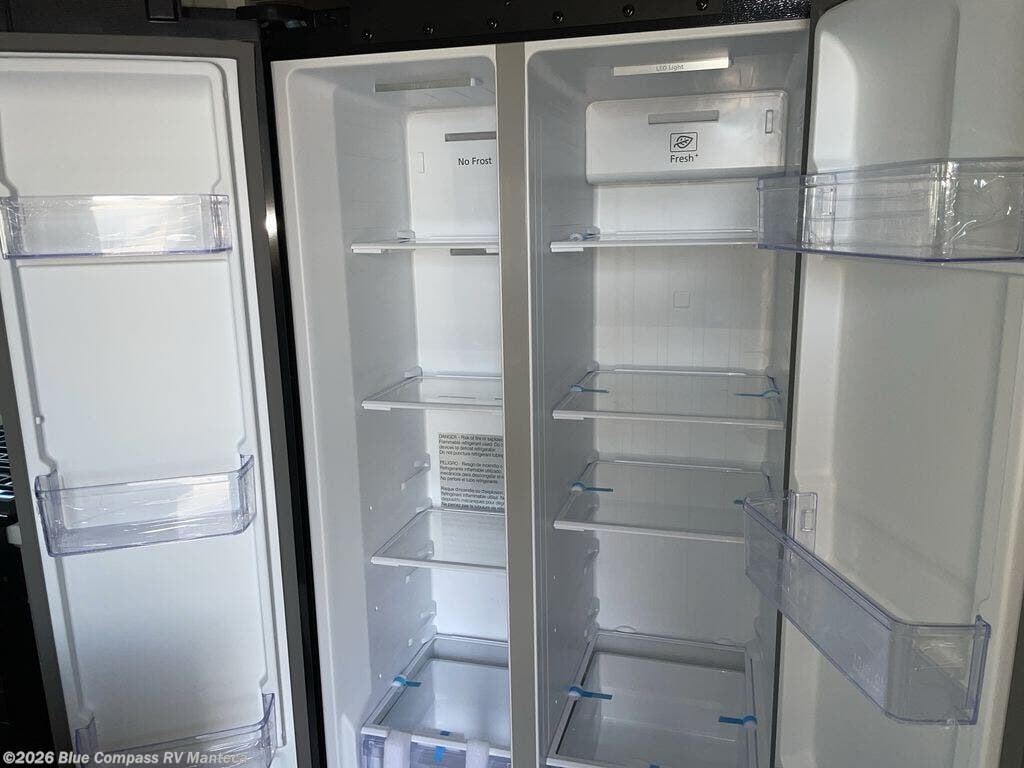 This unit is perfect for weekends at the campground or extended stays! There is ample seating with a sliding desk/dining table, 62" theater seating, and a 72" tri-fold sofa along the rear wall. You can easily relax and enjoy the telescoping TV with a cozy fireplace below. The kitchen offers all that you need to prepare and cook meals just like home with a 16-cu. ft. refrigerator for your perishables, a 30" residential microwave oven, and three burner range top and oven. You will love the kitchen island all outfitted with pull-out pet bowls and double pull-out trash bins with an integrated Stow & Go paper towel holder. There is also an 84" pantry with adjustable shelves for all of your canned and dry goods. Head up the steps to a find a full bath and a private bedroom with a king bed slide all the way up front. A sliding dresser top features hidden storage which is perfect for jewelry and other personal belongings. The front wardrobe features mirrored doors, and the corner closet has been prepped for a stackable washer and dryer if you choose to add that option.